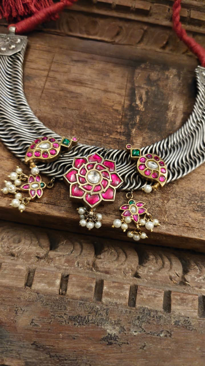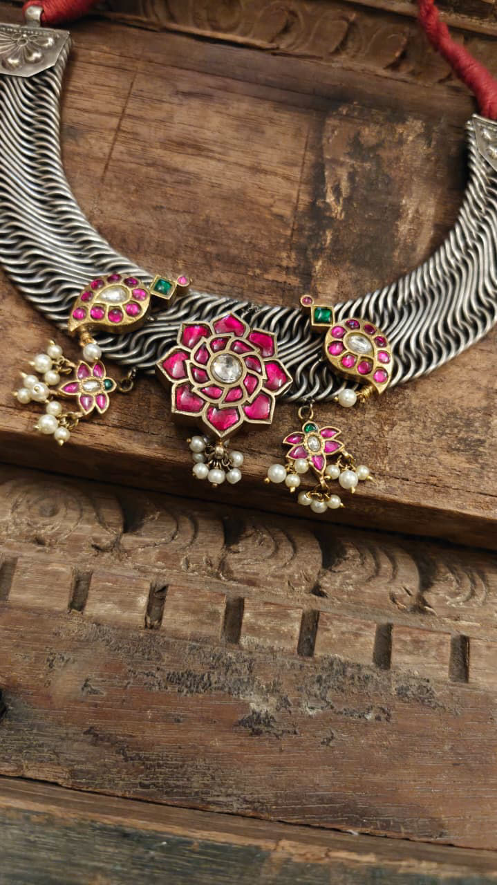 Vintage silver, adorned with pendants in kemp stone and a whisper of pearls. A timeless piece that carries the charm of heritage with the finesse of handcraft. Handcrafted in 92.5 silver at Svasa. 📦 Ships within India. Please Note: ✨ As each jewellery piece is crafted with care, we’re unable to offer exchanges or returns. ✨ If your order reaches you with any damage, please record an unboxing video and share it with us. We’ll be happy to make things right for you.