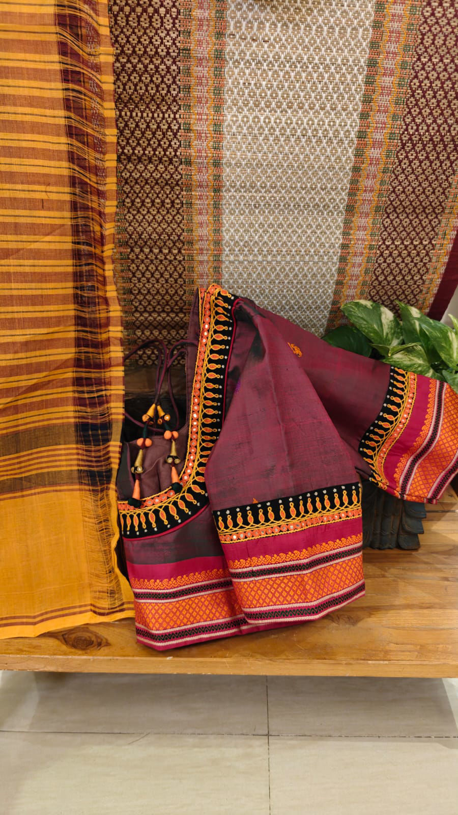 A stunning double-shaded Kanjivaram in a rich brown–red mix, brought alive with delicate petal borders embroidered in tones of yellow around the neck. 🌿🪡 A creation from Ahalya by Svasa, where timeless weaves meet intricate handwork. 💛