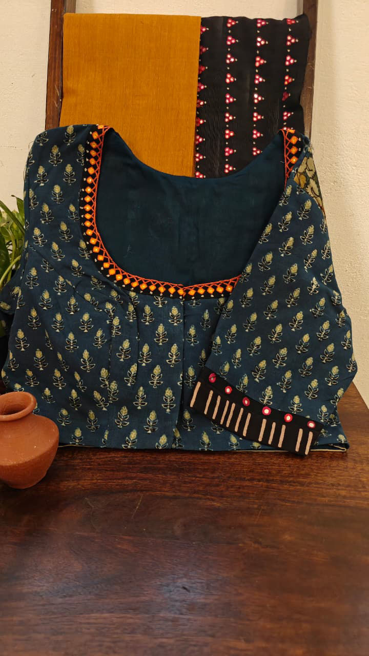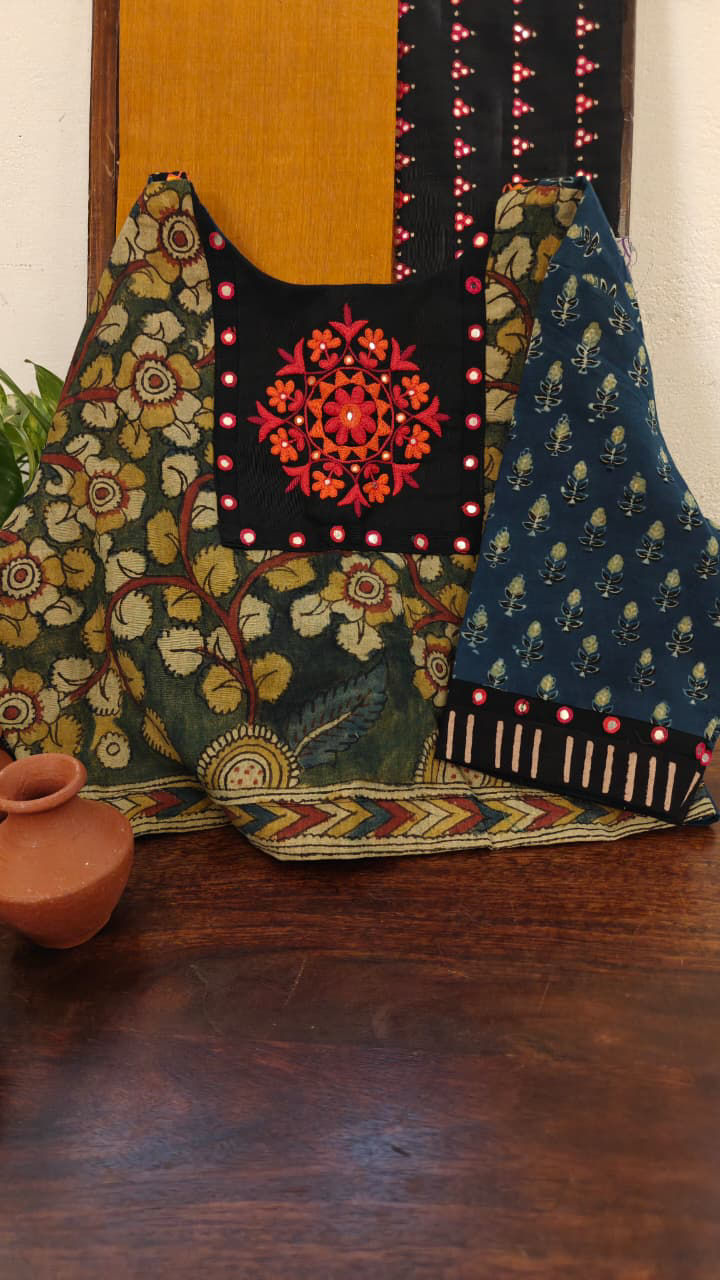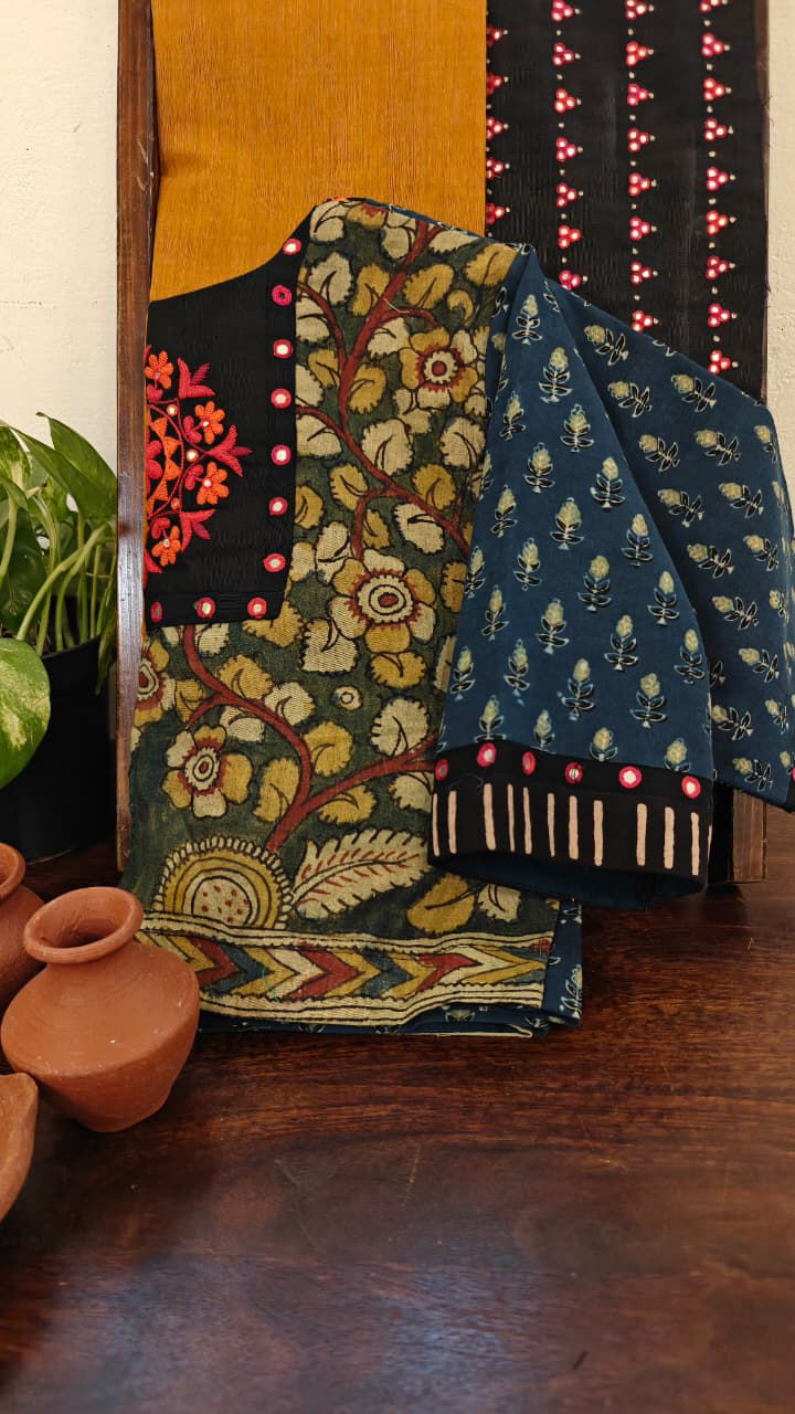 Kalamkari in serene jade, brought to life with Annams and our signature motif — boldly embroidered in orange for a striking contrast. The blouse is fused with indigo, creating a timeless blend of heritage hues and handcrafted artistry.