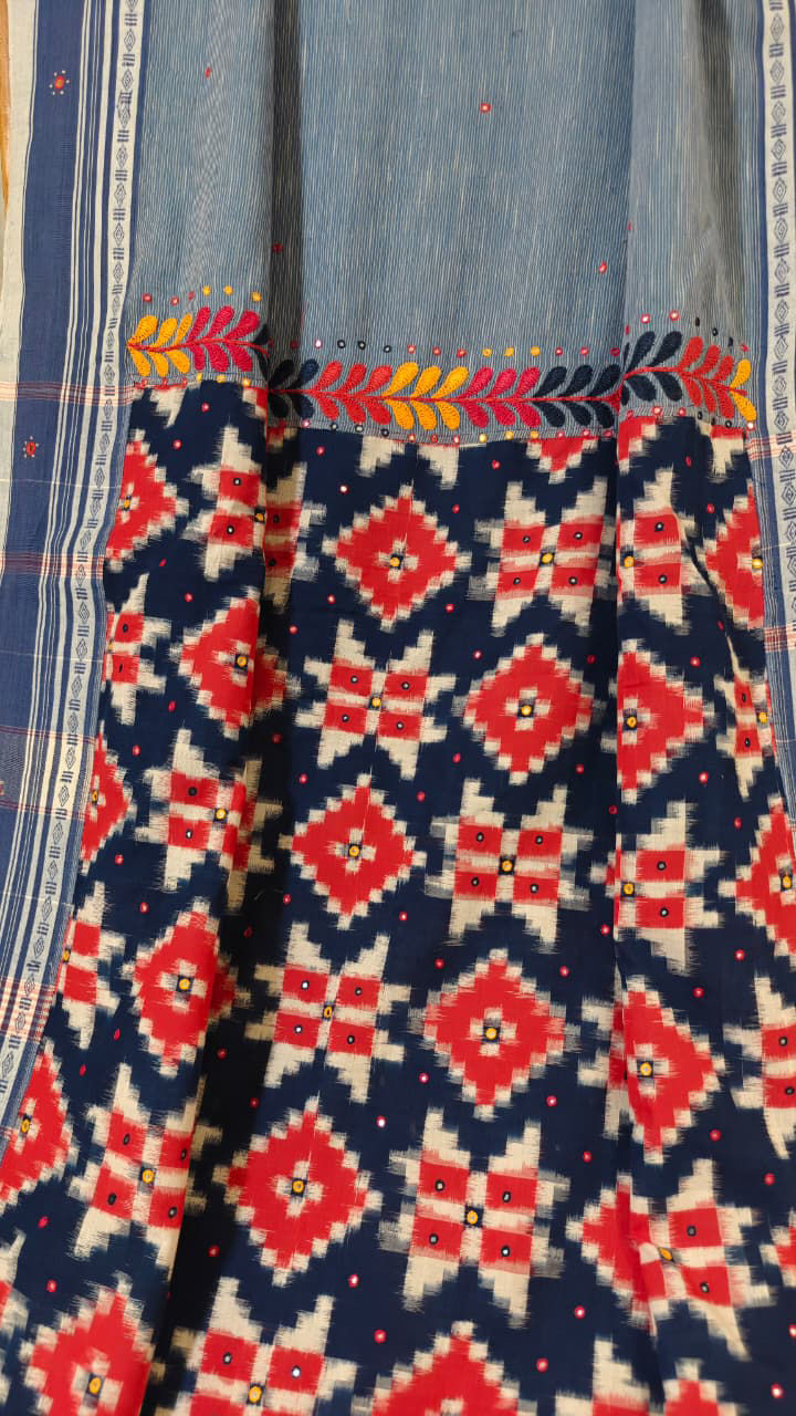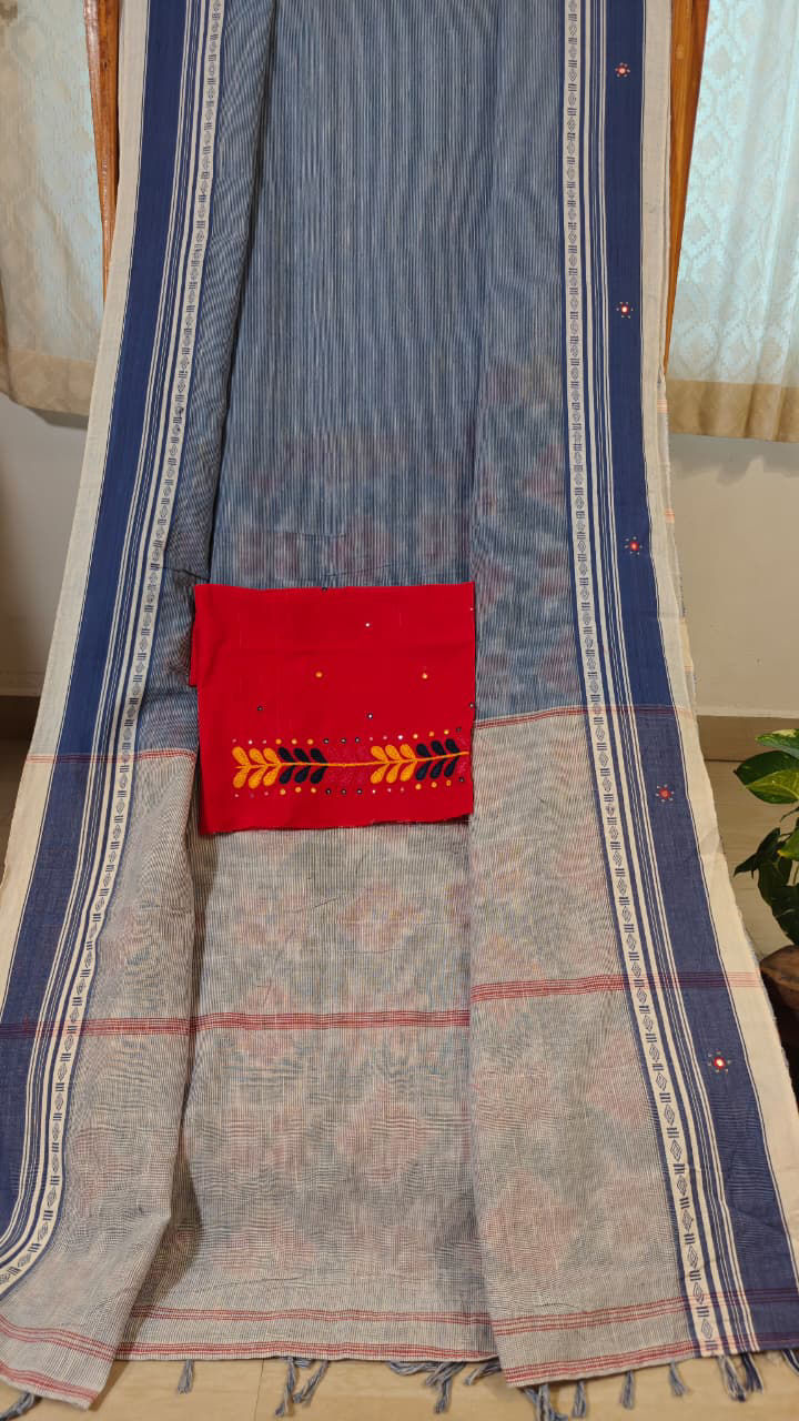 From the looms of Karnataka, an Anne Hejje light blue saree meets the depth of blue and red Telia Rumal. Embroidered with a vibrant border, this Svasa creation celebrates heritage weaves in a contemporary spirit. 🌿