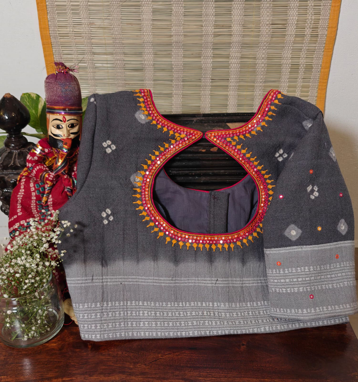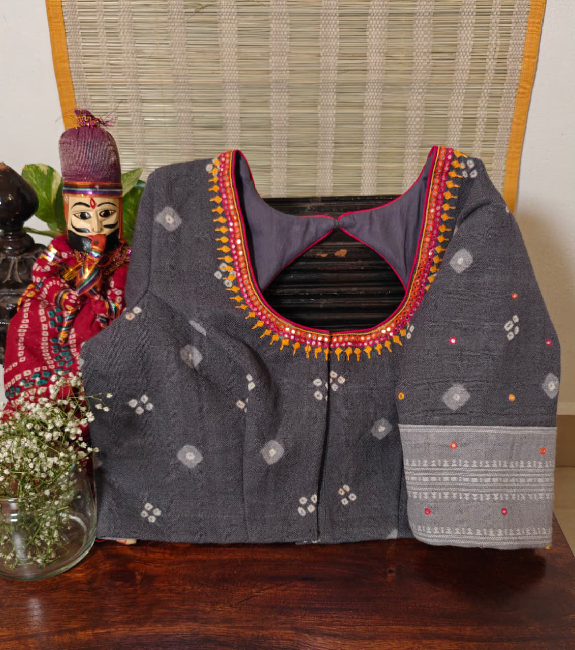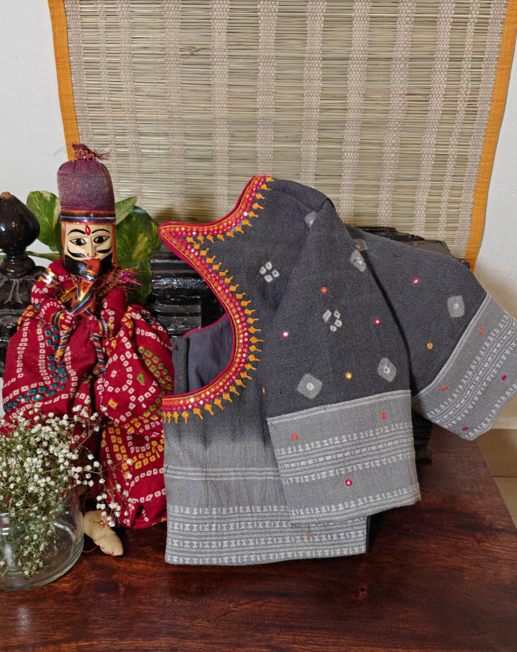 In soft shades of grey, this cotton Bandhani blouse features a drop neck studded with mirrors — festive, radiant, and full of heritage charm. ✨
