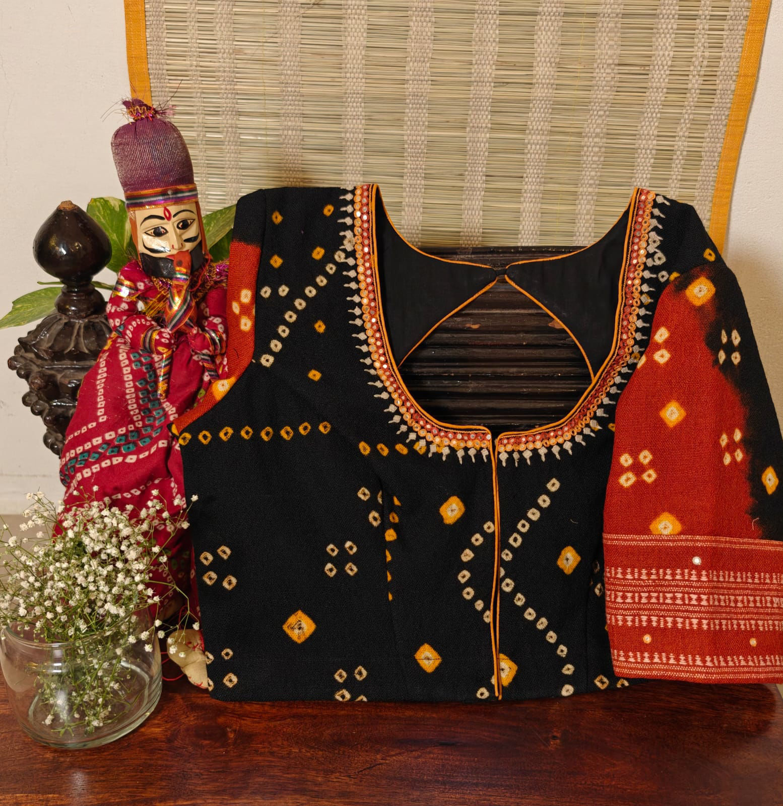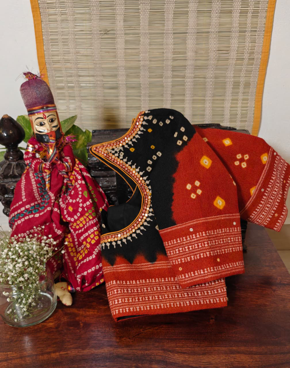 In black and bright red, this cotton Bandhani blouse features a drop neck studded with mirrors — festive, radiant, and full of heritage charm. ✨
