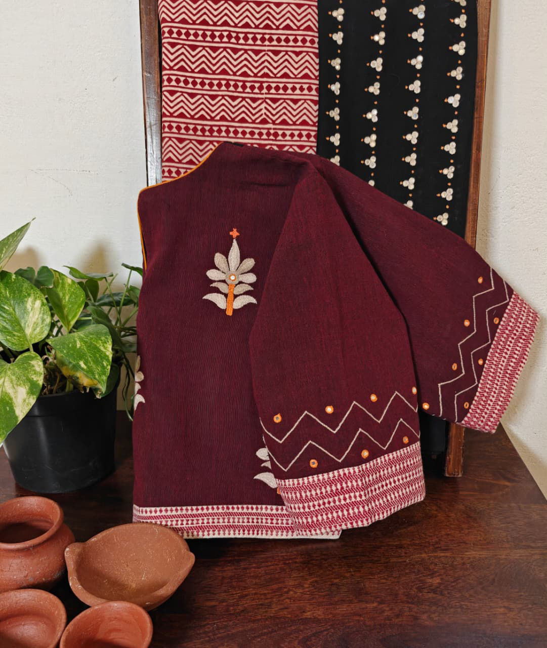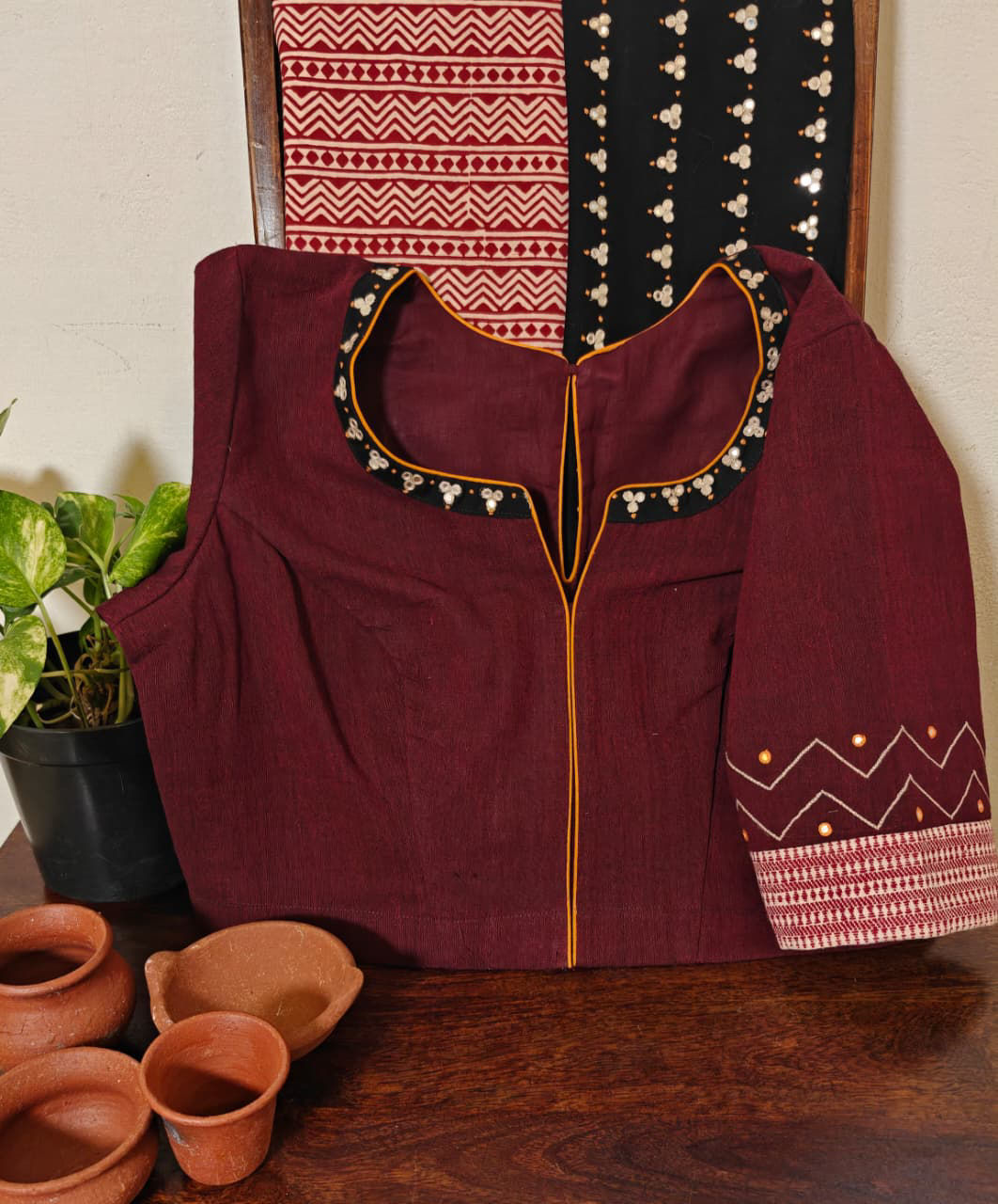 Our artisans creatively hand embroider, hand paint and hand print the blouses that come to you from the design house of SVASA. We use hand woven fabric extensively. You may notice very minute, almost insignificant flaws in the crafts since they are all handmade. We urge our patrons to overlook a few human errors that may have occurred in the process. Our aspirations are towards an empowered society, focusing on keeping traditional needlecraft alive for a long time to come.