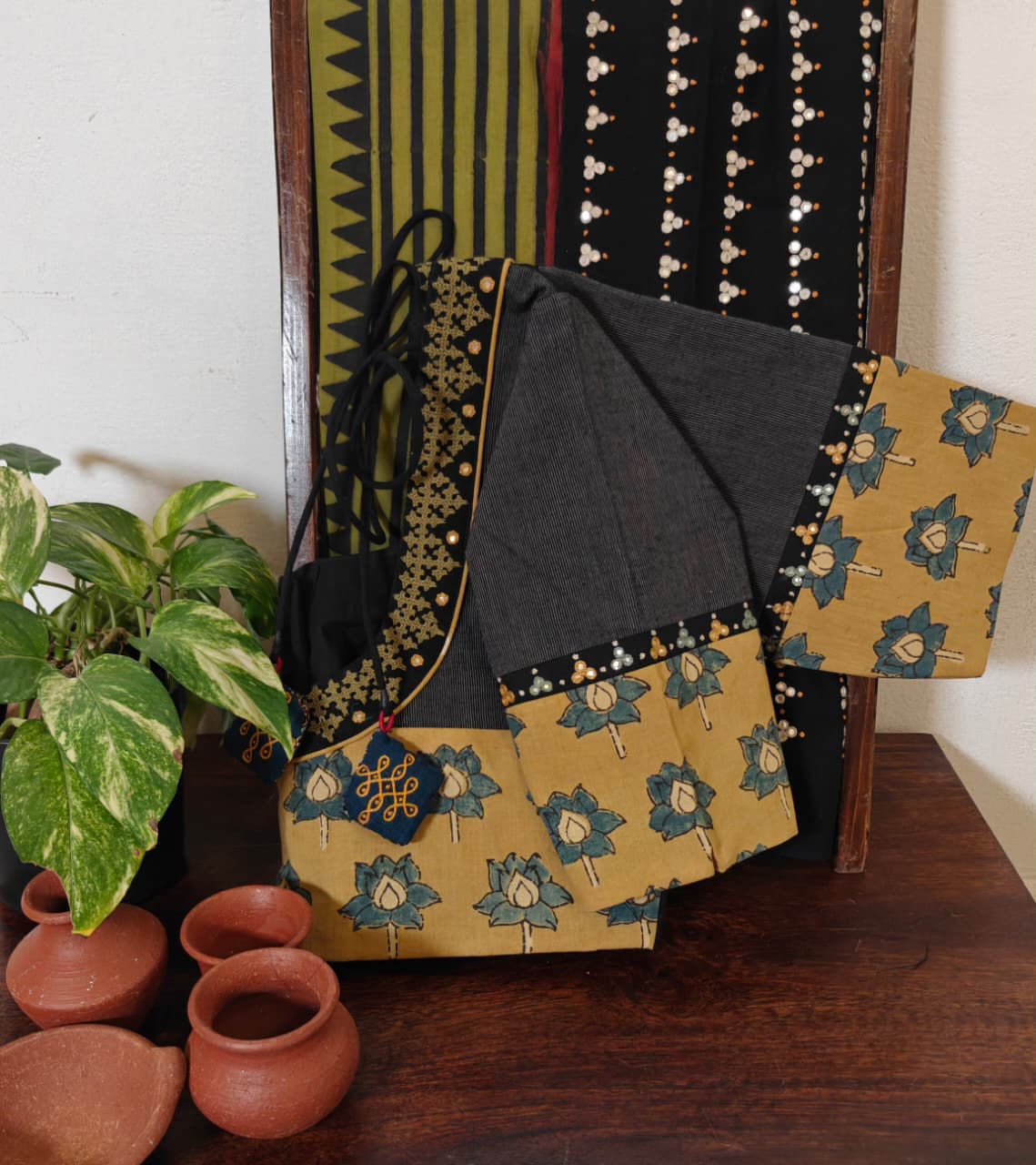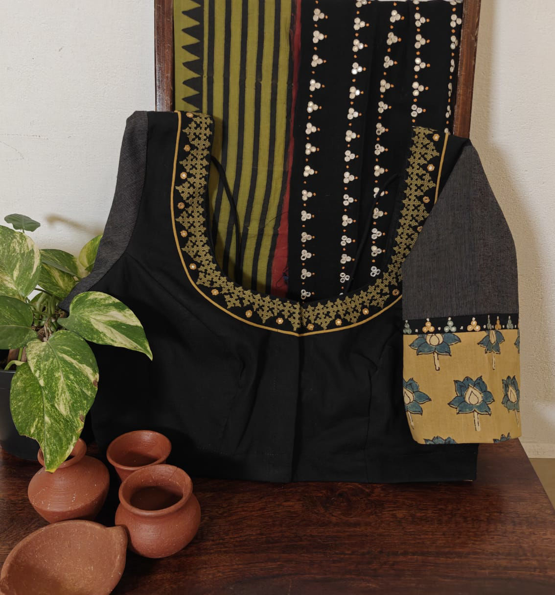 Grey stripes fused with block-printed Ajrakh in fenugreek and indigo. Finished with thick, rustic Kutchi embroidery in moss green — earthy, bold, and beautifully Svasa. 🌾