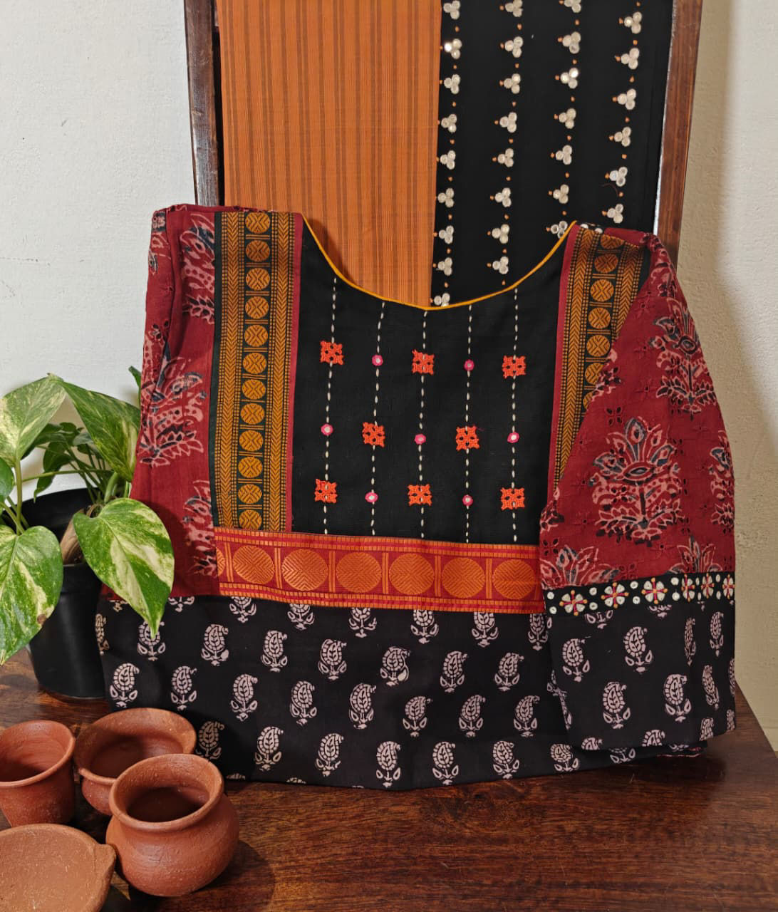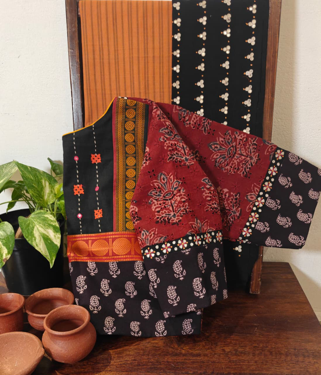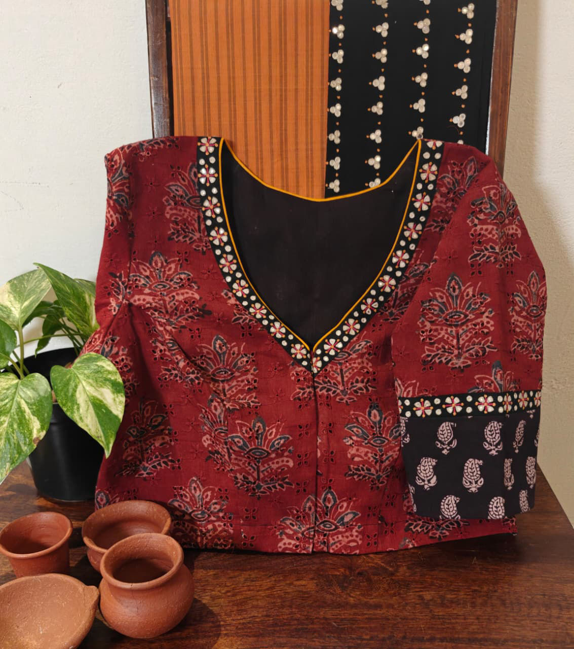 Hand-printed blocks meet delicate embroidery in tack stitches, highlighted with kutchi motifs. A cotton blouse that carries the essence of handmade craft and timeless tradition. ✨🪡