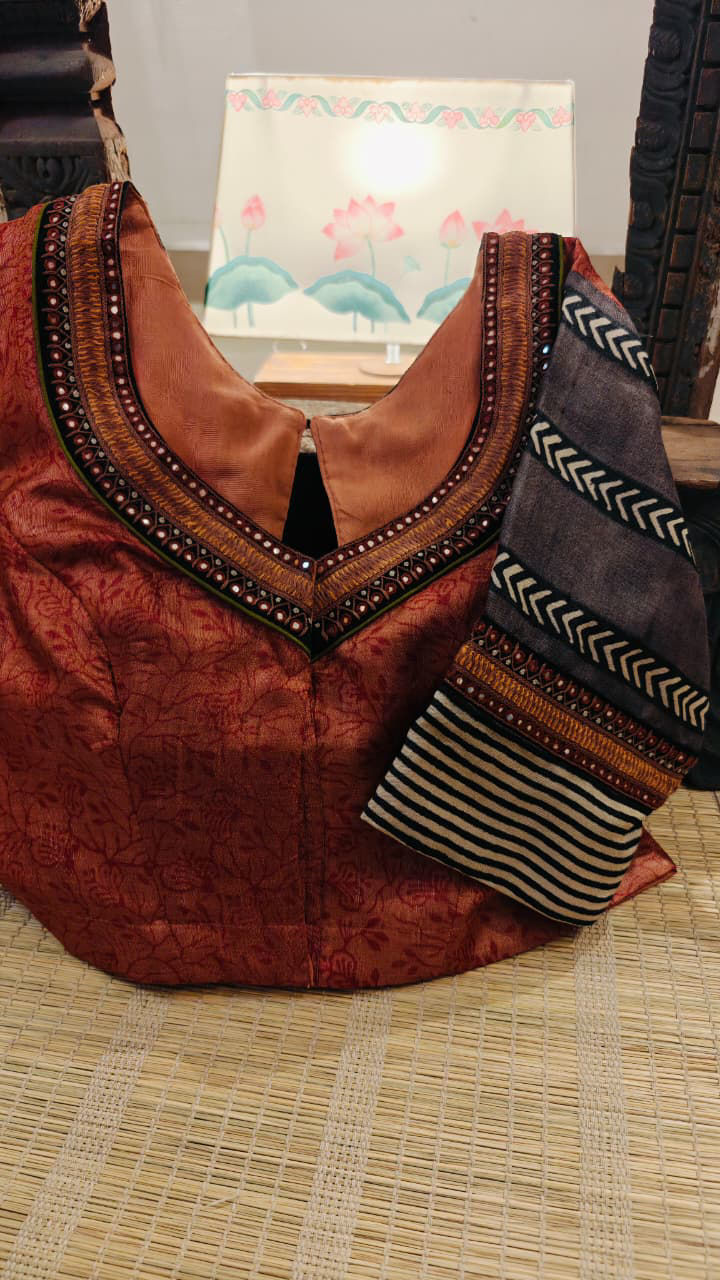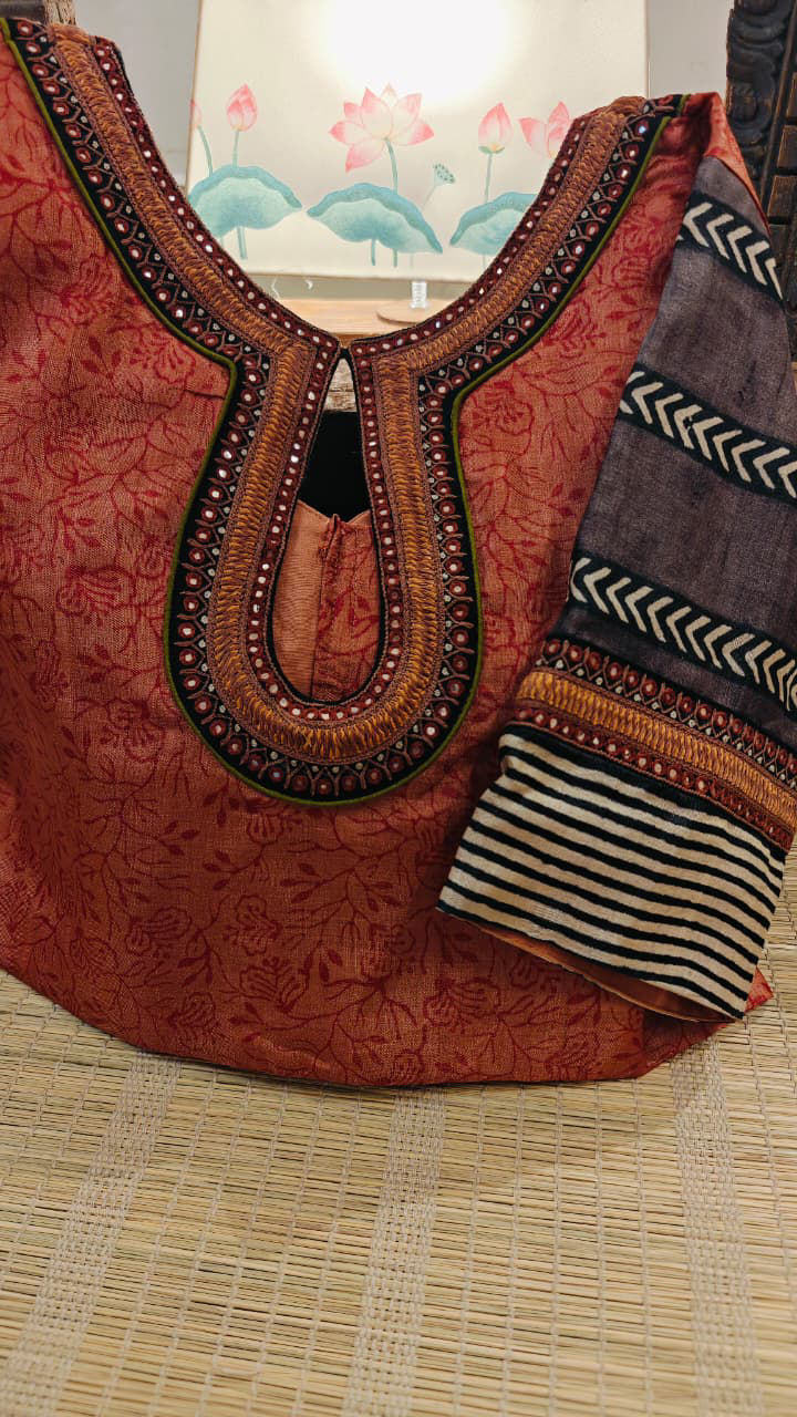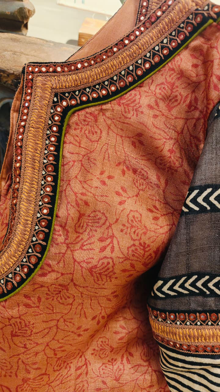 Vintage embroidery in antique shades of rust, paired with ochre mirrors on brick-coloured tussar silk. Hand block printed in geometric borders β€” an ode to timeless craft and earthy charm. 🌿πŸͺ‘