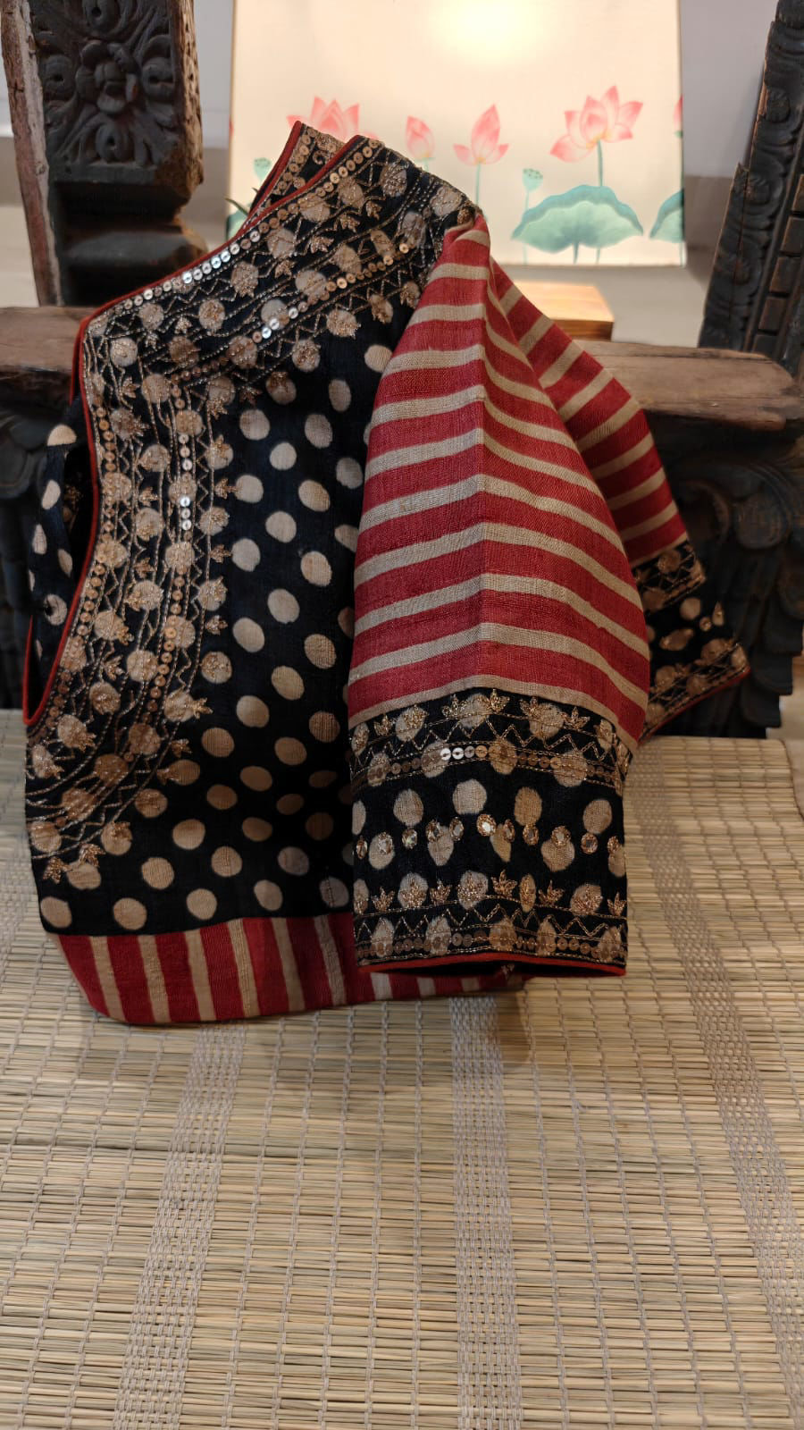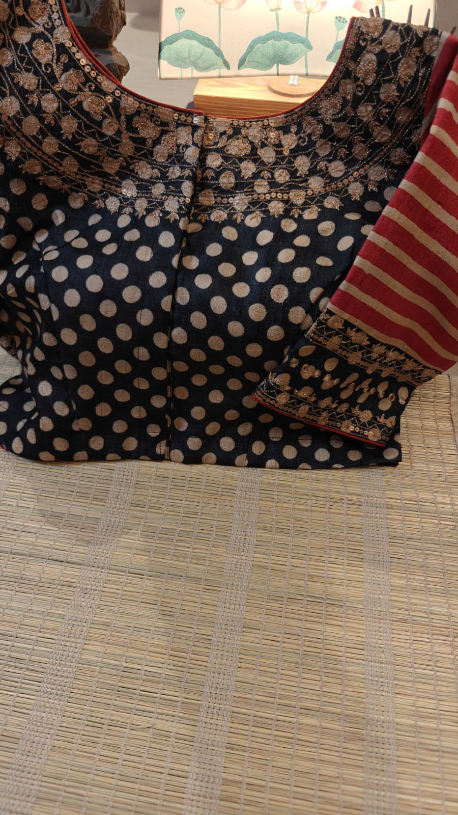 Pure tussar silk in shades of charcoal and rust — timeless and rich. Adorned with our exquisite vintage beaten gold embroidery, and playful polka dots that never go out of style. 🪡 Classic. Handcrafted. Svasa.