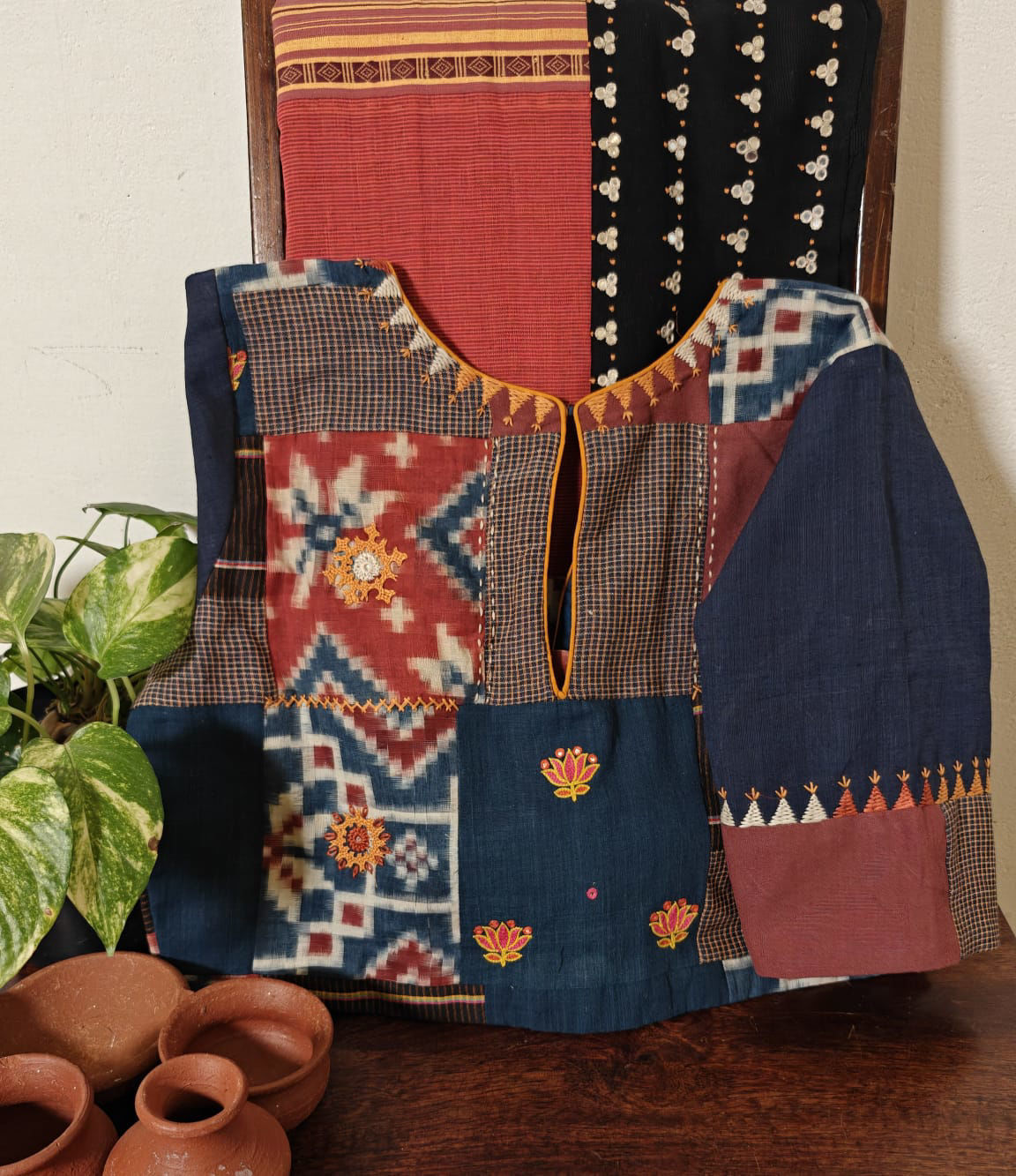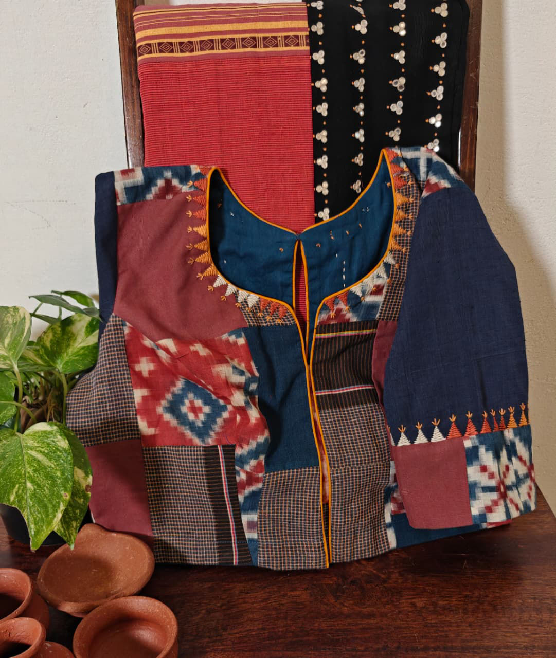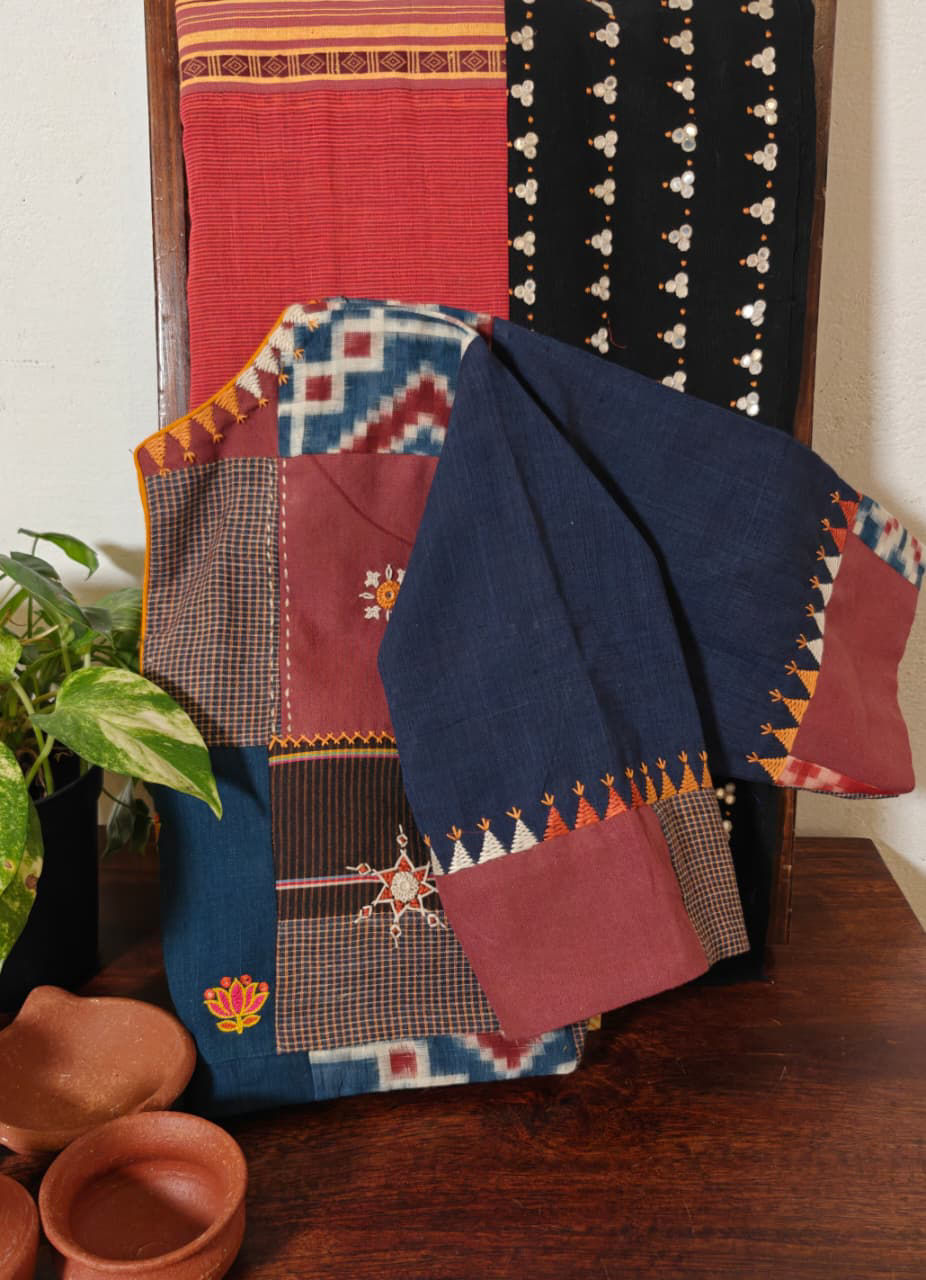 Pieces of eco-dyed ikkat fused together, bringing alive a sustainable craft rooted in revival and heritage. Handmade at Svasa. 🪡🌿