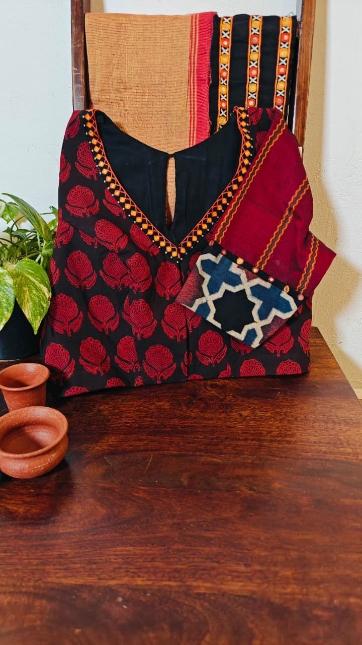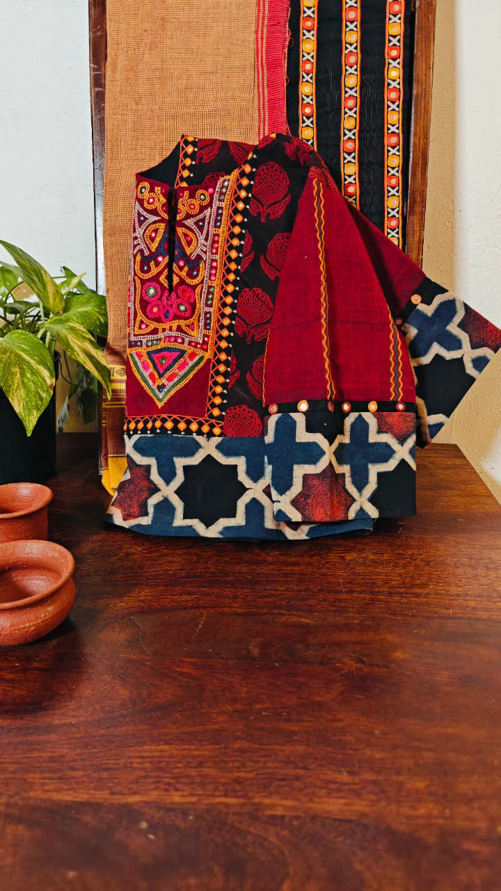 Hand block-printed Ajrakh meets a tribal embroidered yoke, with hints of red block prints — a fusion of rustic weaves that celebrates heritage and artistry. 🪡❤️