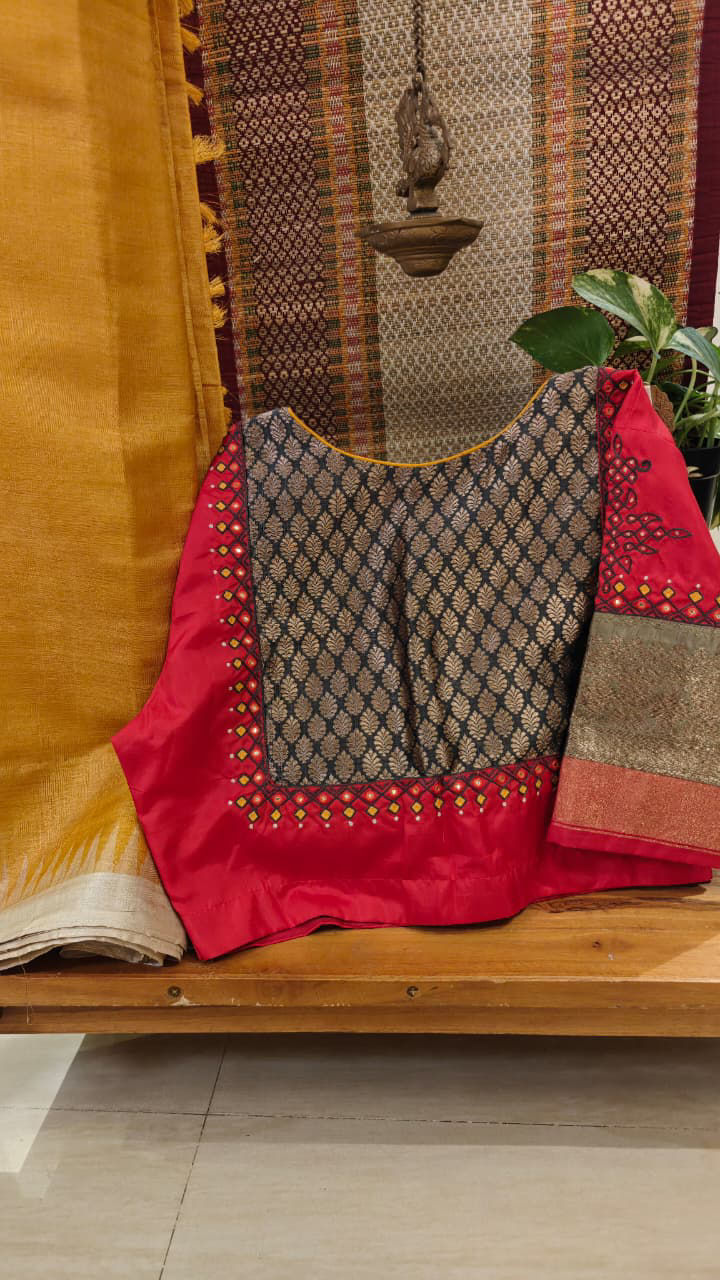 A stunning red Kanjivaram blouse brought to life with a yoke in pure grey brocade — elevated with embroidered geometric borders that frame it just right. Classic meets contemporary in every stitch. ❤🩶🪡