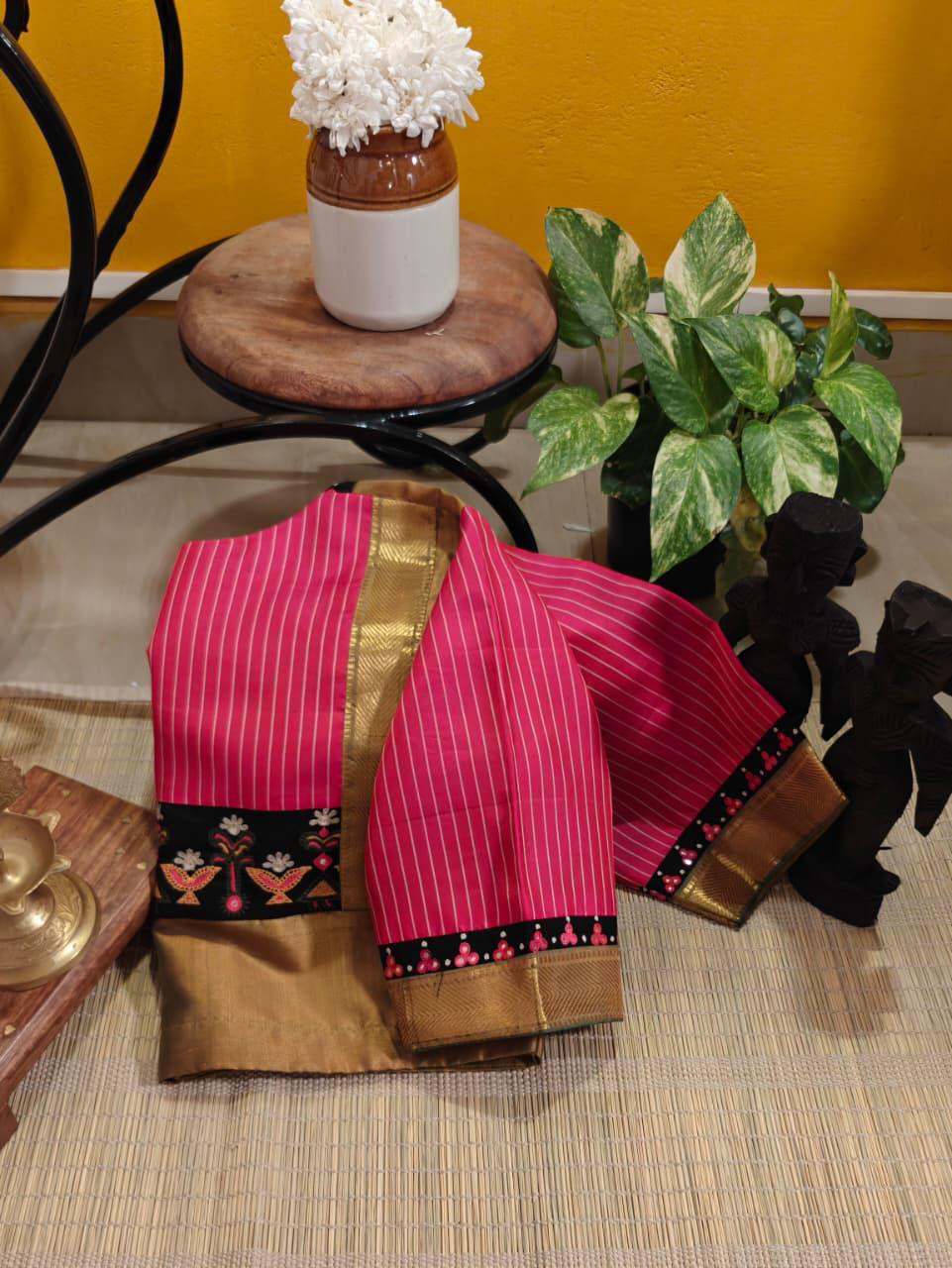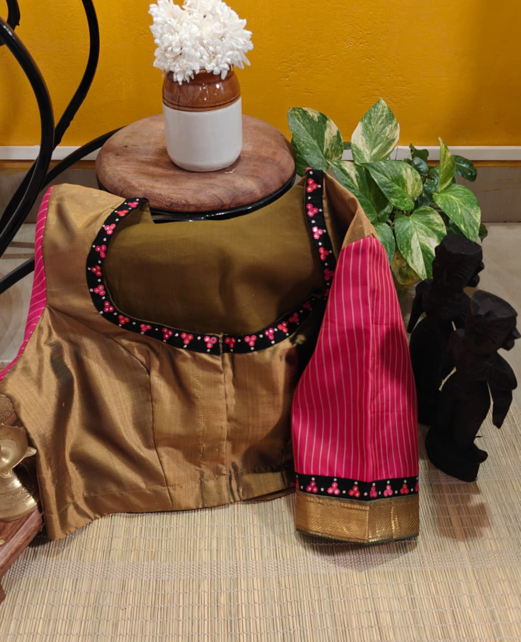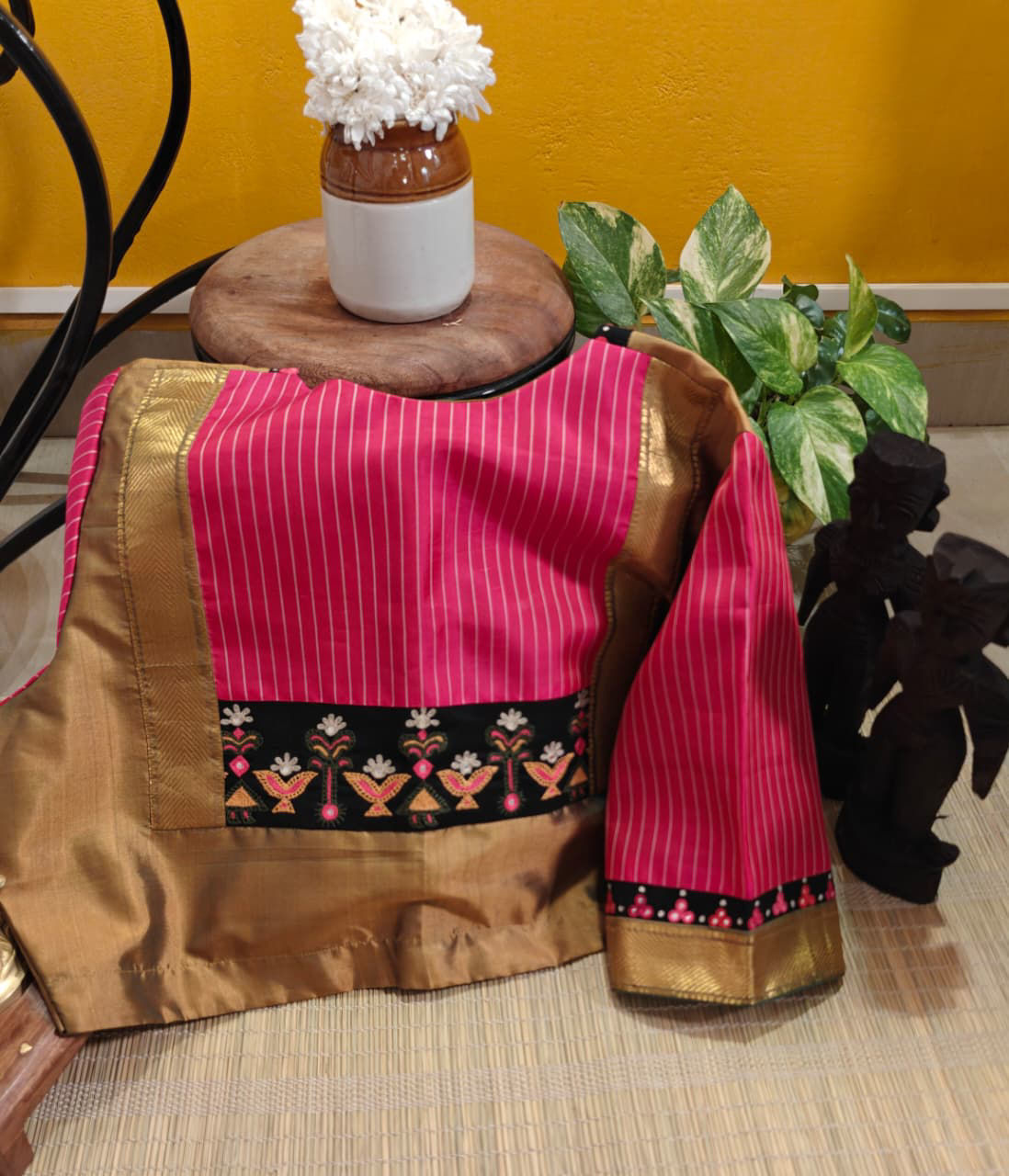 A honey and pink pure Kanjivaram, brought to life with tribal borders embroidered in bold detail. An unusual mix of tradition and artistry — a blouse that speaks stories in every stitch ✨🌿