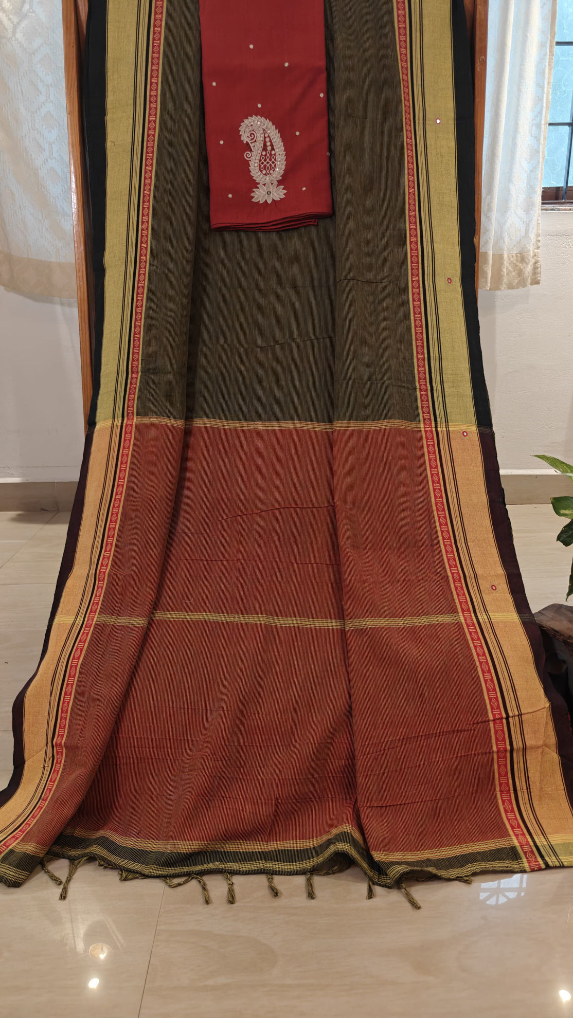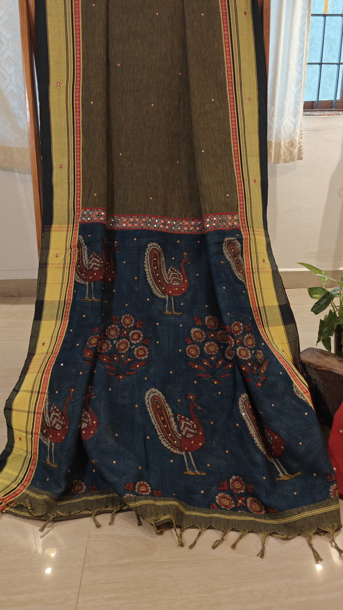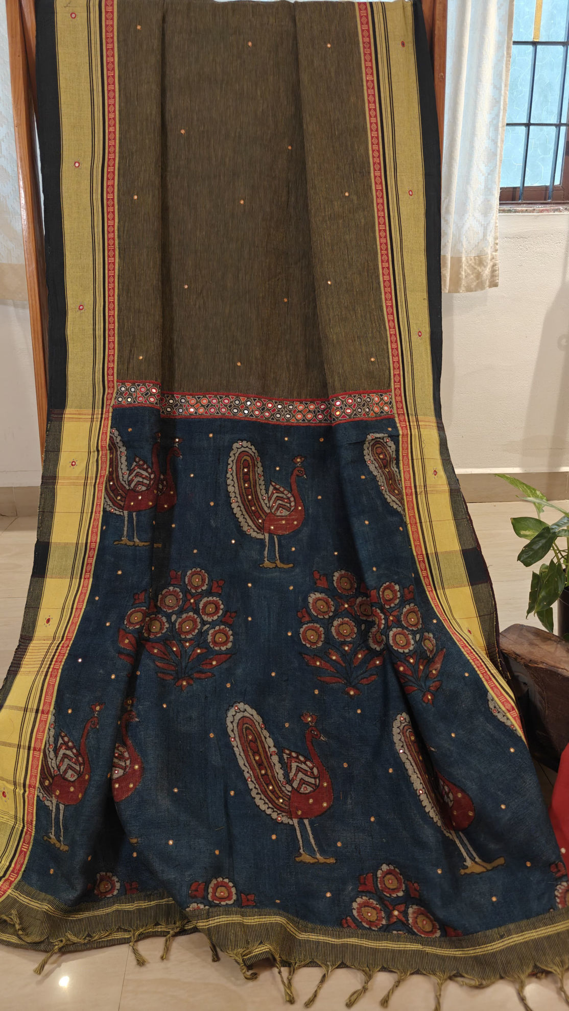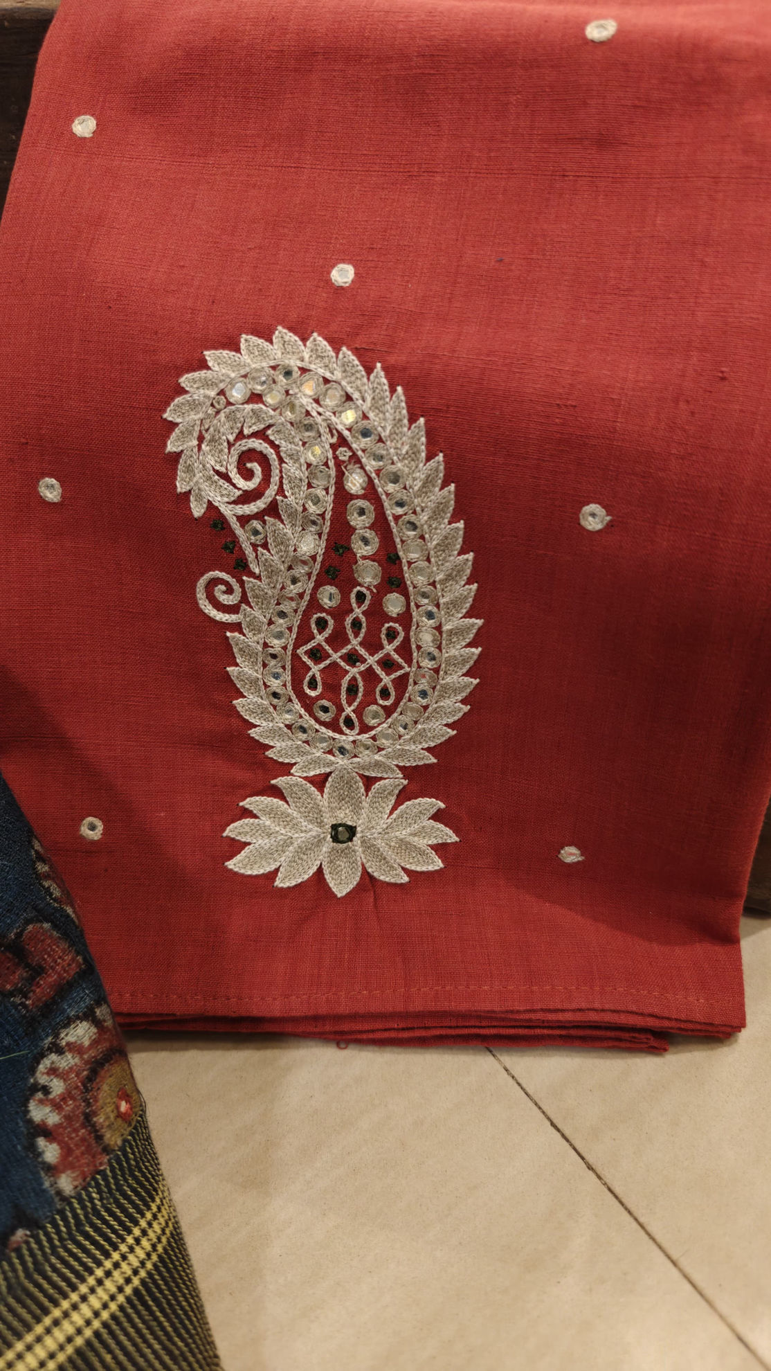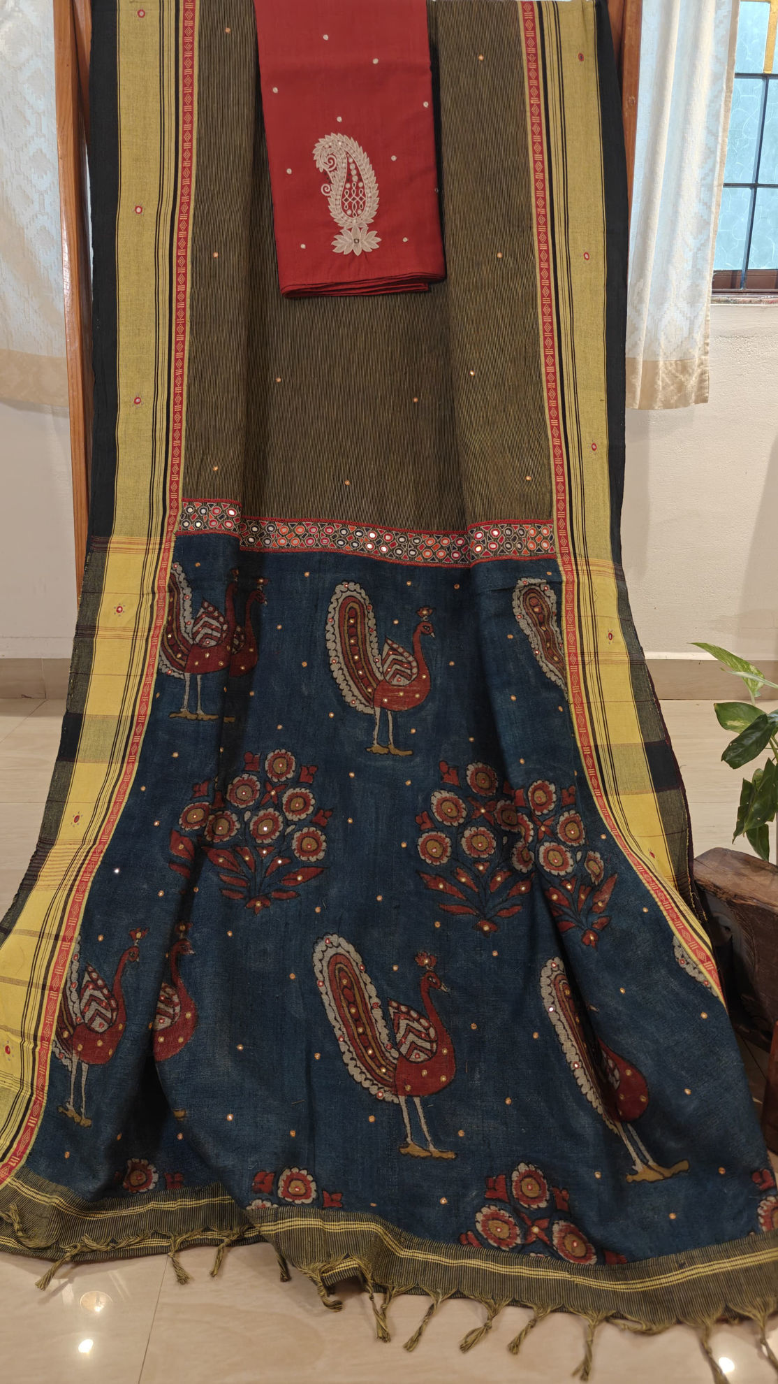 An Anne Hejje classic — intense indigo blue handmade, echo-dyed kalamkari, bordered with mirrors that catch the light in every move. Paired with a madder red blouse, adorned with an ivory paisley — a timeless pairing of craft, colour, and character. ✨
