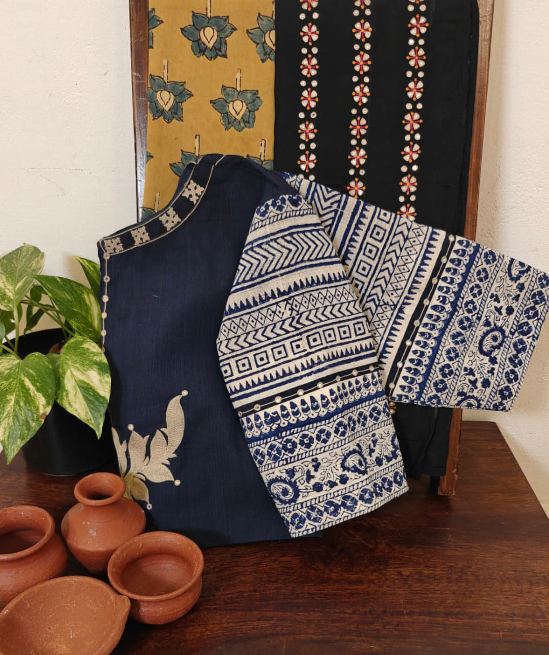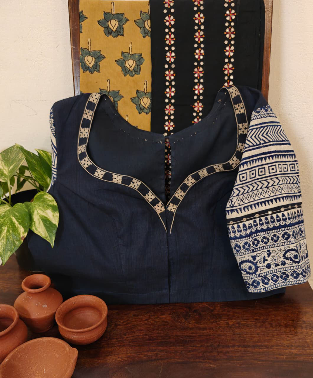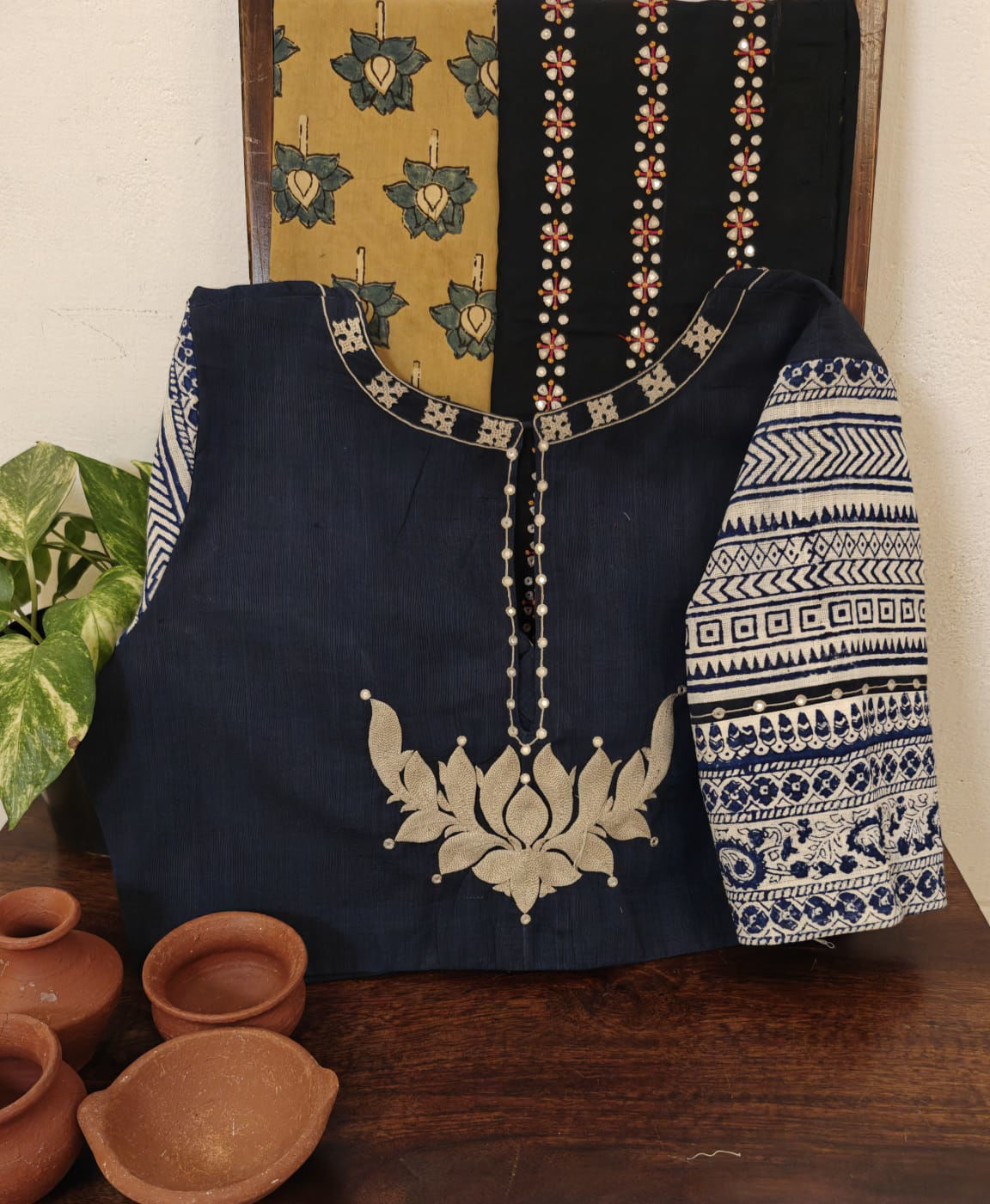Hand block printed in deep indigo, this blouse carries a bold lotus motif embroidered at the back — surrounded by Kutchi embroidery around the neck. A blend of craft and character, created with care at Svasa. 🌿