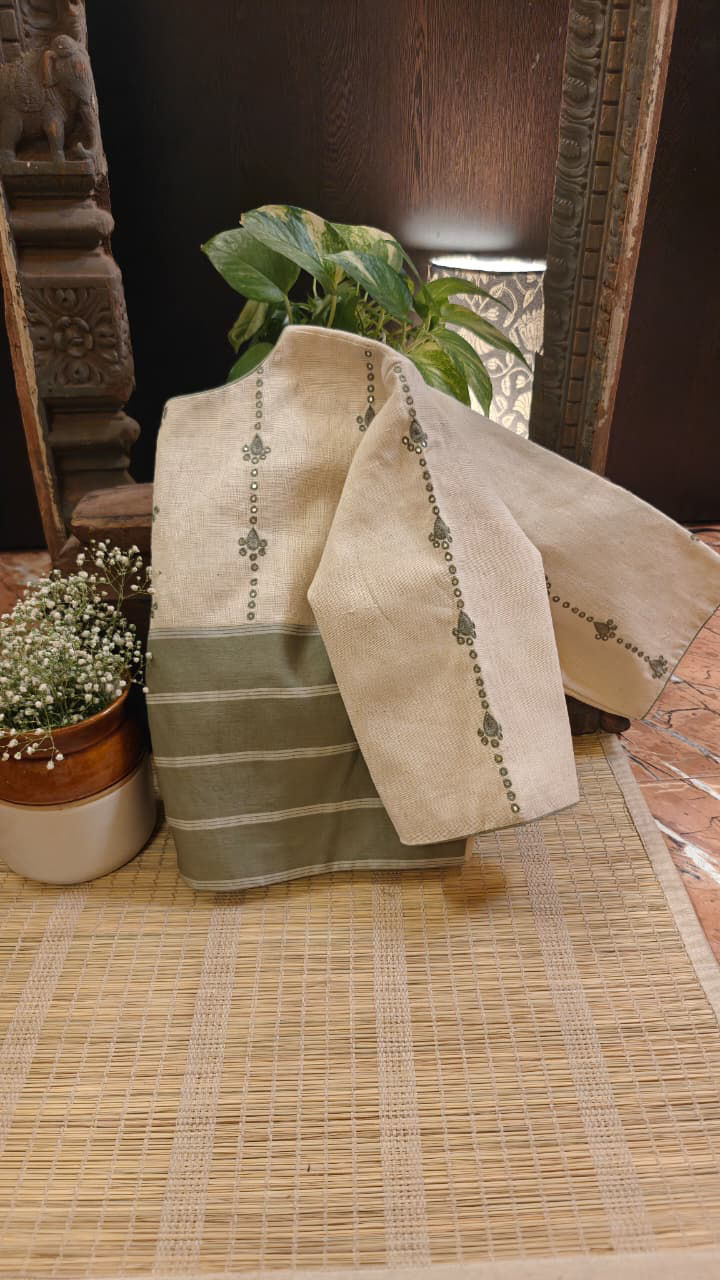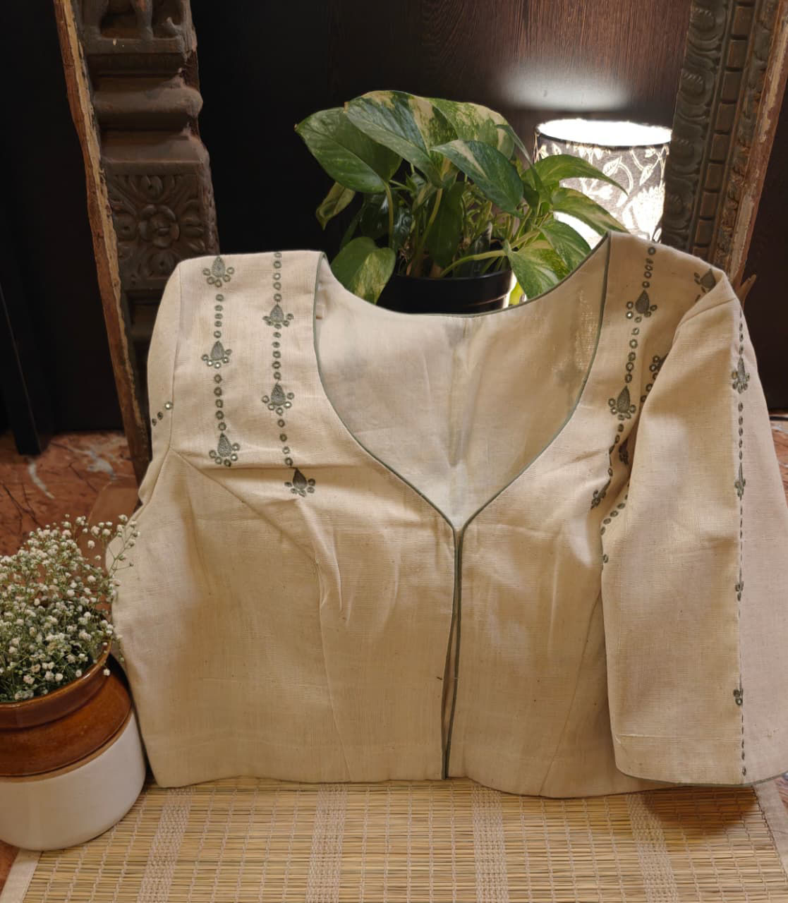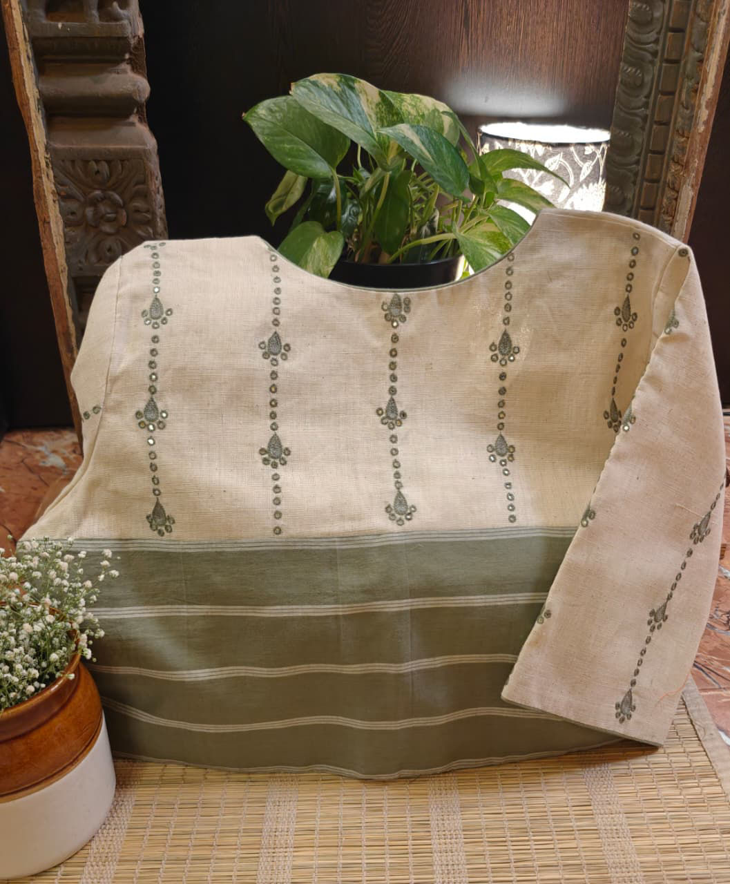 An ivory cotton blouse with soft pastel green stripes, detailed with tiny mirrors in delicate lines ✨ and intricate petal motifs that bloom with subtle charm. Handmade artistry, uniquely Svasa. 🪡💚