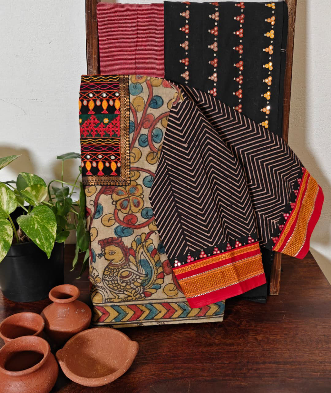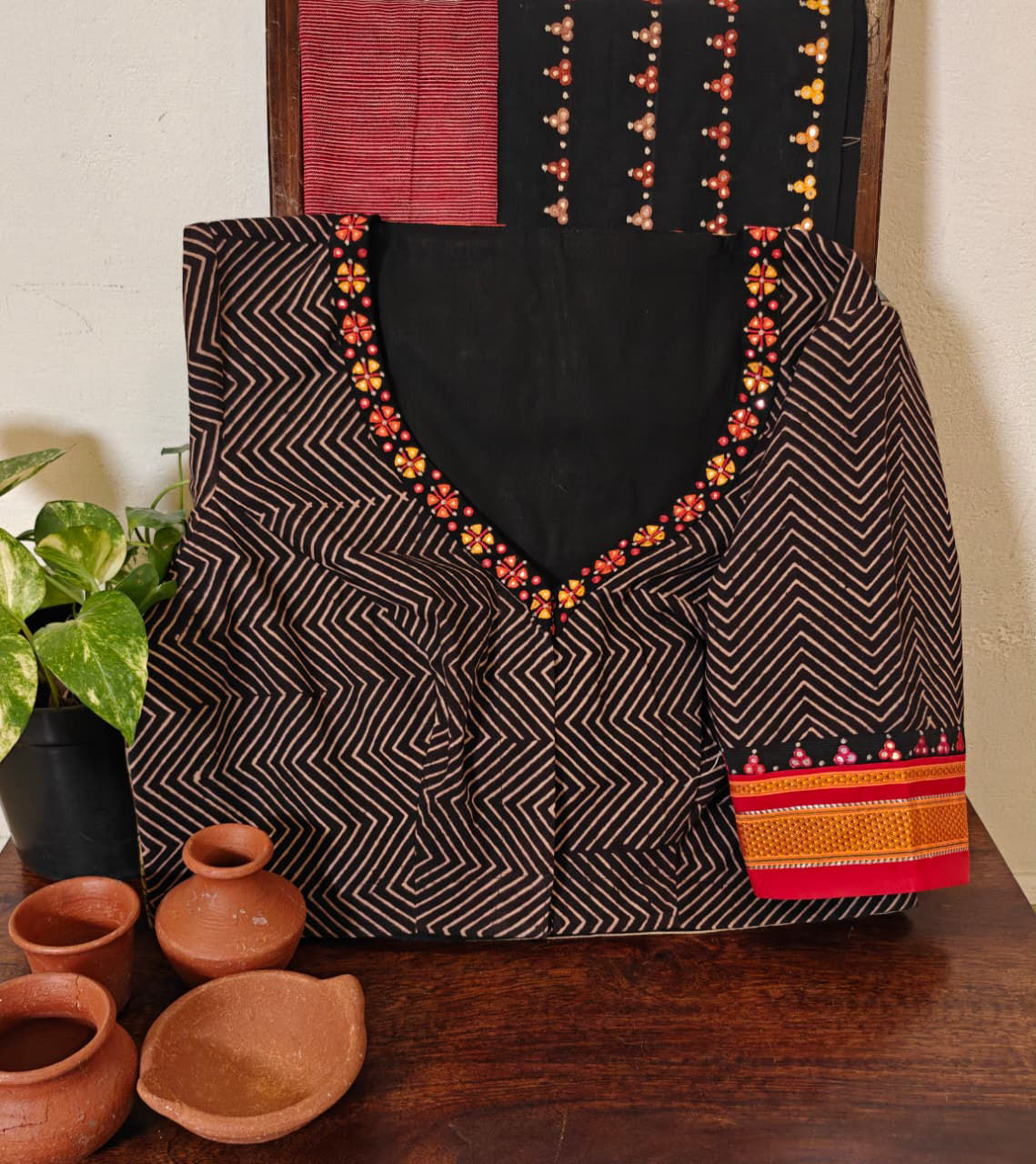 A classic kalamkari base brought to life with colourful tribal embroidery — every stitch adding rhythm, every hue adding character. Chevron Ajrakh prints complete this handmade story, making it a cotton blouse that celebrates art, culture, and craft in one frame. A Svasa original, rooted in tradition yet strikingly contemporary. ✨
