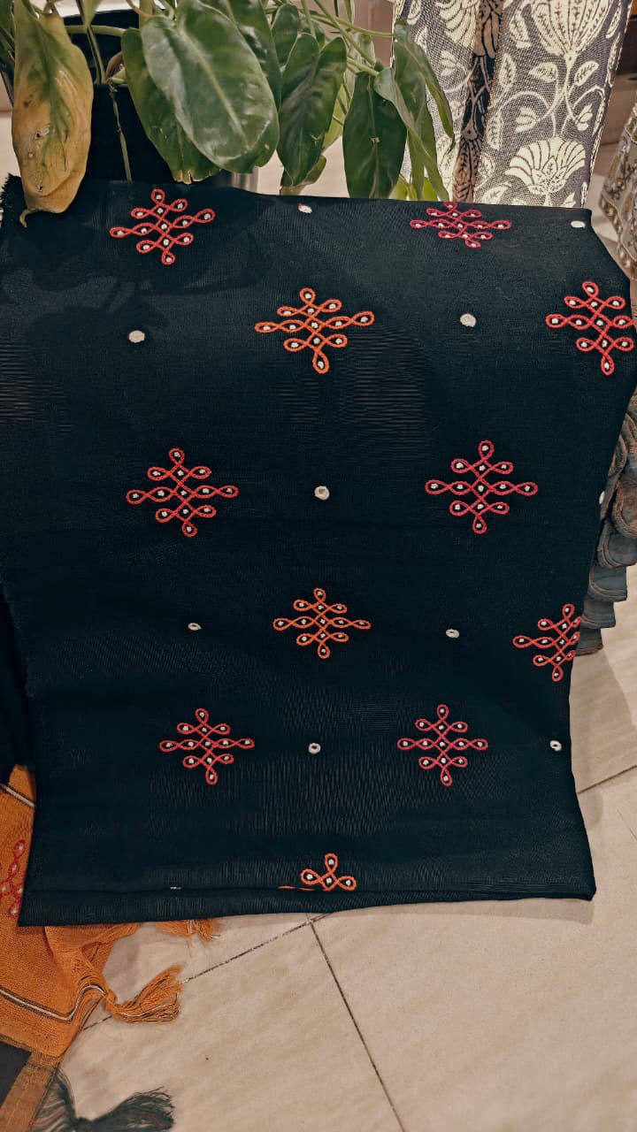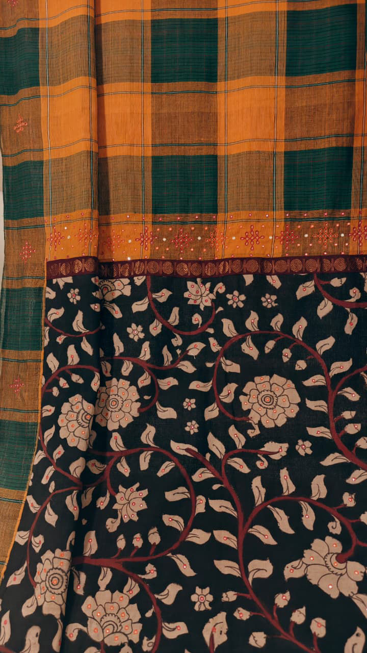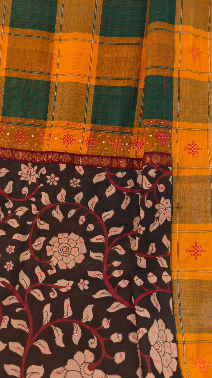 A bold play of yellow & green checks woven with tradition. The kalamkari pallu adds its timeless story. Paired with a striking charcoal blouse adorned with kolam motifs – a match made in Karaikudi’s looms. 🌾 Traditional yet forever unique.