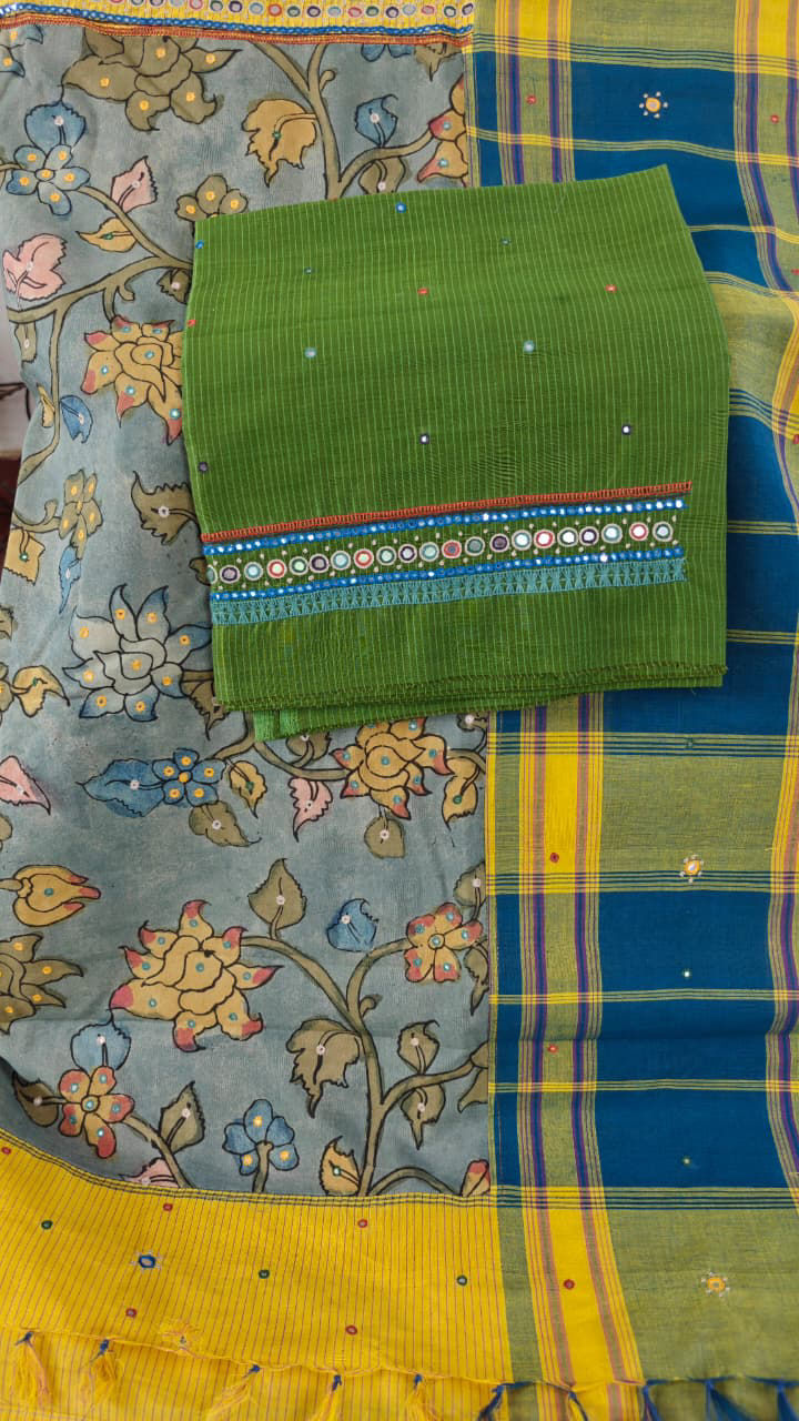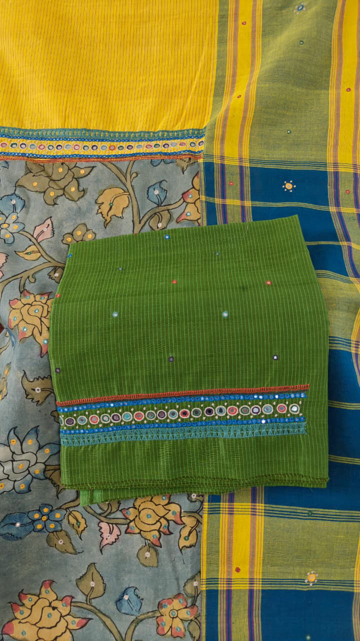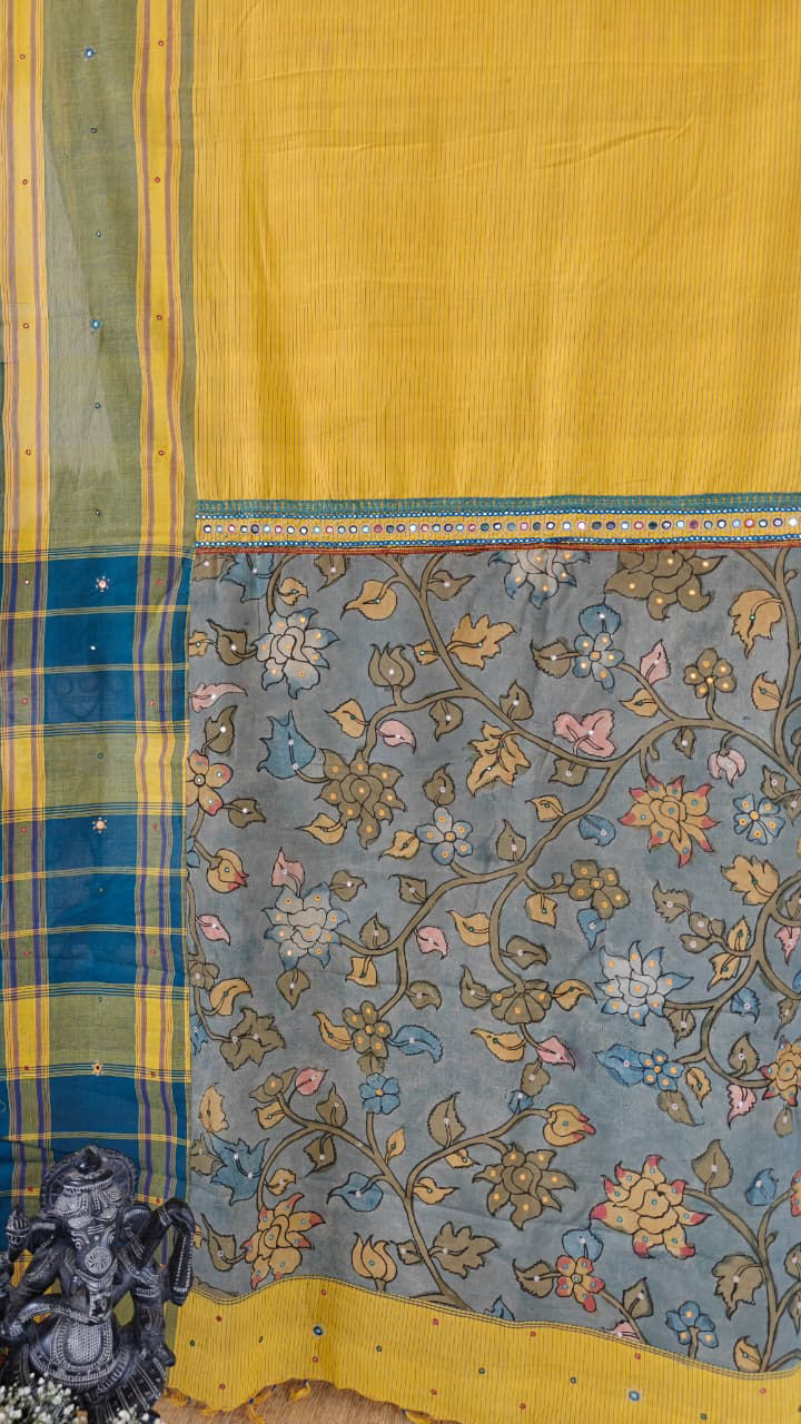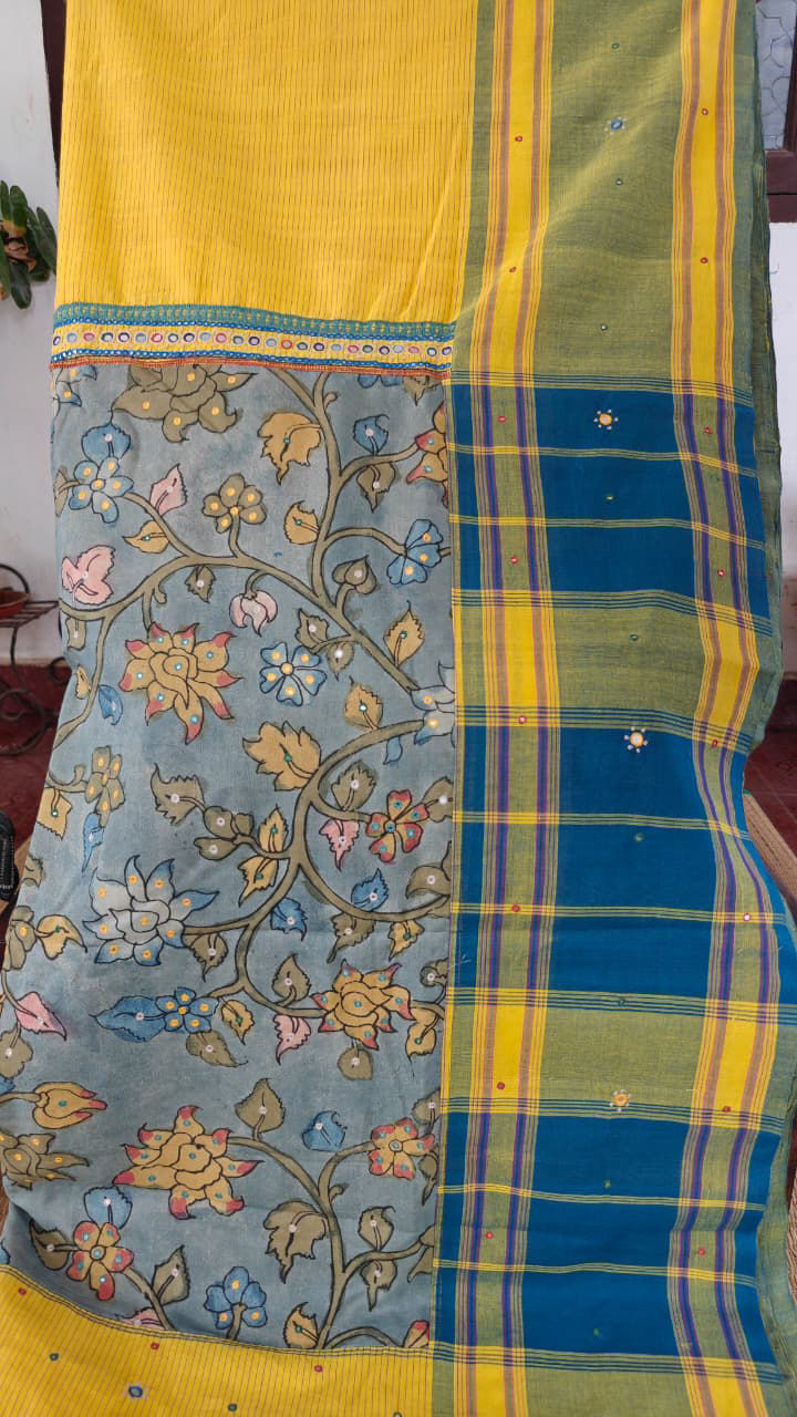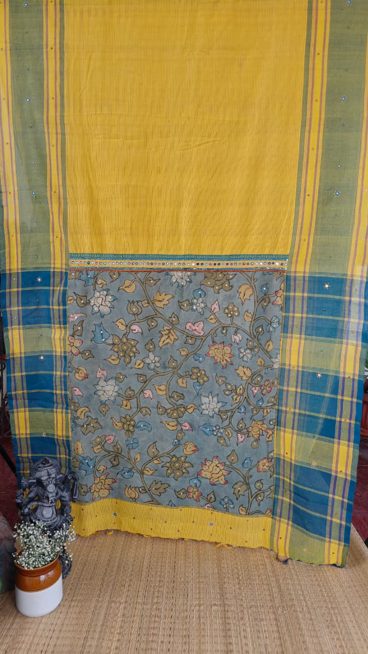 Pure cotton Kandangi in turmeric yellow, framed with blue and green borders. Embroidered in tribal borders and fused with a kalamkari pallu β a timeless weave, handmade at Svasa. πΏπͺ‘