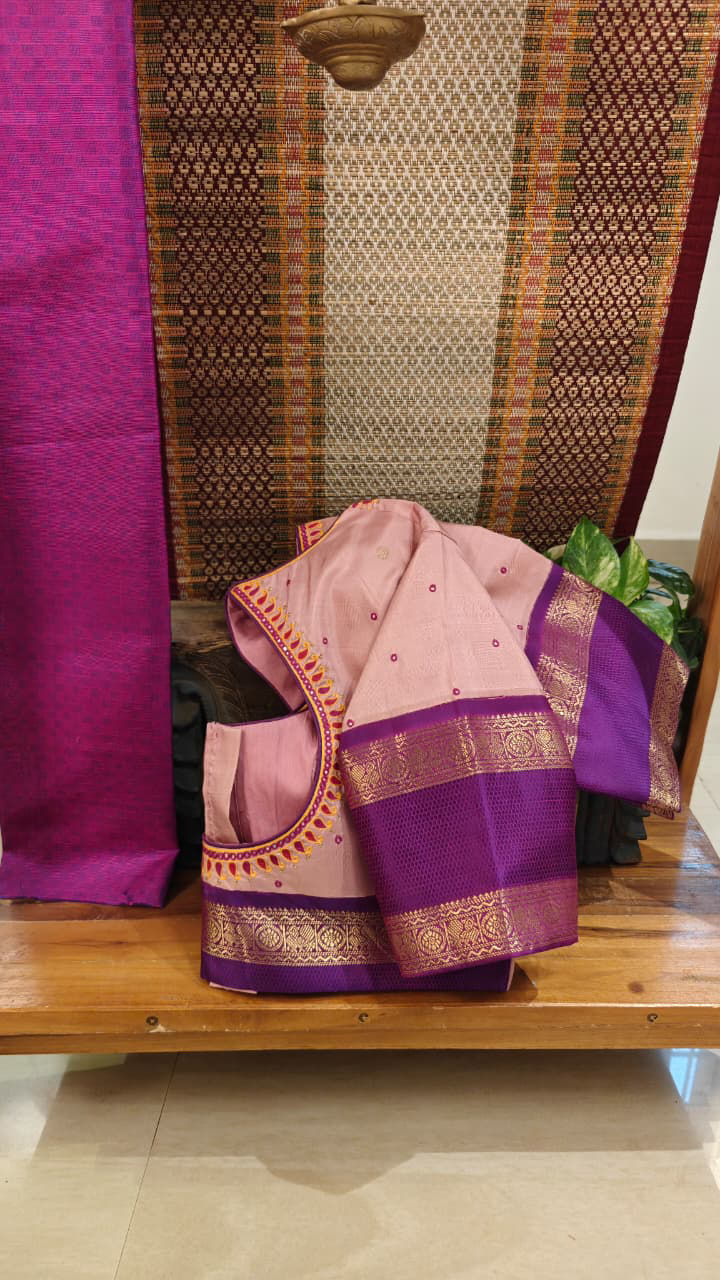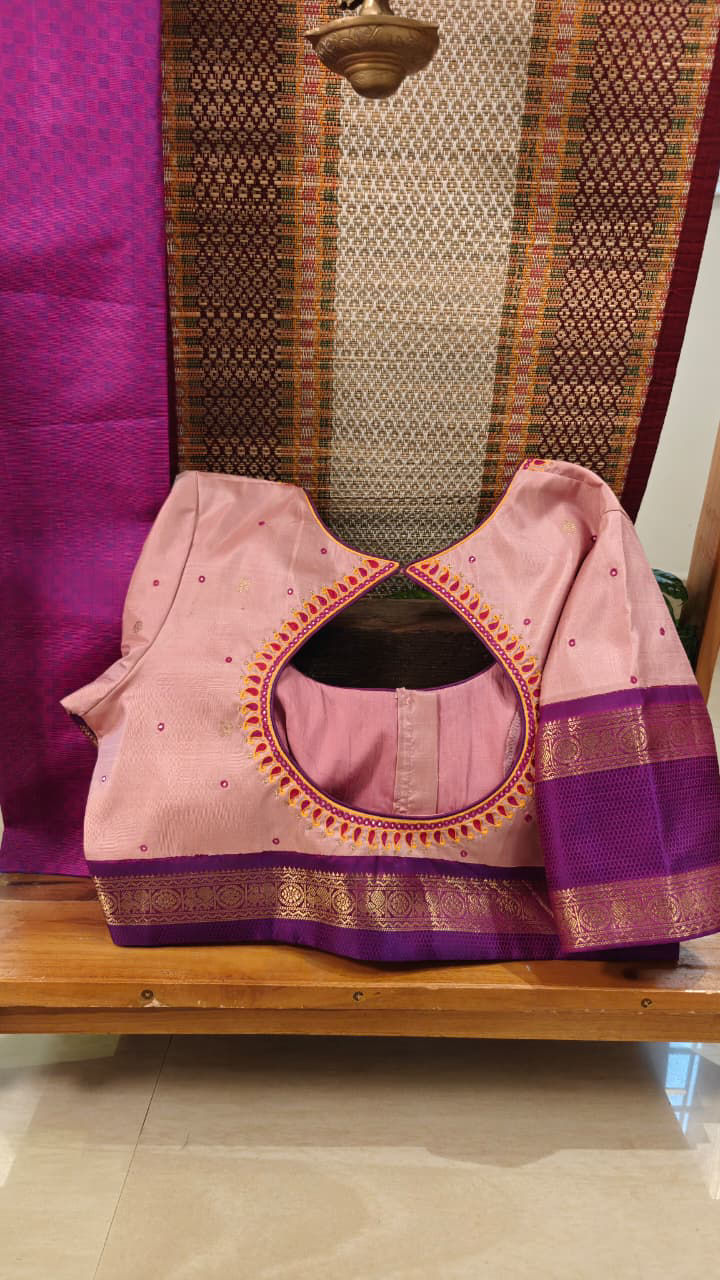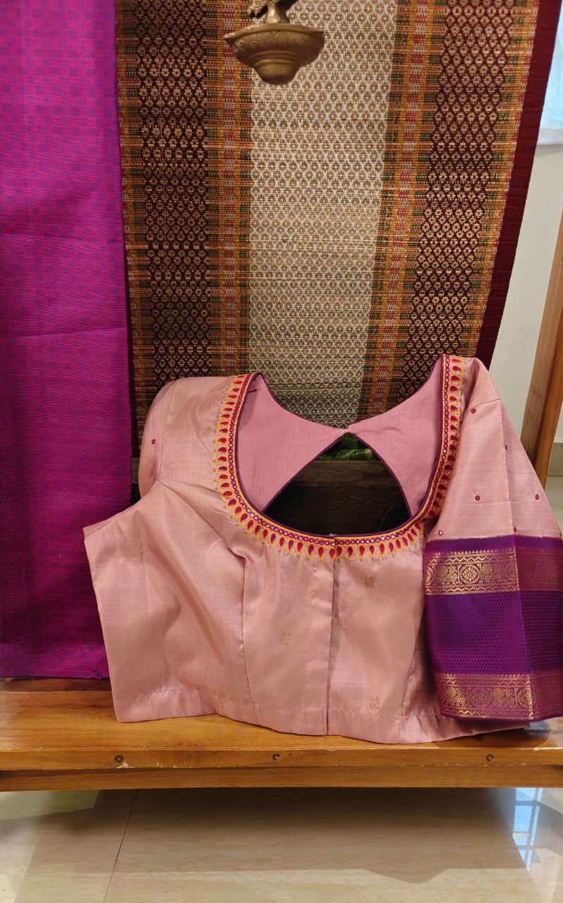 A pure Kanjivaram in delicate lotus pink with a rich purple border — a classic pairing that never fades. ✨ The neckline blooms with embroidered paisleys, adding layers of tradition and artistry to this timeless blouse. 🪡💜🌸