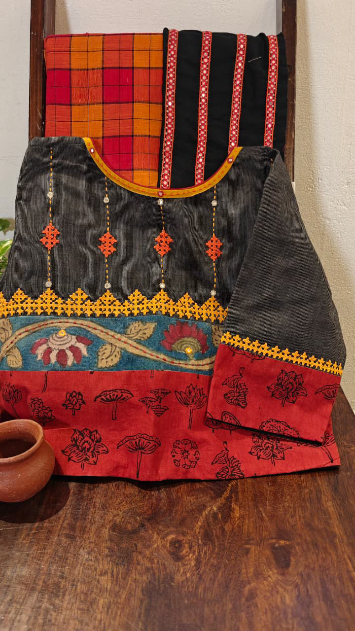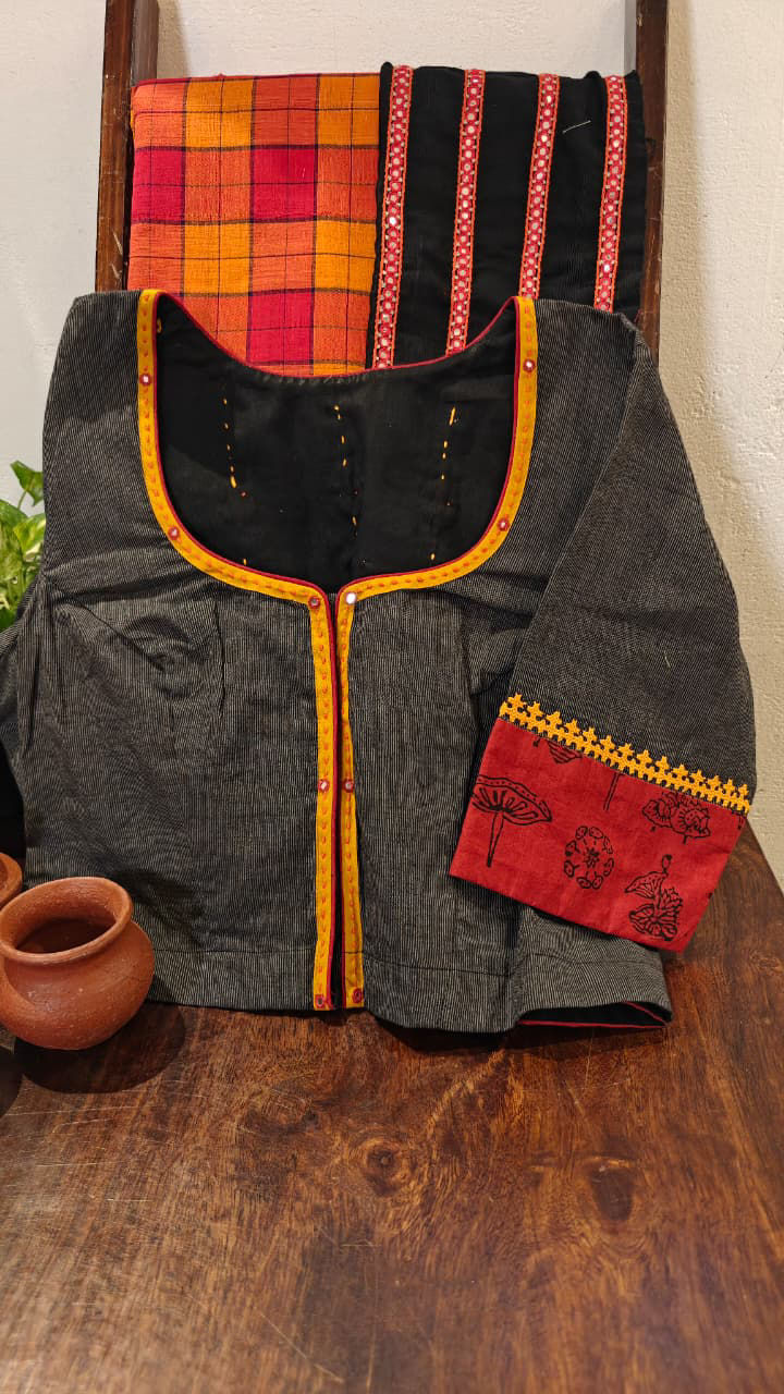 Our β€œmutka sleeve” has been a favourite since the very beginning of Svasa β€” a design that feels rooted, effortless, and unmistakably us. Here, a charcoal linen base meets our signature mutka sleeve, embroidered around the neck in soft, textured stitches. The sleeves in Telia Rumal β€” in blue and red β€” add that bold heritage rhythm that makes this piece stand out, quietly. ✨ A timeless Svasa story β€” simple, soulful, crafted by hand.