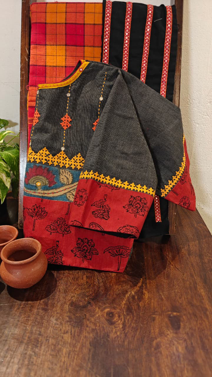 A classic Ponduru in ivory and red, hand block printed and fused with black linen. Twin paisleys embroidered delicately around the armhole in timeless shades β€” a piece that carries heritage with subtle artistry. πŸͺ‘