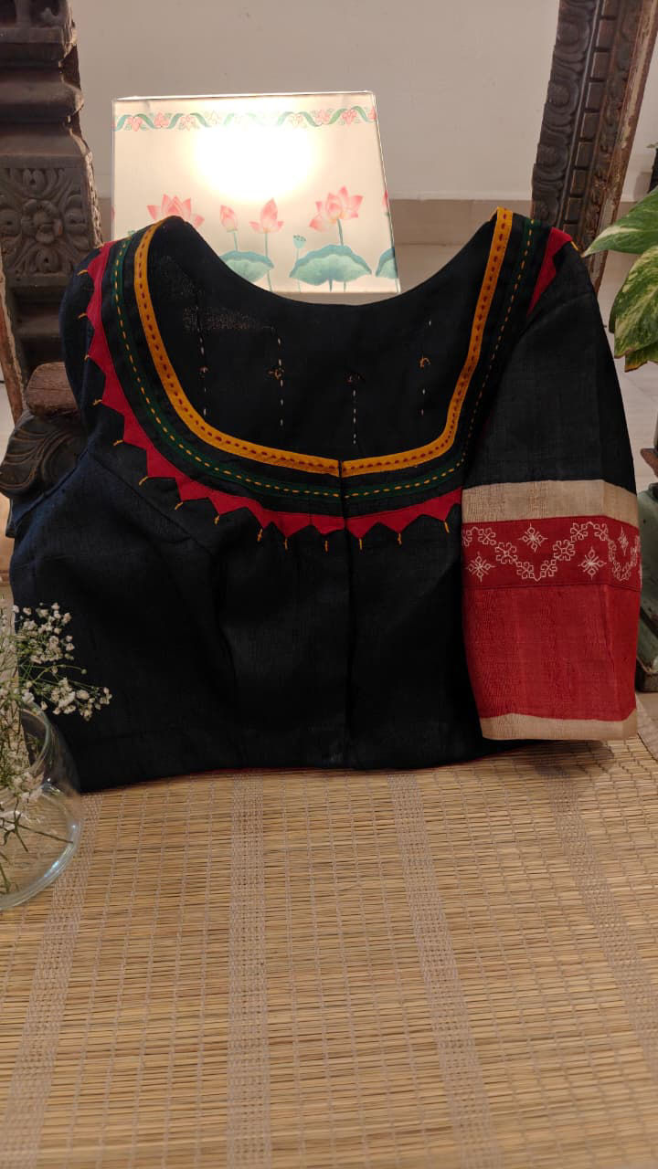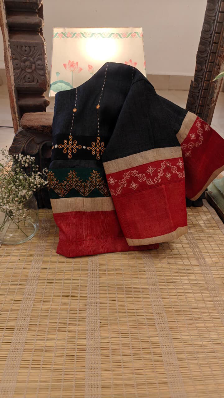 A striking pure tussar in black and red — bold, grounded, and rare. Kolam motifs meet Kasuti embroidery, where geometry and devotion come together in quiet contrast. Not a soft Margazhi story, but a powerful one — intense, resolute, and unforgettable. An unusual Margazhi tale, told in thread and silence. ✨