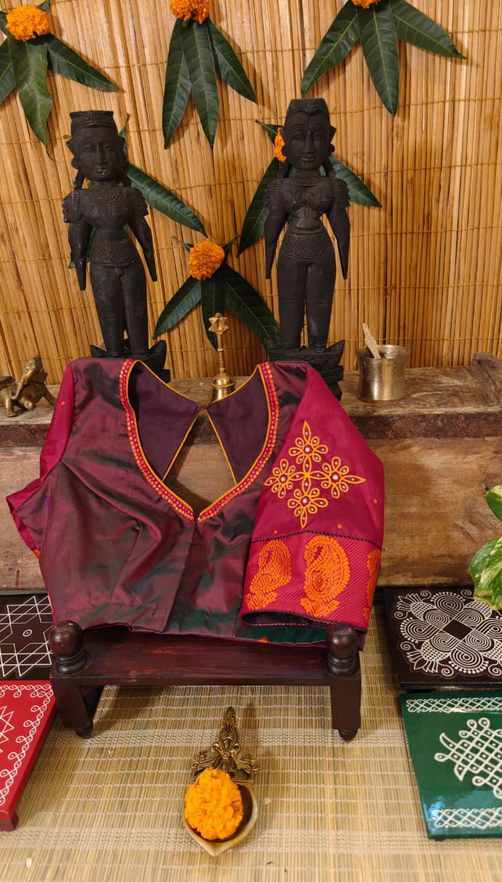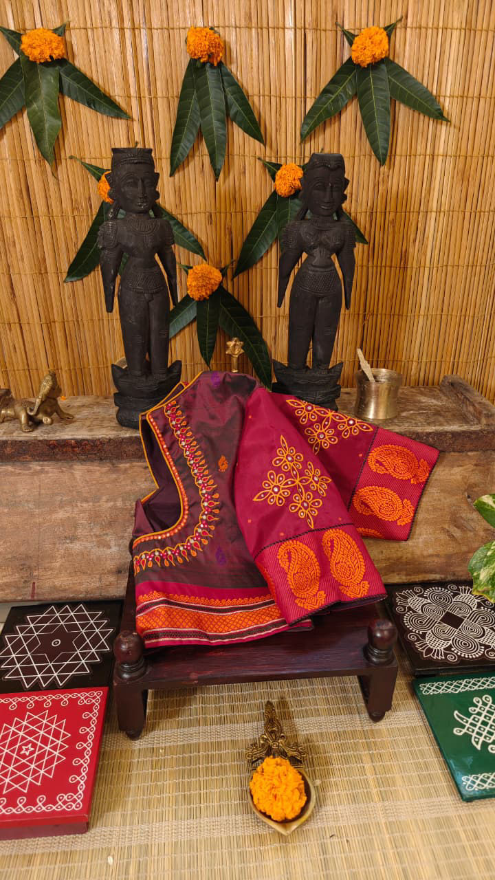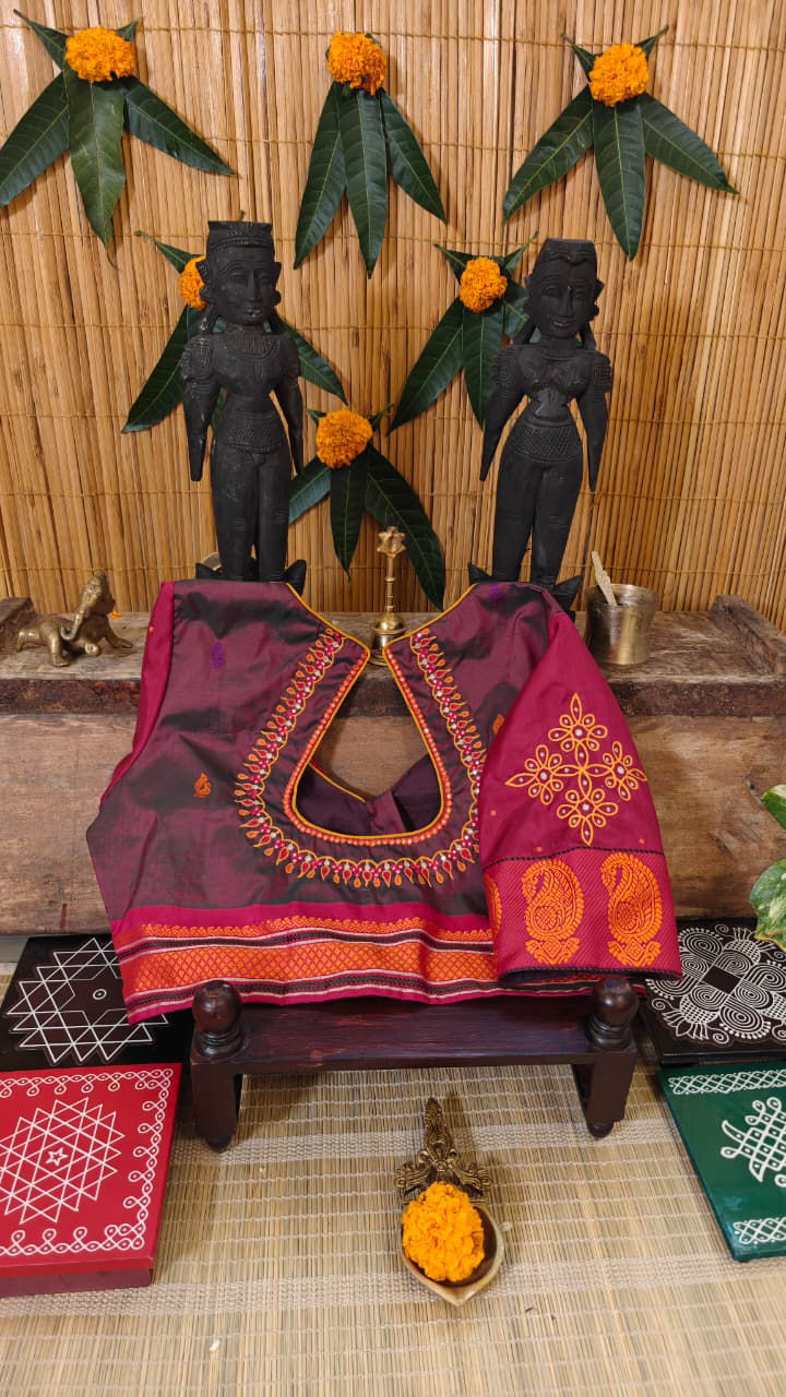 A purple–mix double-colour pure Kanjivaram silk, finished with delicate thread borders. An Araku sleeve embroidered with tiny kolam motifs — the quiet rhythm of Margazhi captured in every stitch. Handwoven. Handmade. Svasa.