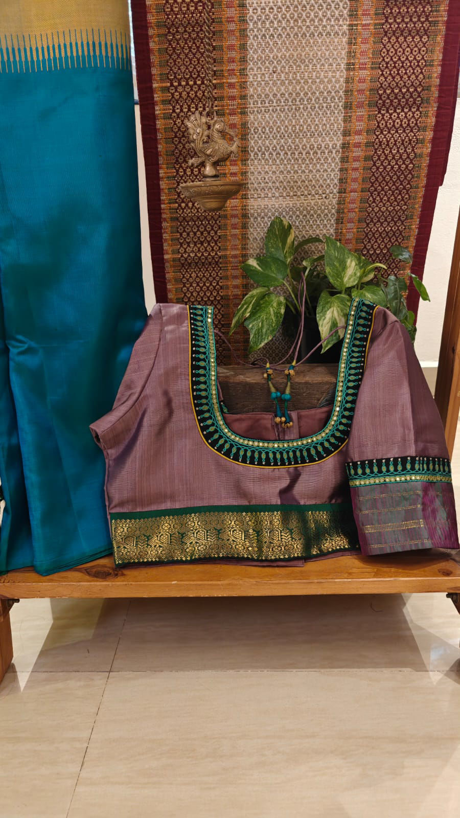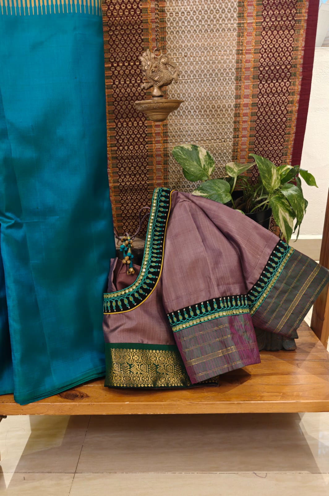 A pure Kanjivaram silk in a subtle mauve, framed with a bottle green border. Petal borders bloom around the neck and sleeves in hues that blend and balance โ€” soft, classic, and timelessly Svasa. ๐Ÿชกโœจ