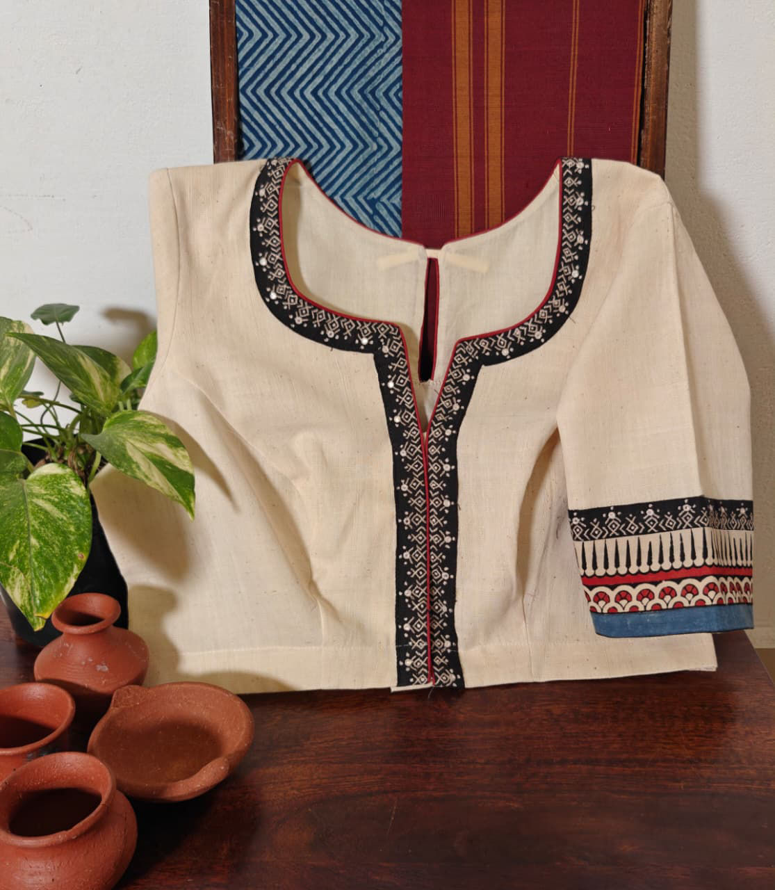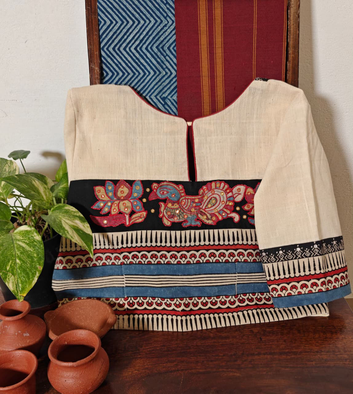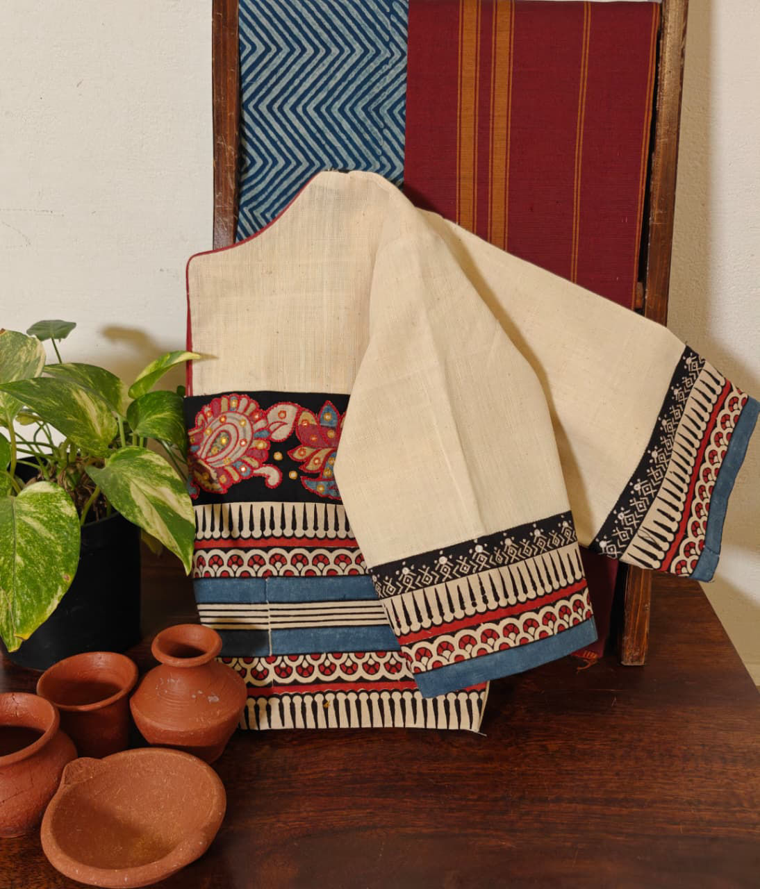 Ivory with indigo block prints, finished with a kalamkari appliqué. A black-and-white embroidered border runs along the front — artfully detailed, quietly striking. 🌸🪡