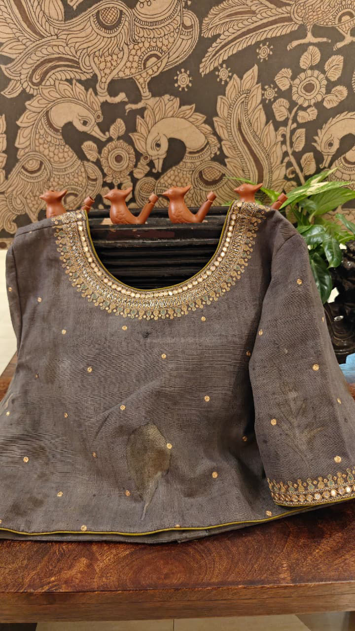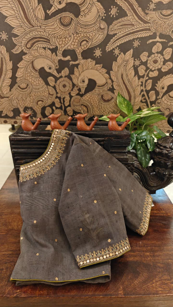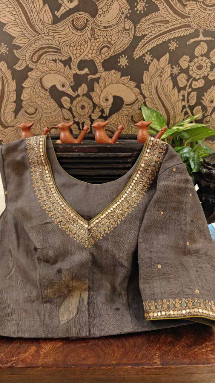An eco khadi fabric in brown brought to life as a blouse, adorned with gorgeous beaten gold embroidery 🌟 and a dash of antique hues 🌾. Each stitch captures the essence of nature β€” sustainable, soulful, and timeless. πŸŒ±πŸ’š