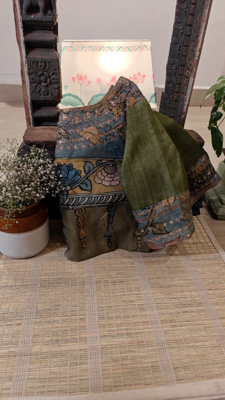 A gorgeous pastel kalamkari silk, adorned with beaten gold embroidery in antique shades. Soft, graceful, and crafted to feel like a whisper of heritage and art. 🌿πŸͺ‘
