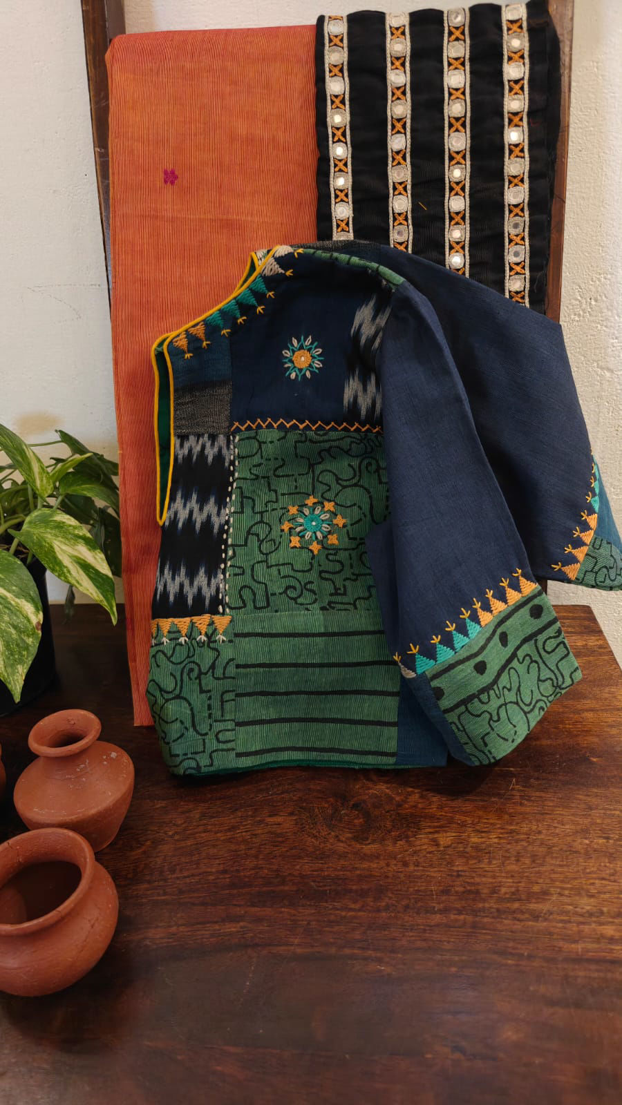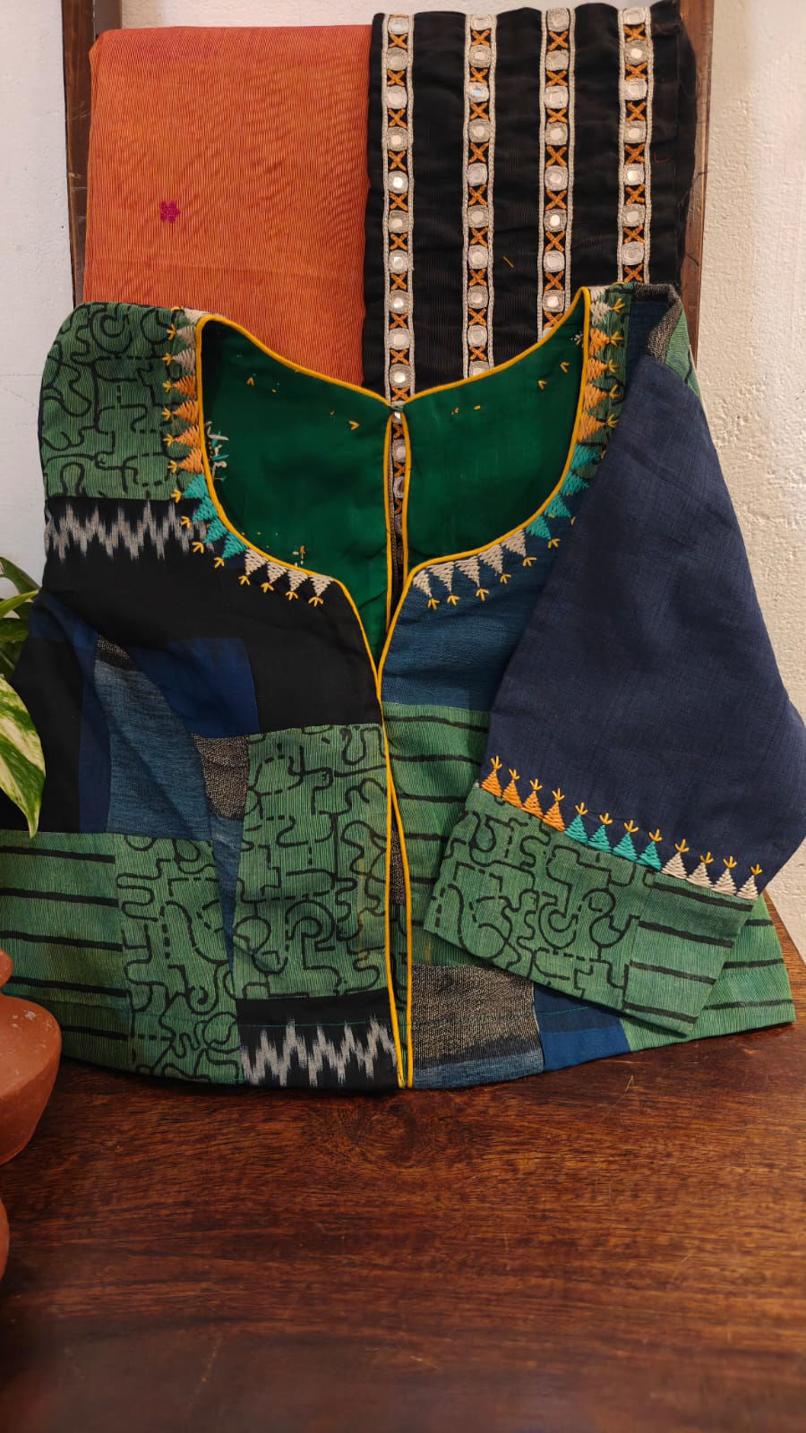 A play of green and indigo patches, thoughtfully sewn together. Adorned with abstract embroidery, echoing revival and sustainable craft. A Svasa classic — timeless and exclusive. 🌿