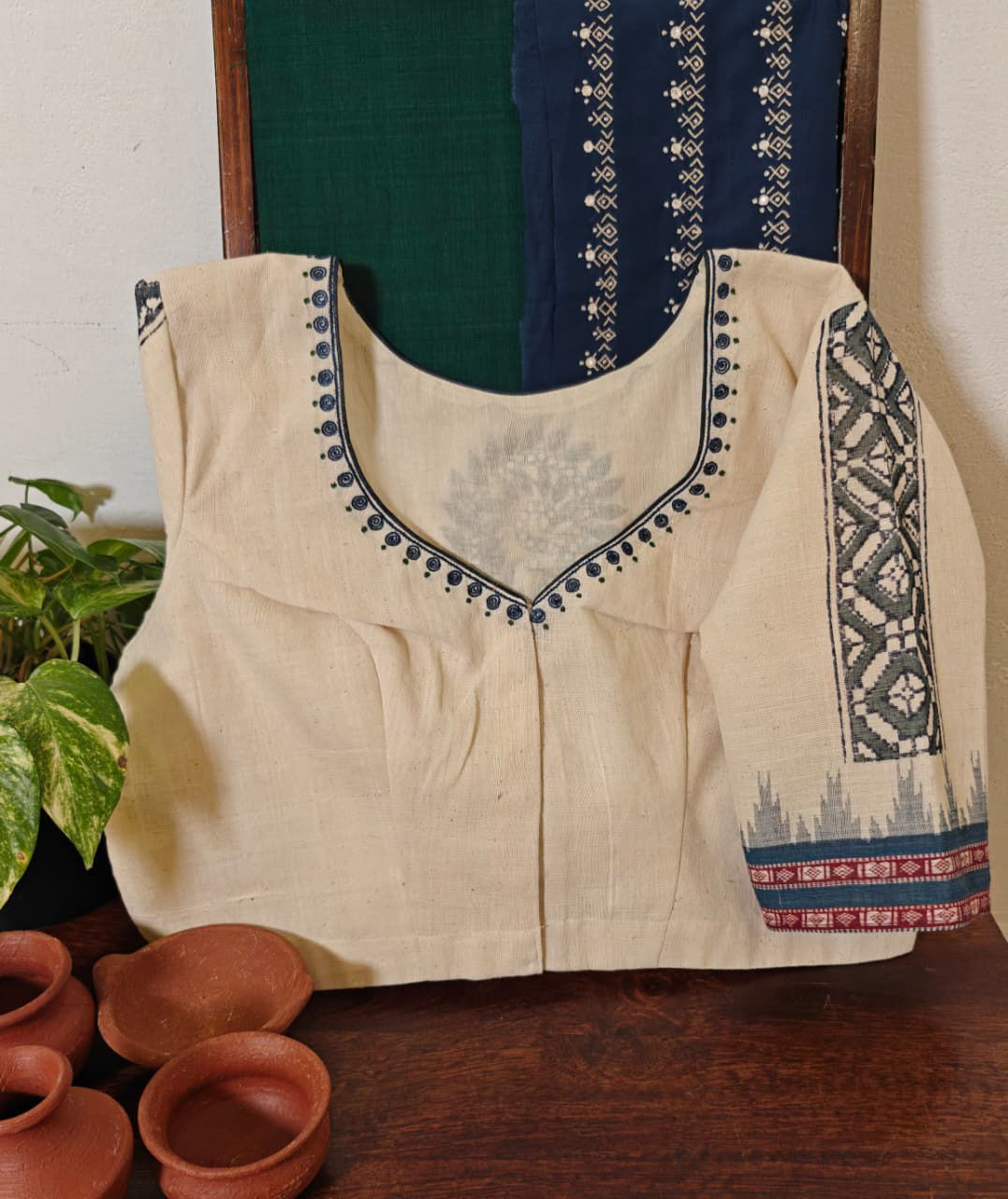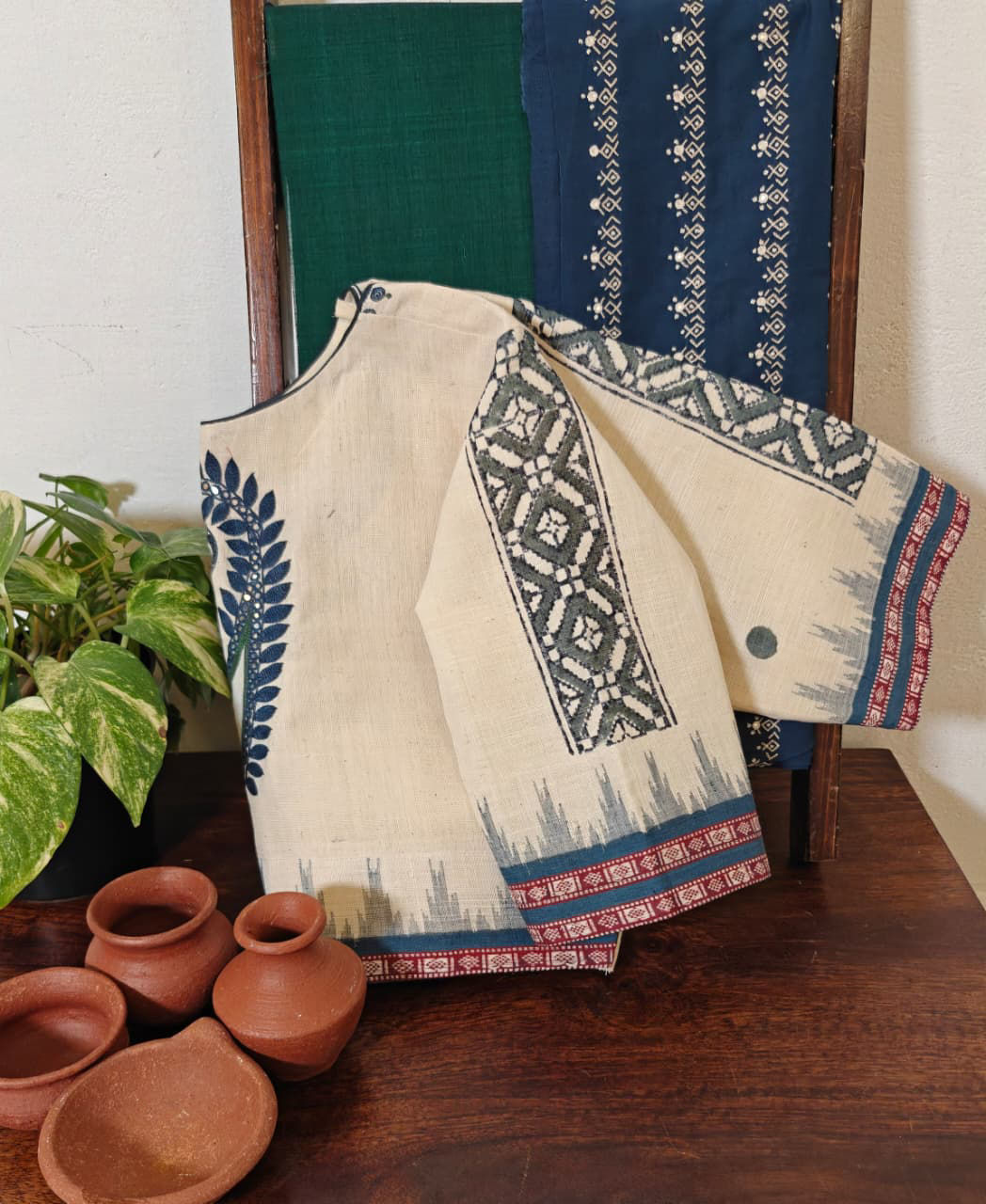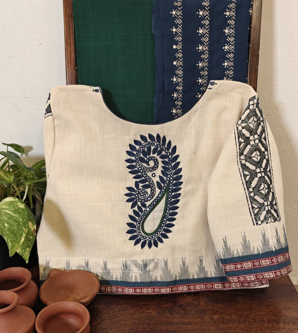 Classic Ponduru in ivory and blue, adorned with a paisley delicately embroidered in indigo. Handmade heritage at Svasa. 🌿πŸͺ‘