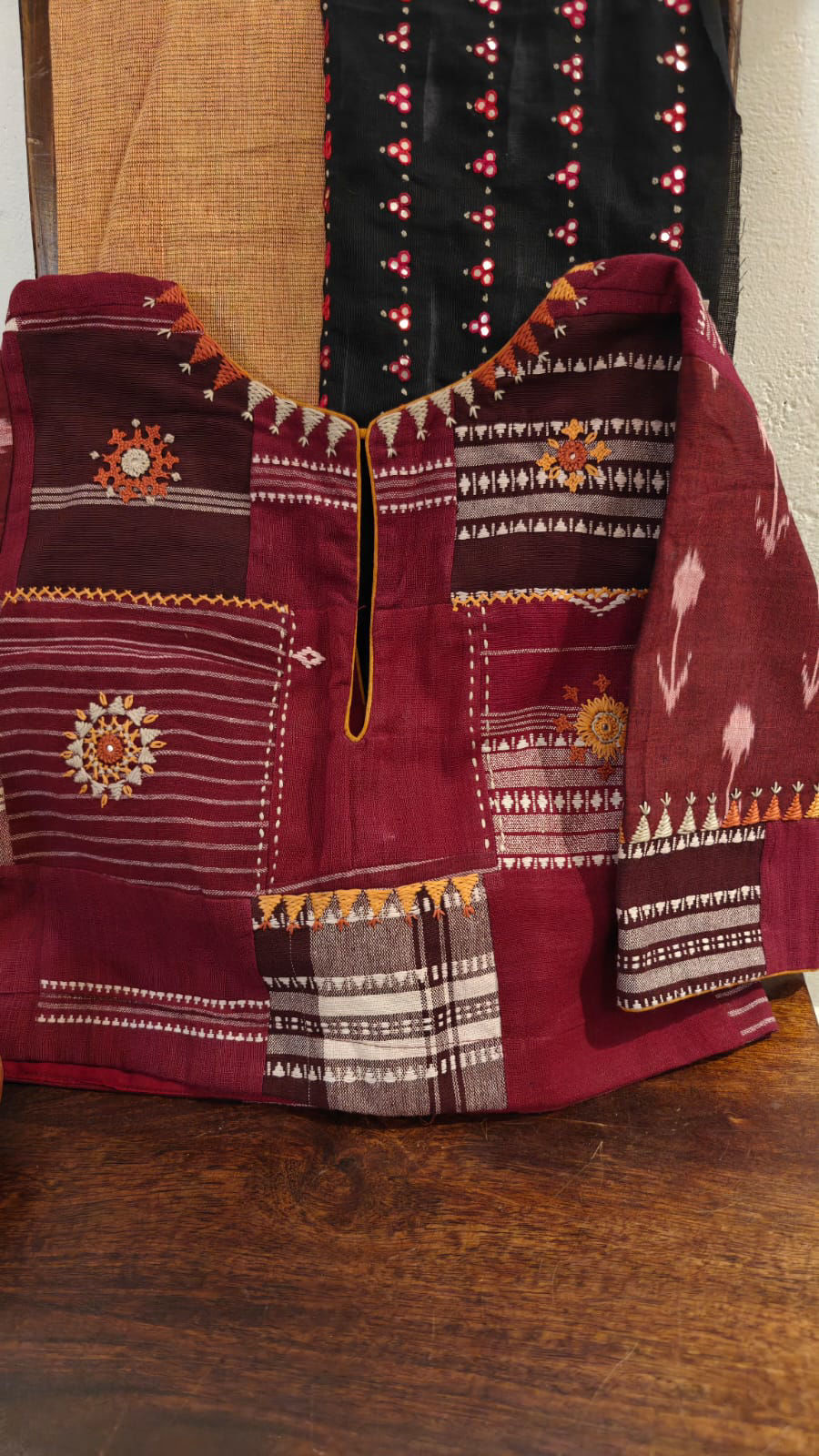 Patches of Kotpad weaves in warm brown and burgundy, carefully sewn together. A story of sustainability, revival, and timeless craft. A Svasa classic that celebrates the beauty of handmade. 🪡🌿