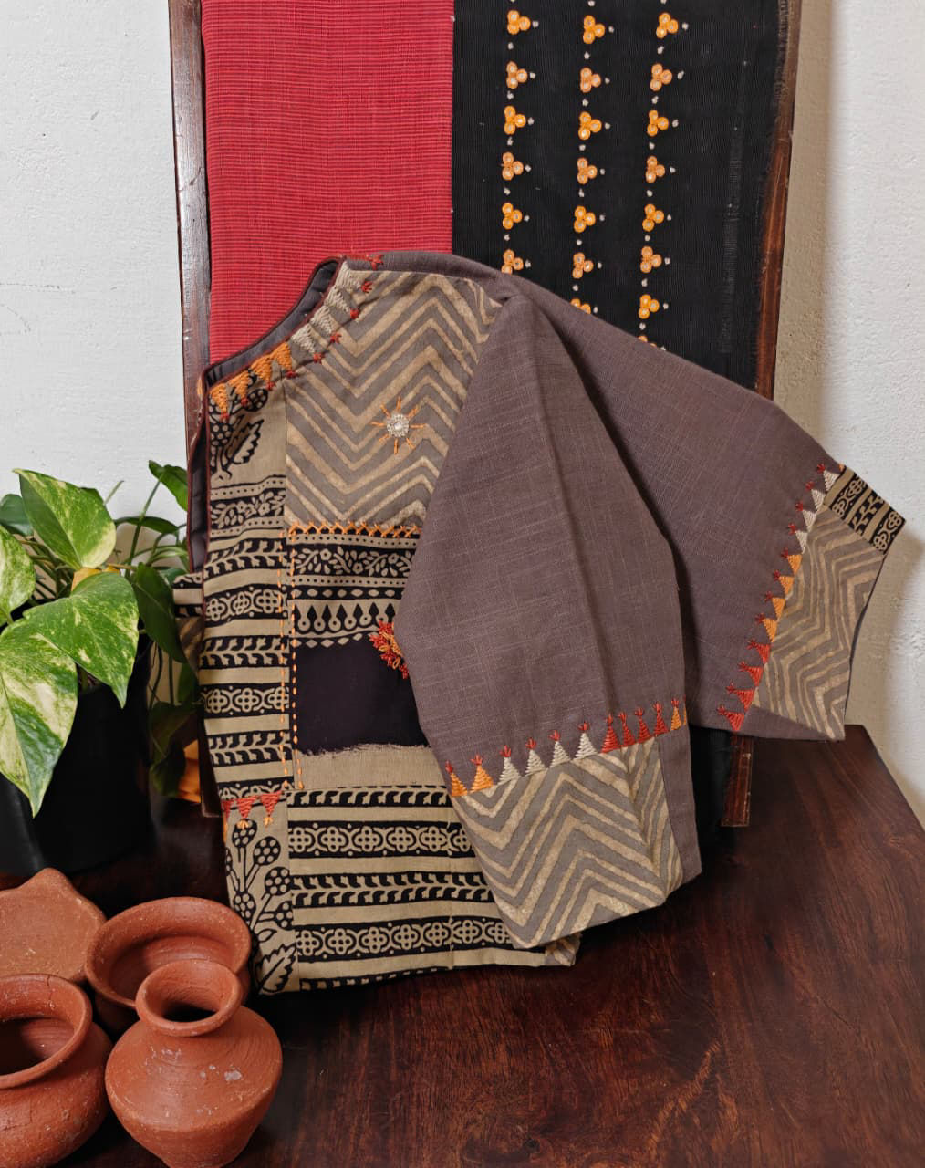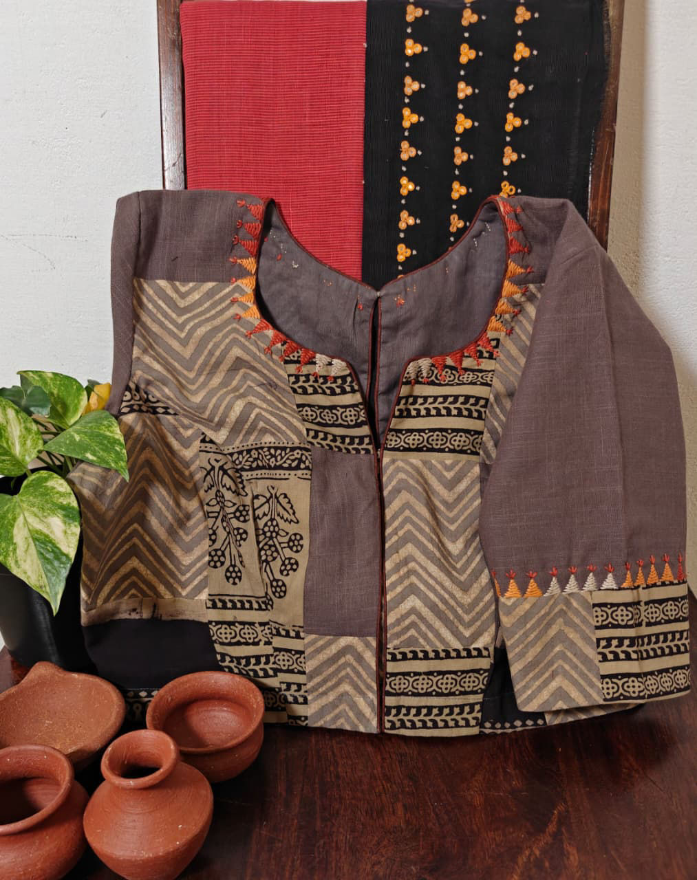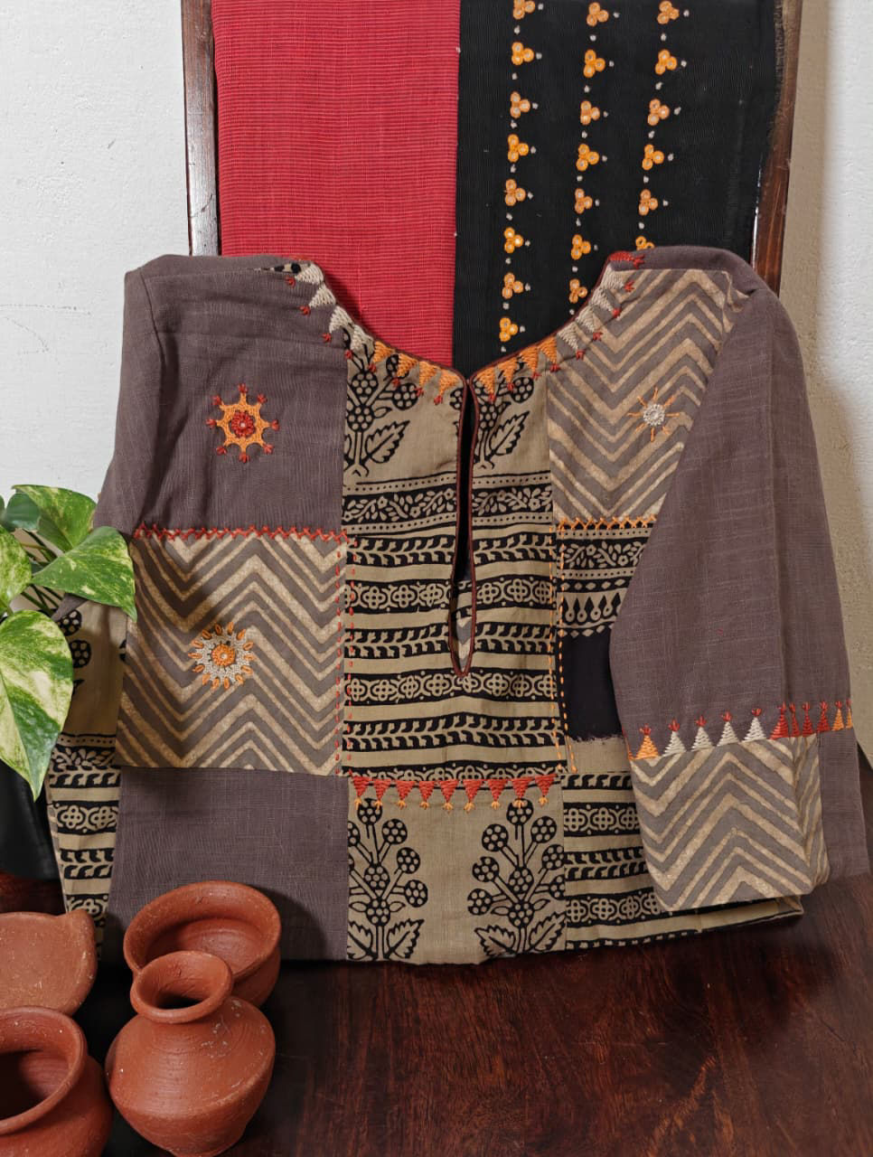 Patches of hand-blocks in shades of sage, sewn together and brought alive with abstract embroidery. A cotton blouse thatโ€™s uniquely handmade, one of a kind at Svasa. โœจ๐Ÿชก