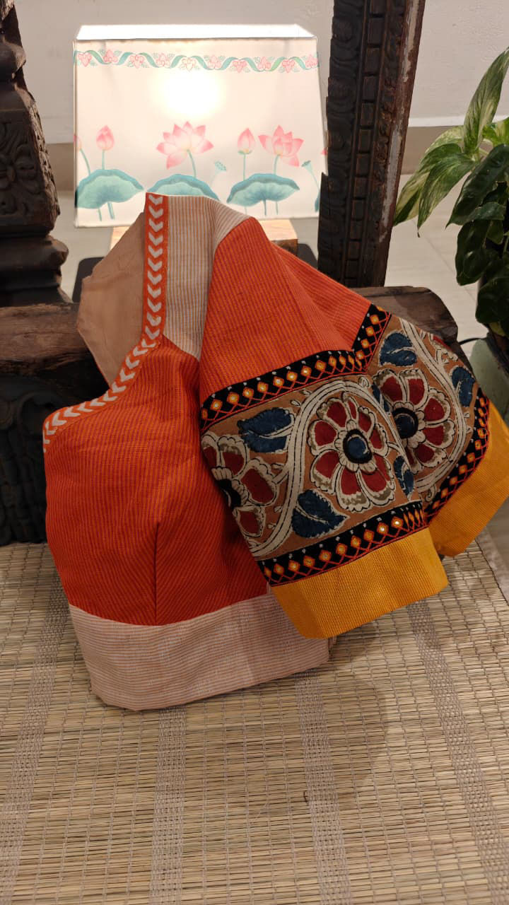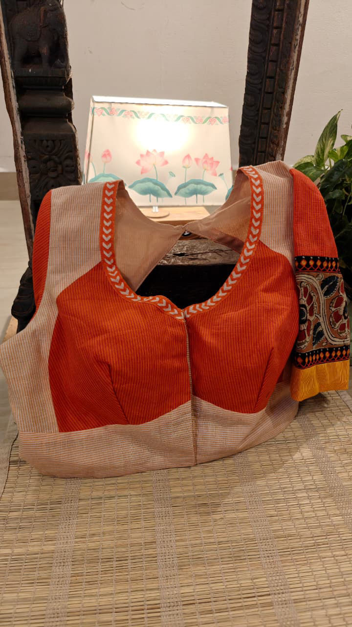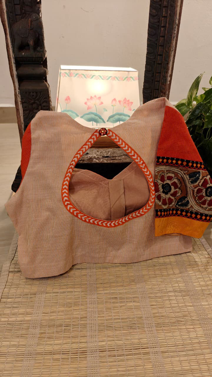 A fusion choli in shades of orange and beige — warm, earthy, and full of charm. Orange stripes bring rhythm to the weave, while Mughal-inspired motifs on the sleeves add a touch of vintage artistry. A handcrafted cotton beauty that speaks softly, yet stands out.