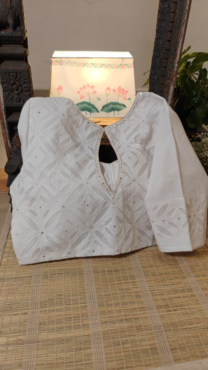 A pure ivory cotton blouse with delicate ivory appliquΓ©, studded with mirrors. A simple, classic creation that never goes out of style. 🌿πŸͺ‘