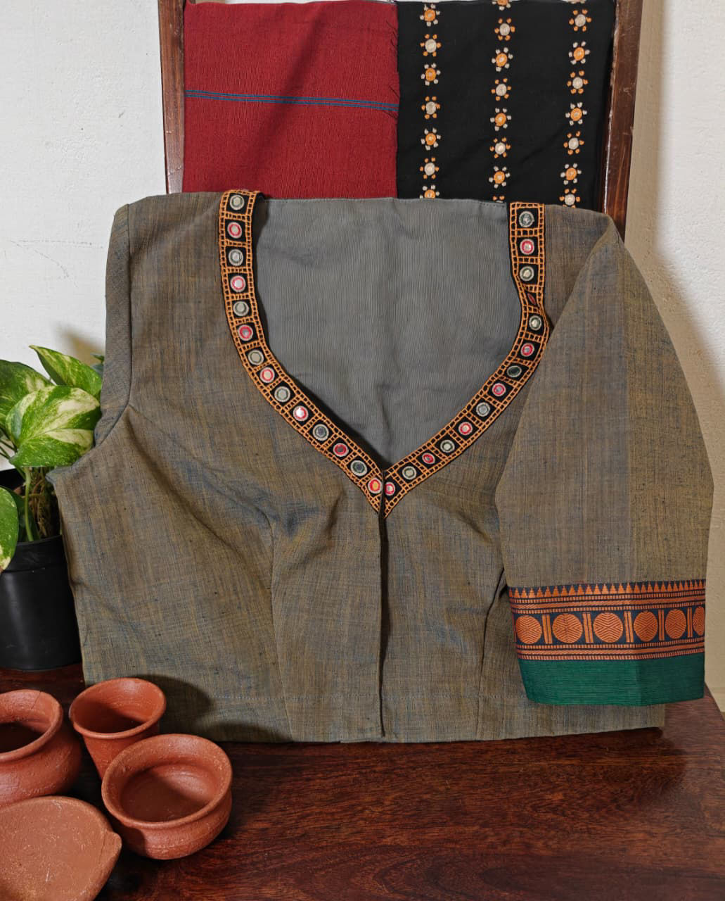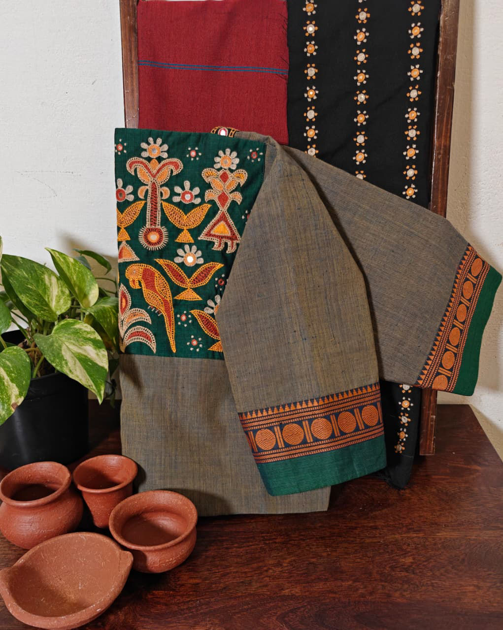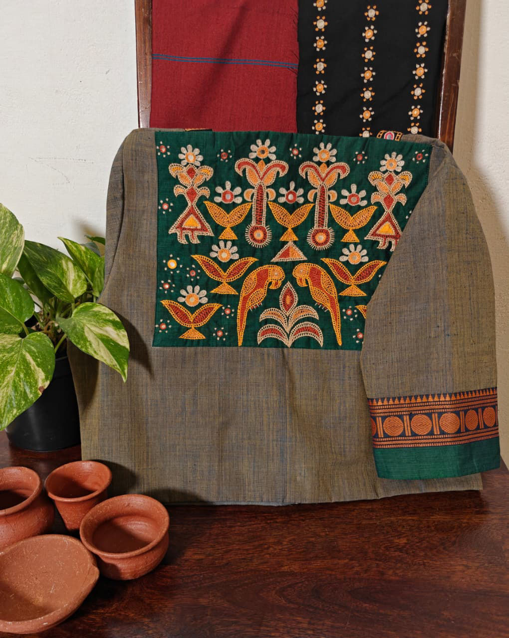 A soothing grey base brought alive with green and embroidered tribal motifs ✨ Splashes of colorful, eye-catching hues make this piece vibrant yet grounded in tradition. Rustic. Handmade. Truly one of a kind. 💚🎨