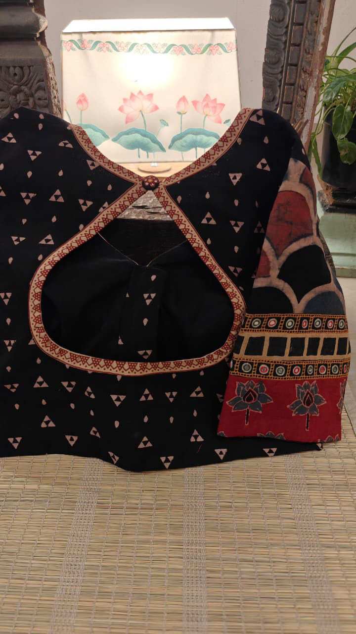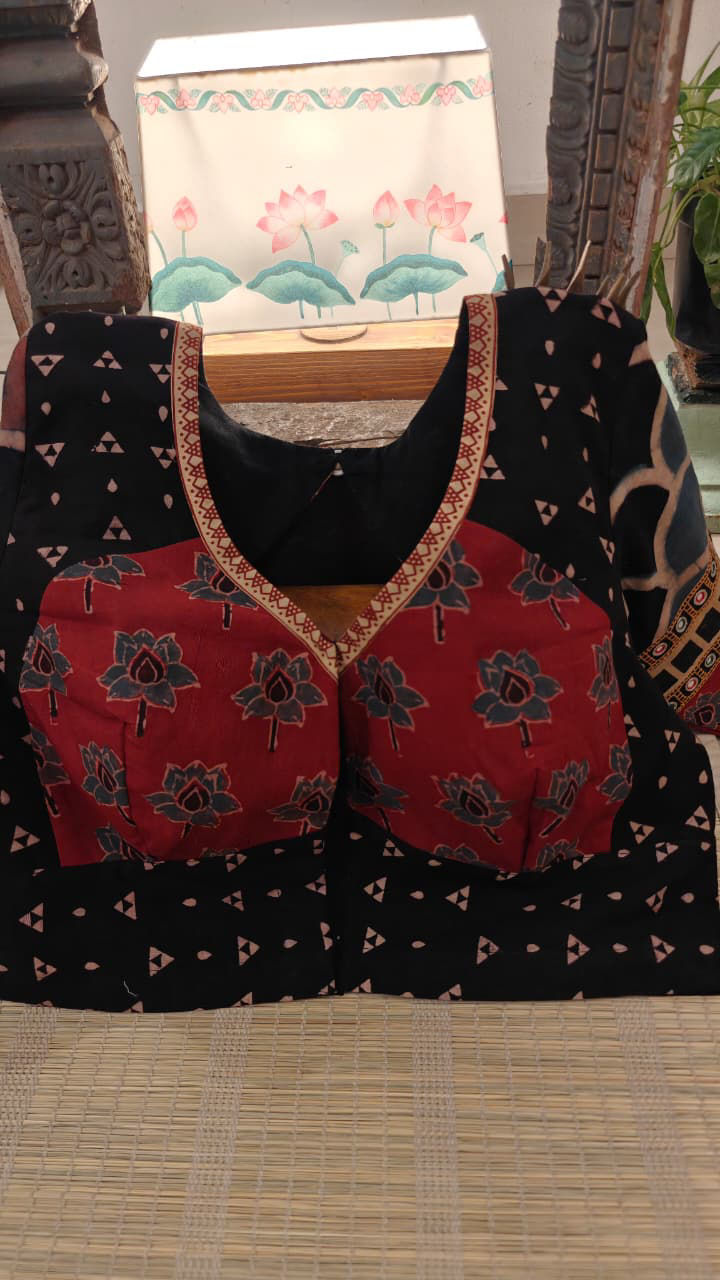 Charcoal and ivory Ajrakh hand block prints meet a fiery red cutcholi. Multi-weaves come alive on the sleeves, fused with mirror borders — a true celebration of heritage and handmade craft. ❤️🪡🌿