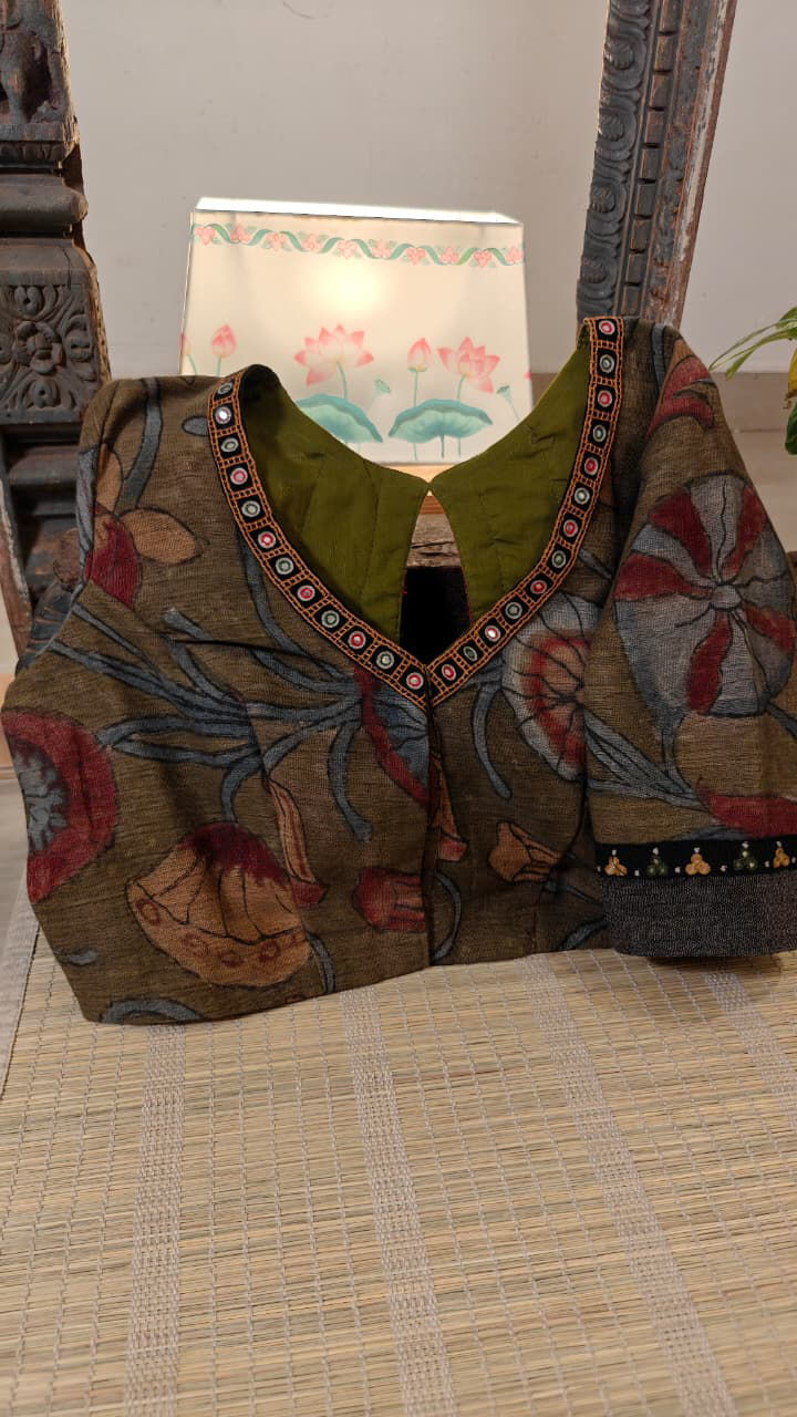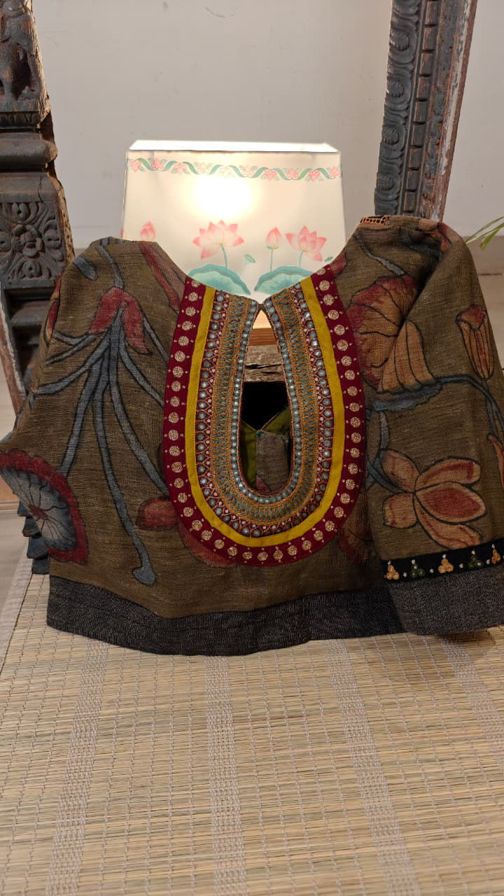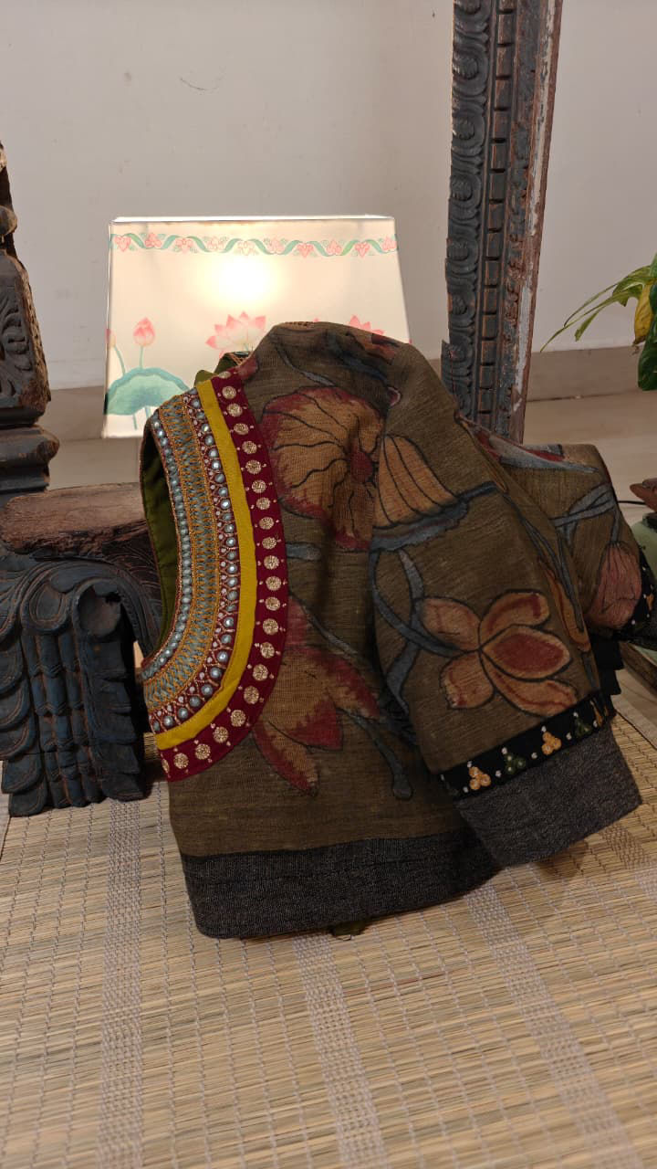 Moss green cotton khadi brought alive with vintage embroidery on antique kalamkari. A one-of-a-kind creation that whispers stories of timeless craft and heritage. ✨🪡