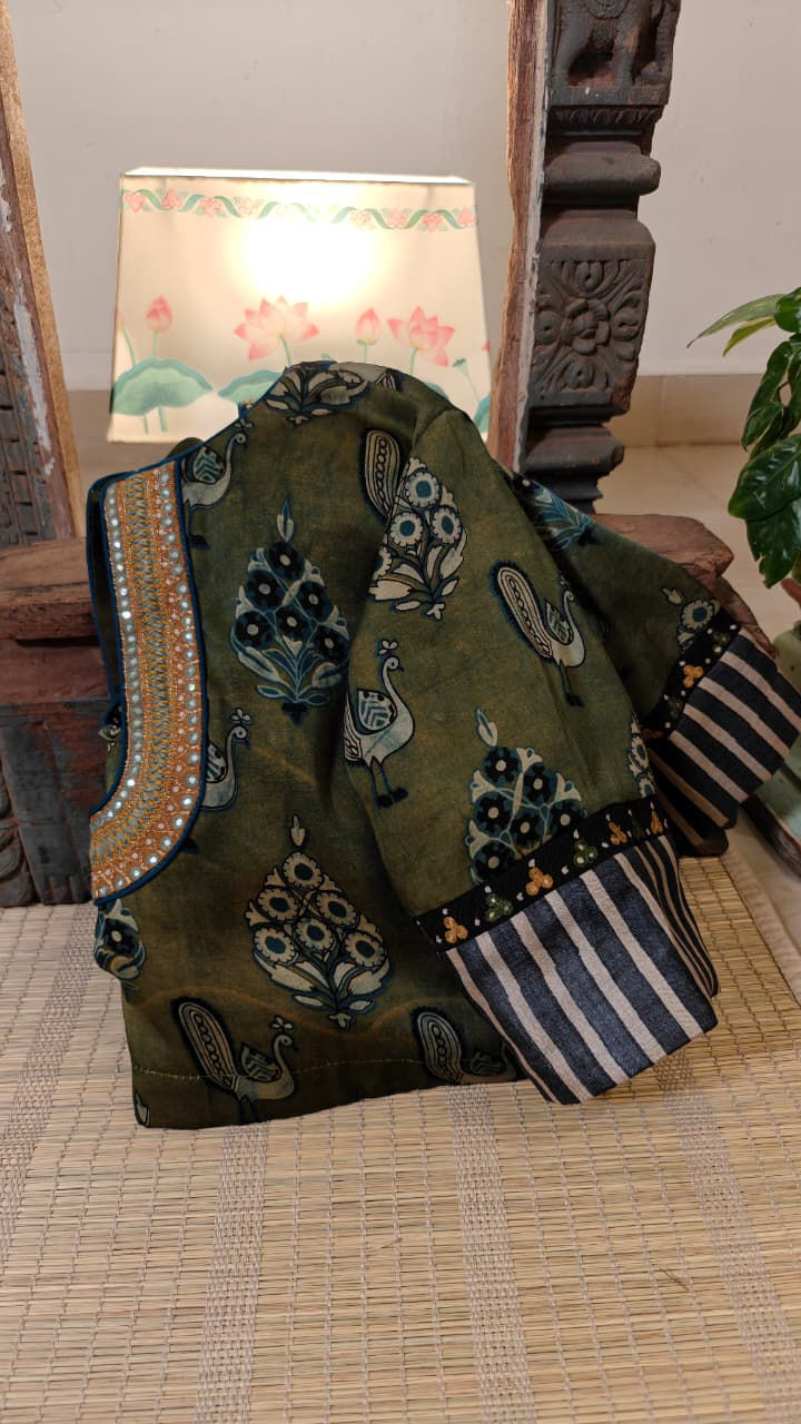 Modal silk adorned with vintage embroidery, featuring Annams and timeless motifs. A heritage weave, handmade at Svasa. 🌿πŸͺ‘