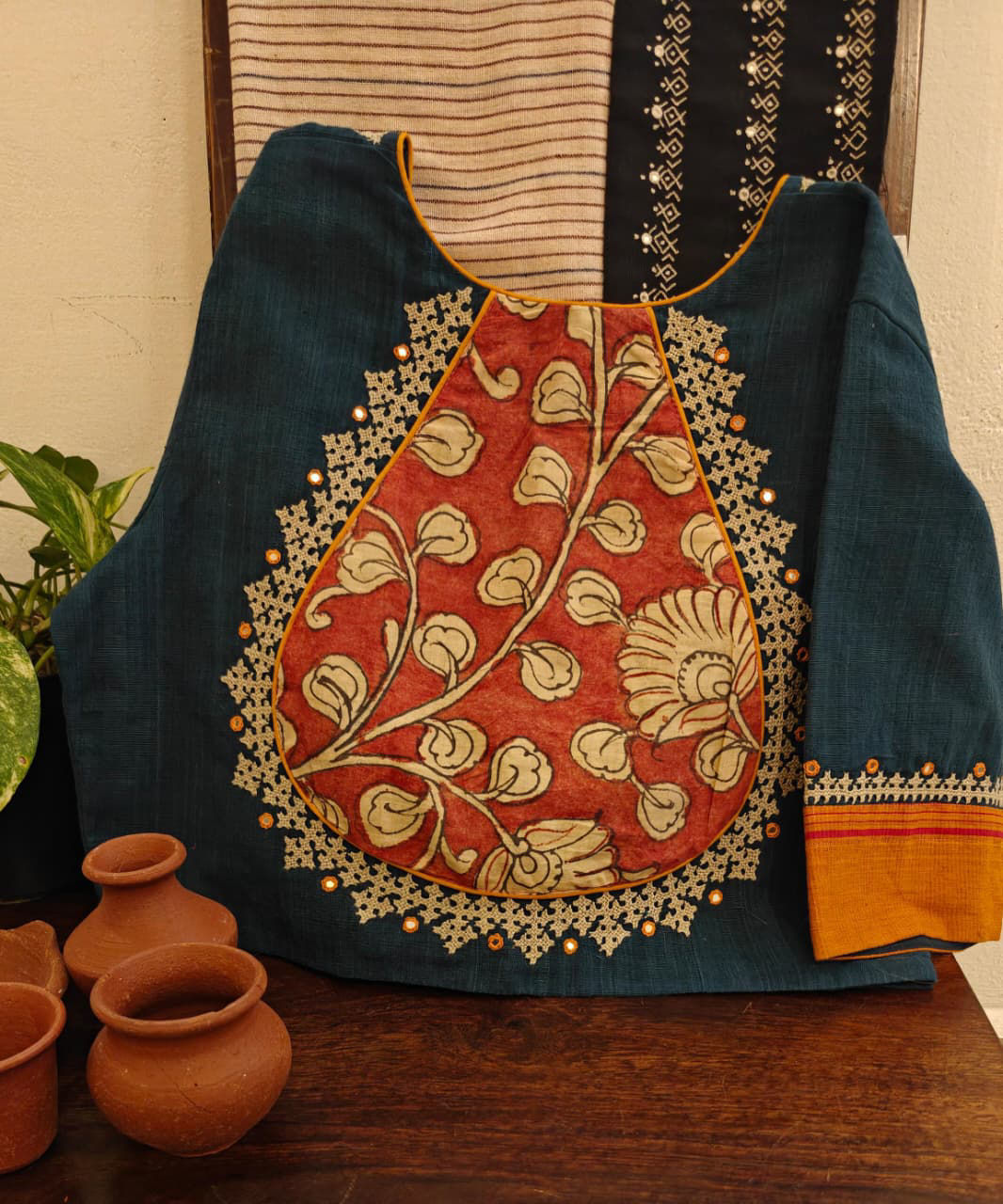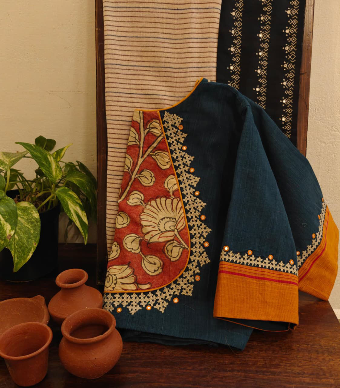 A deep, intense indigo — naturally dyed on soft khadi. Paired with a red Kalamkari yoke, hand-painted in traditional artistry. The neckline is highlighted with Kutchi embroidery in ivory, adding quiet strength and stunning detail. ✨ Earthy. Rooted. Artisanal. A Svasa signature that speaks without trying.