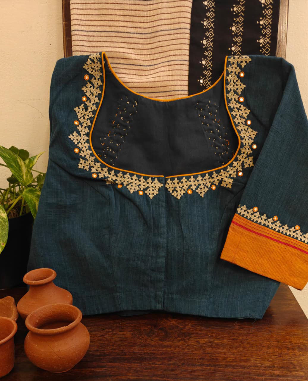Our artisans creatively hand embroider, hand paint and hand print the blouses that come to you from the design house of SVASA. We use hand woven fabric extensively. You may notice very minute, almost insignificant flaws in the crafts since they are all handmade. We urge our patrons to overlook a few human errors that may have occurred in the process. Our aspirations are towards an empowered society, focusing on keeping traditional needlecraft alive for a long time to come.