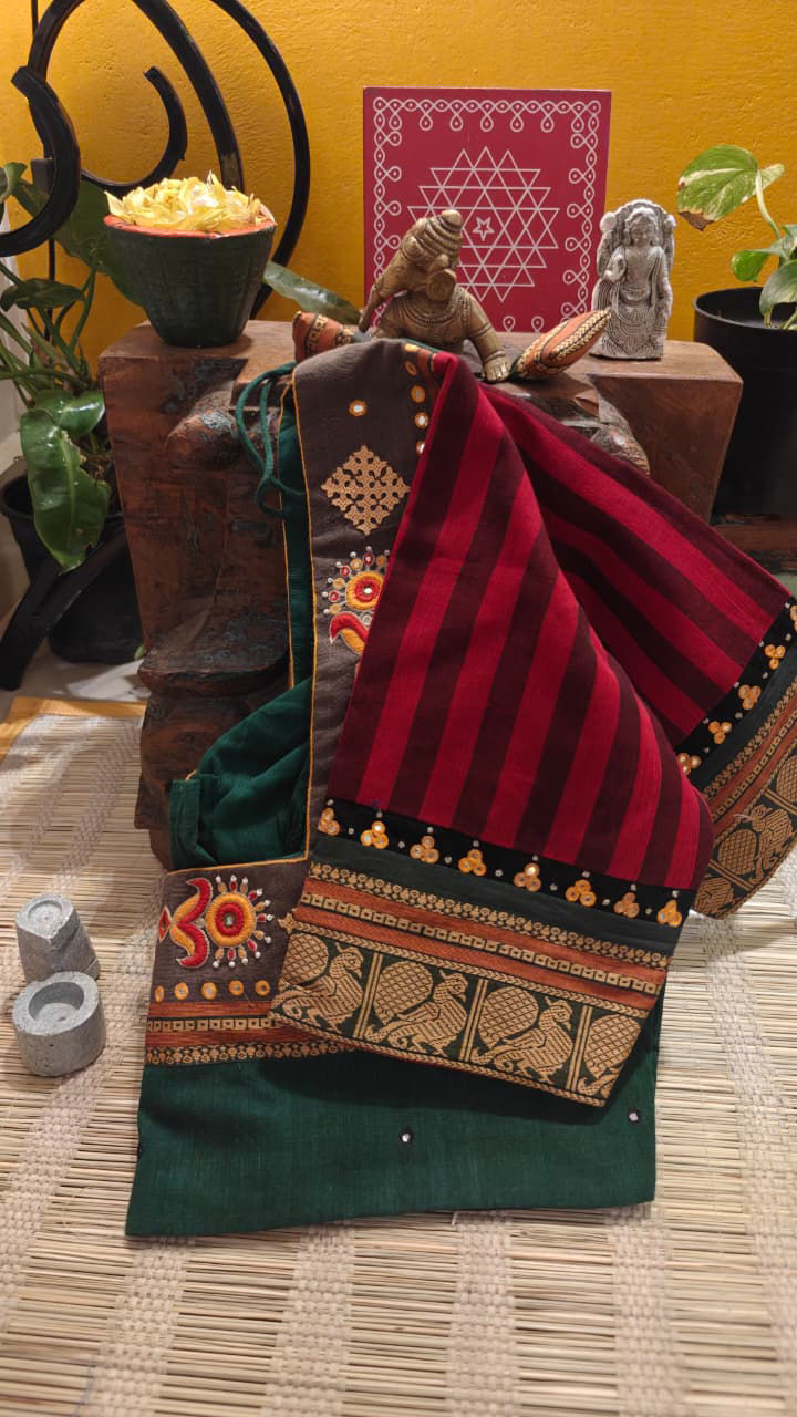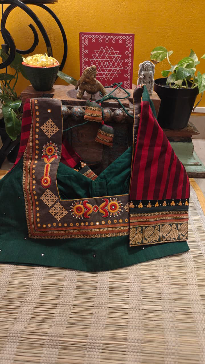 Our artisans creatively hand embroider, hand paint and hand print the blouses that come to you from the design house of SVASA. We use hand woven fabric extensively. You may notice very minute, almost insignificant flaws in the crafts since they are all handmade. We urge our patrons to overlook a few human errors that may have occurred in the process. Our aspirations are towards an empowered society, focusing on keeping traditional needlecraft alive for a long time to come.