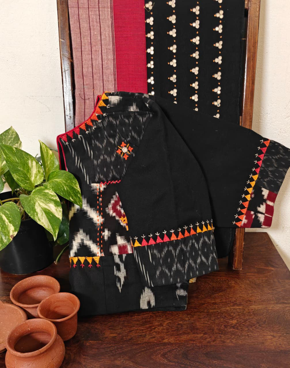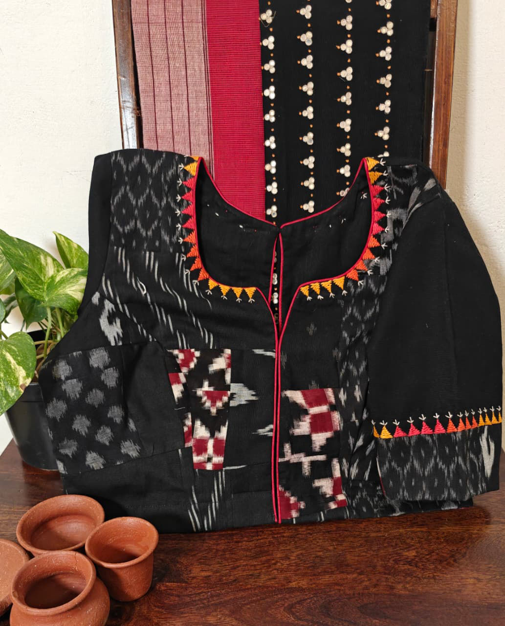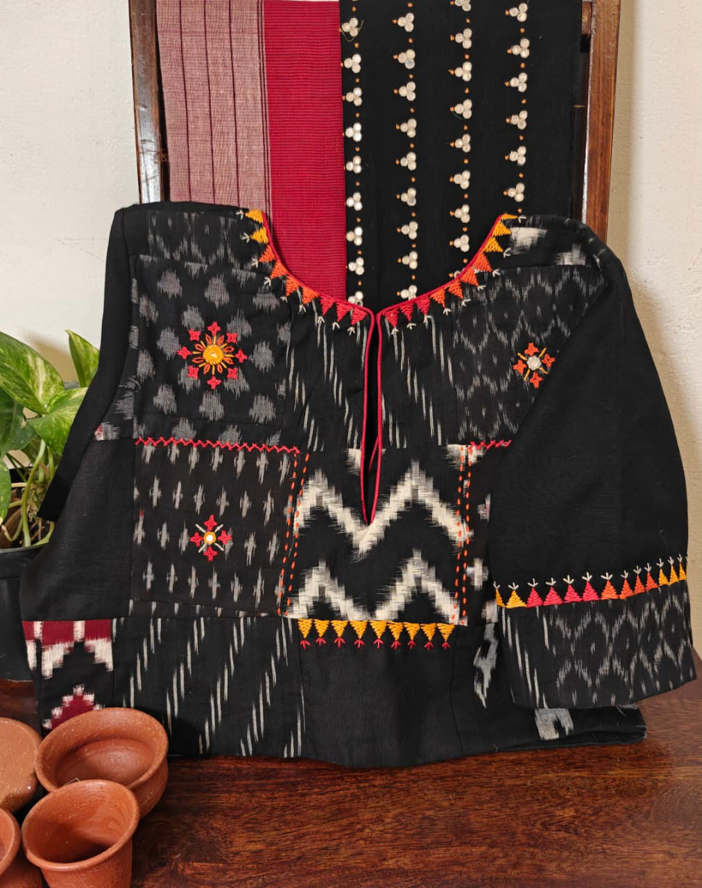 Patches of ikkat in charcoal and ivory, sewn together and brought alive with abstract embroidery — a blouse born from sustainability and timeless style. 🌿🪡