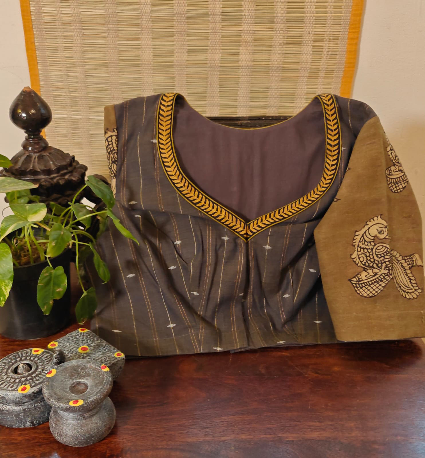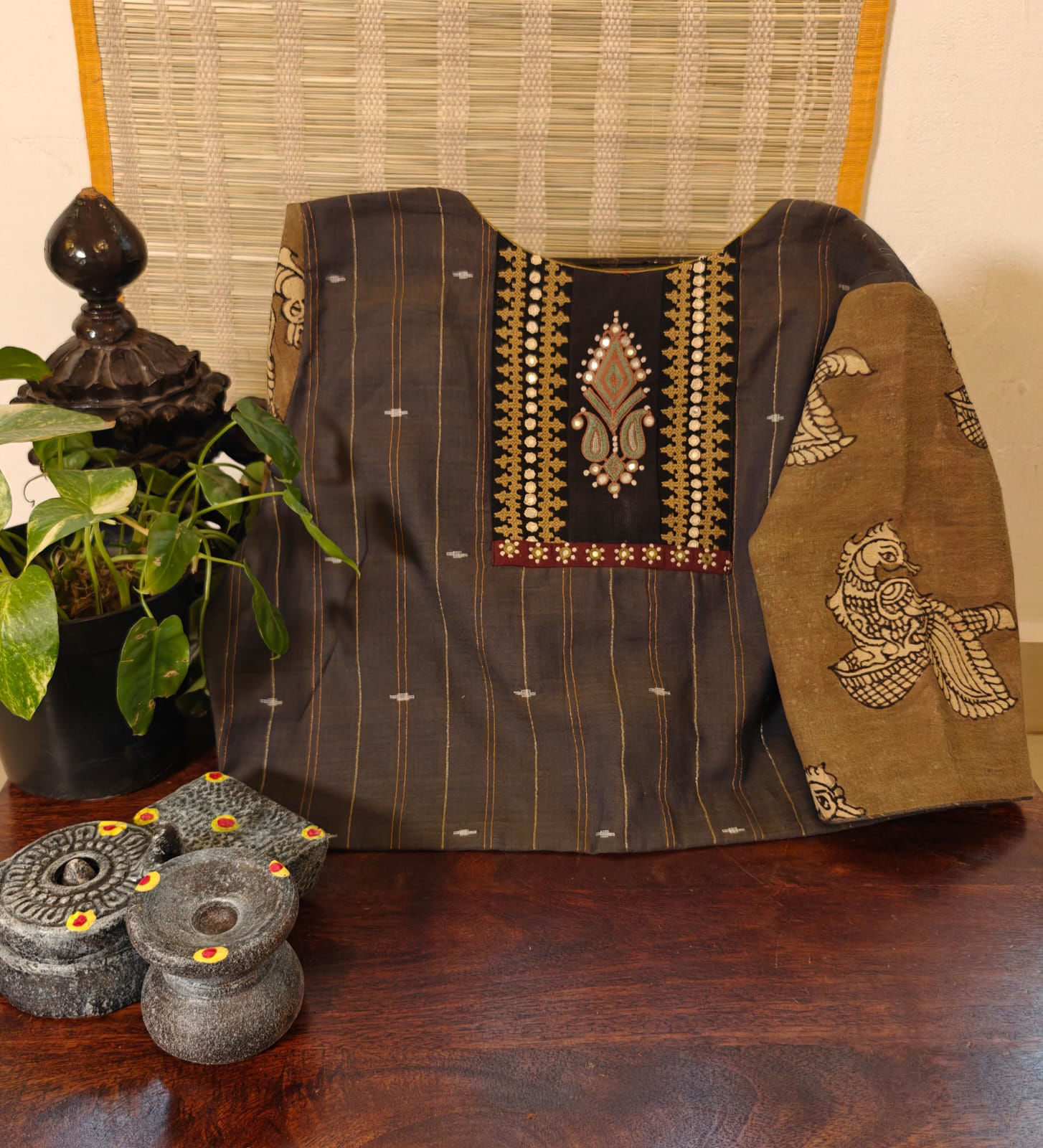 A snuff brown cotton handloom base carries an Unusual Annam from our Mithra creation. annam motifs bloom on handcrafted Kalamkari sleeves in olive and olive green hues. A charcoal yoke is outlined with Kutchi embroidery and tiny mirrors, stitched by in-house makers at Svasa Studio. The designs fuse tradition with modern intent—every loop, motif, and border narrates the Svasa way.