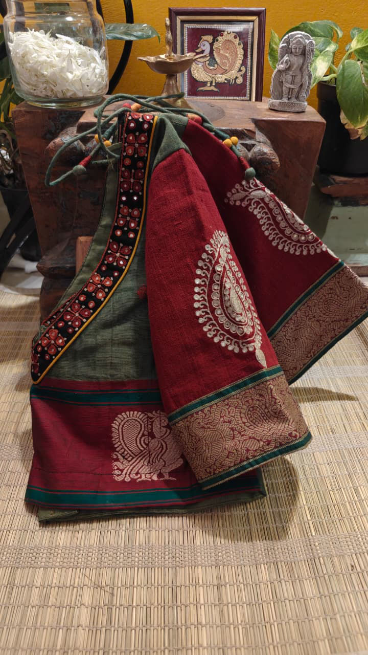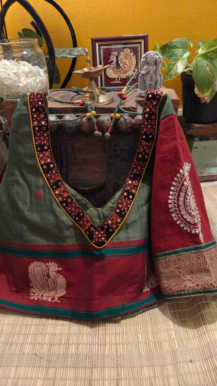 A classic Kanchi cotton woven with graceful annam motifs, grounded in heritage and quiet detail. Framed with bold tribal borders, the weave finds a beautiful contrast—refined yet earthy, structured yet free. A piece where tradition holds steady, and every thread carries a story forward.