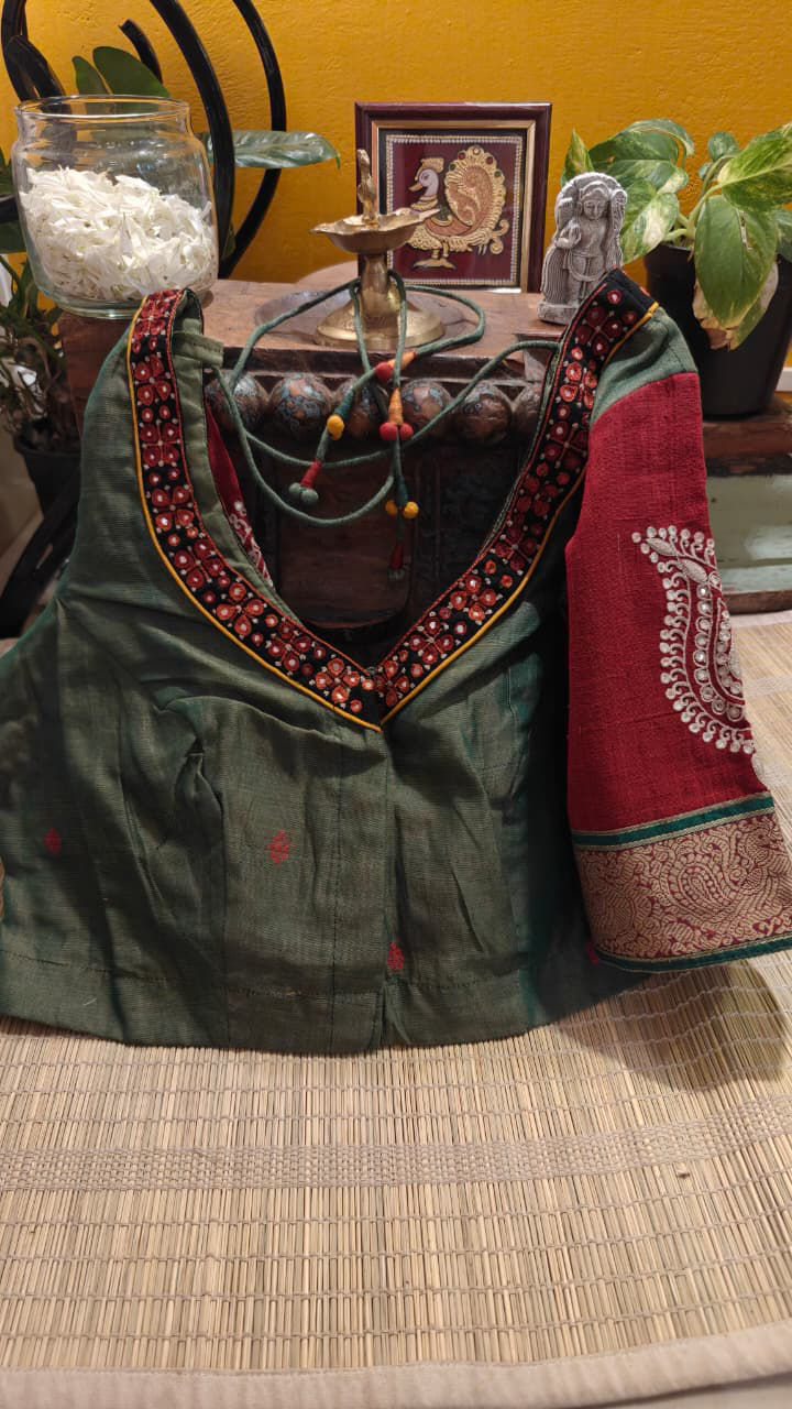 Our artisans creatively hand embroider, hand paint and hand print the blouses that come to you from the design house of SVASA. We use hand woven fabric extensively. You may notice very minute, almost insignificant flaws in the crafts since they are all handmade. We urge our patrons to overlook a few human errors that may have occurred in the process. Our aspirations are towards an empowered society, focusing on keeping traditional needlecraft alive for a long time to come.