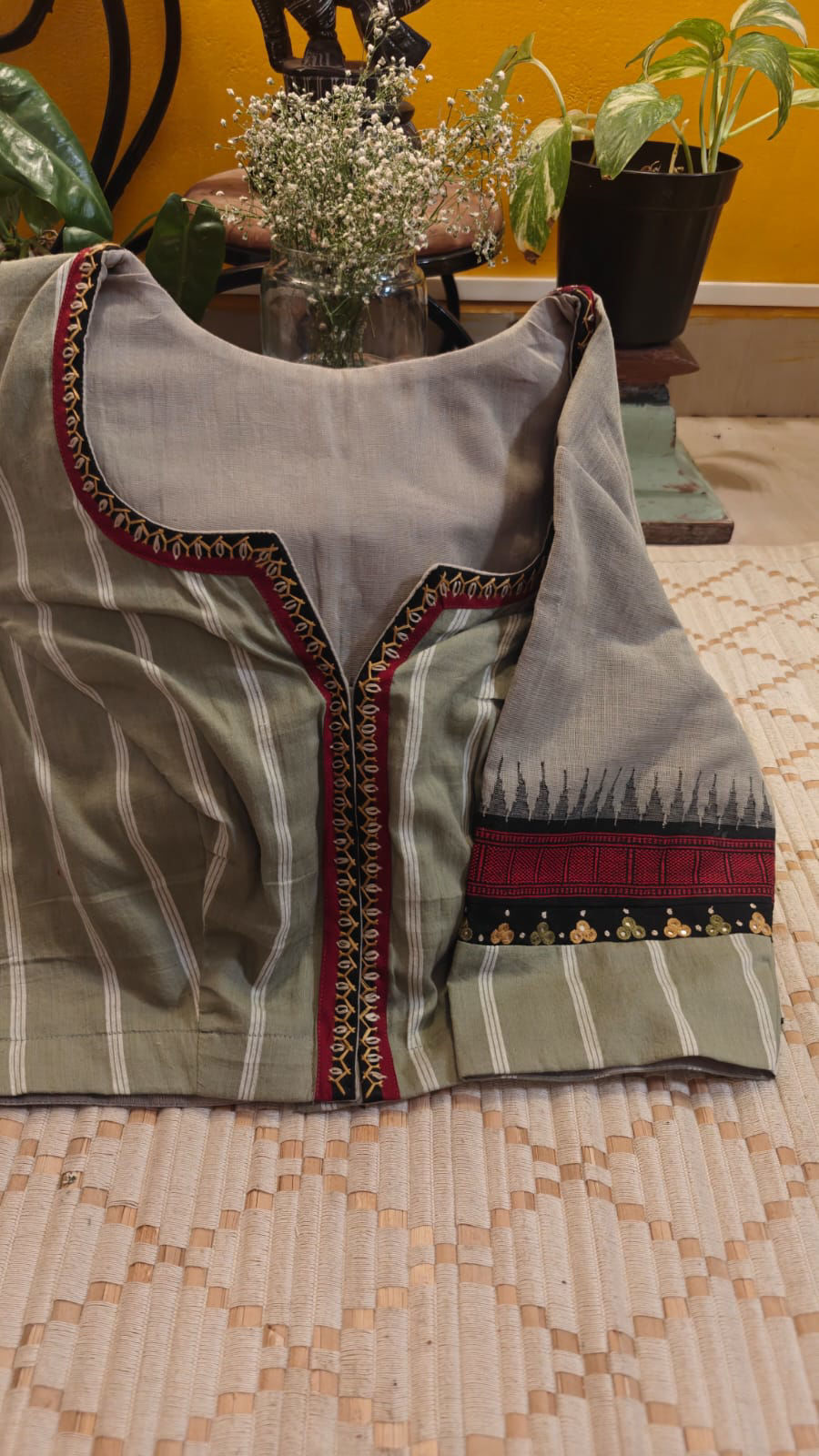 Our artisans creatively hand embroider, hand paint and hand print the blouses that come to you from the design house of SVASA. We use hand woven fabric extensively. You may notice very minute, almost insignificant flaws in the crafts since they are all handmade. We urge our patrons to overlook a few human errors that may have occurred in the process. Our aspirations are towards an empowered society, focusing on keeping traditional needlecraft alive for a long time to come.