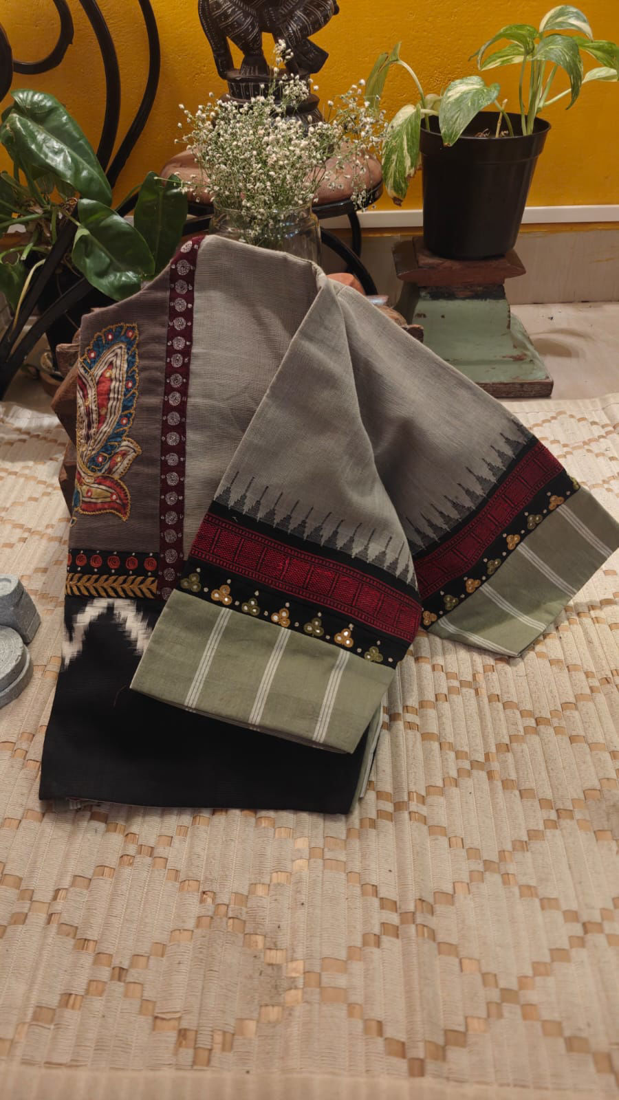 An annam takes form through Kalamkari, appliquéd onto an ikkat base—where two traditions meet in quiet harmony. The fluidity of the motif against the rhythm of the weave creates a piece that feels layered, rooted, and richly expressive. A beautiful coming together of craft, story, and detail.