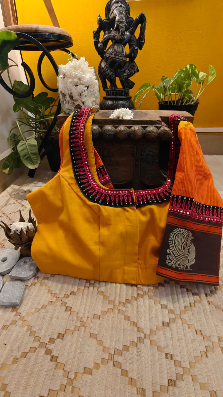 Our artisans creatively hand embroider, hand paint and hand print the blouses that come to you from the design house of SVASA. We use hand woven fabric extensively. You may notice very minute, almost insignificant flaws in the crafts since they are all handmade. We urge our patrons to overlook a few human errors that may have occurred in the process. Our aspirations are towards an empowered society, focusing on keeping traditional needlecraft alive for a long time to come.